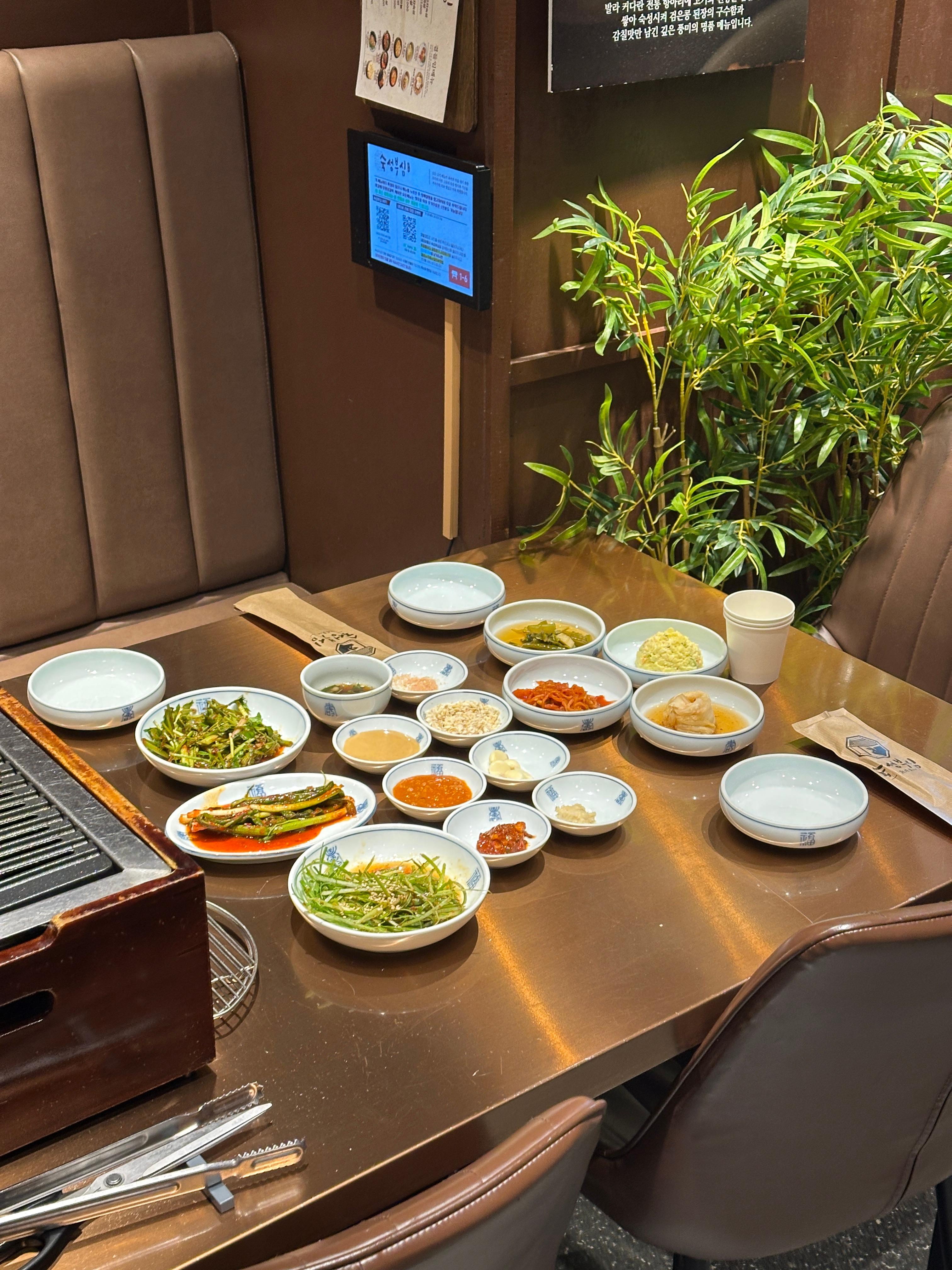 군자동 최고의 숙성돼지고기 맛집, 숙성부심의 메뉴와 주문입니다. 주문은 키오스크로 하고, 결제는 나갈때 하시면 됩니다. 테이블 세팅도 여전히 푸짐하게 잘 해주시네요. ㅋㅋ 물론 쌈채소를 부탁드려야 주신다는 건 좀 바뀌었네요. 예전에는 익힌 양배추도 있었던거 같은데 뭔가 좀 바뀌긴 했네요 ㅎㅎ