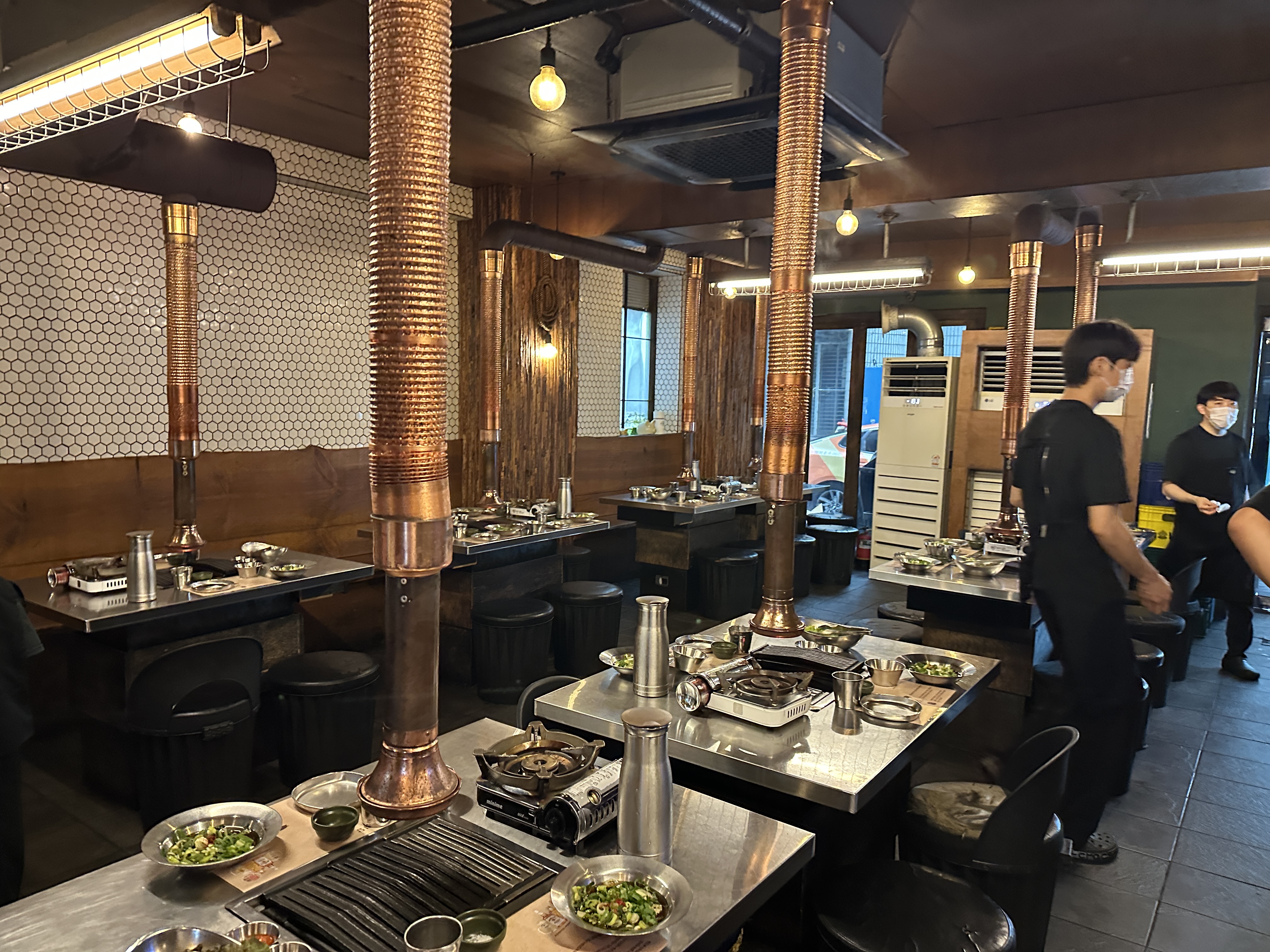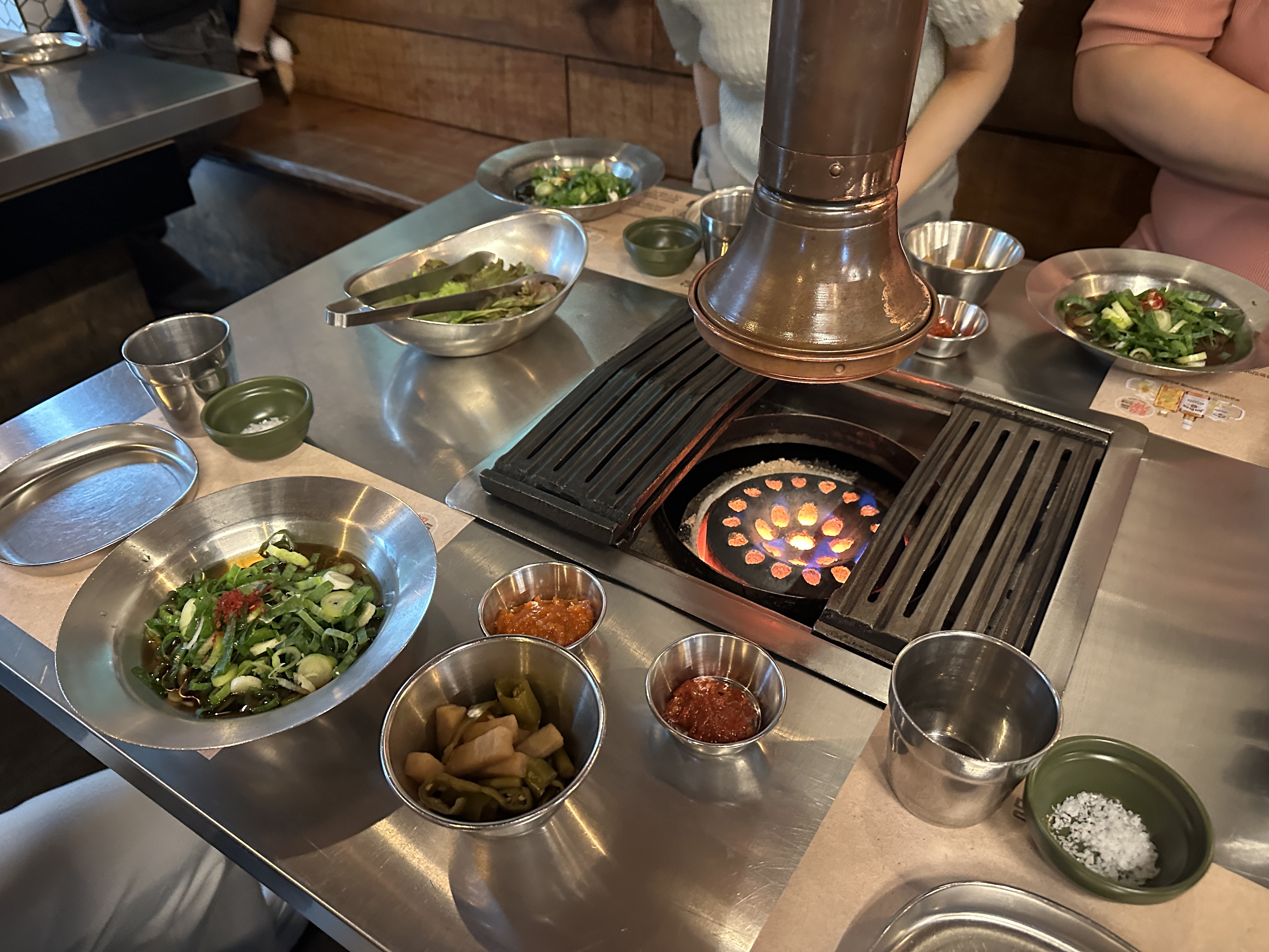테이블에 앉으니 이미 연탄불이 세팅되어 있네요. 숯불이 기본인데 요새 연탄이라니 독특합니다. 테이블 세팅도 잔잔하고 필수적인 녀석들만 얹어져 있습니다.