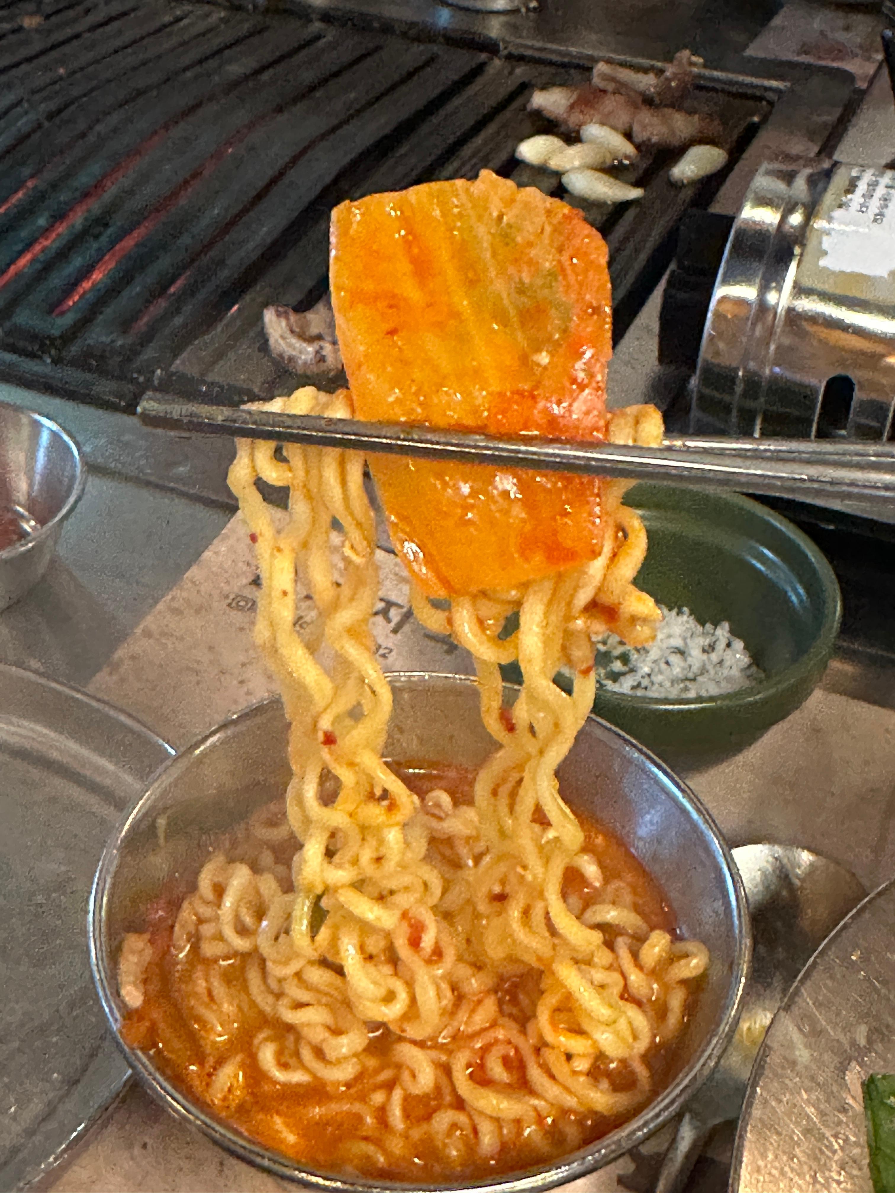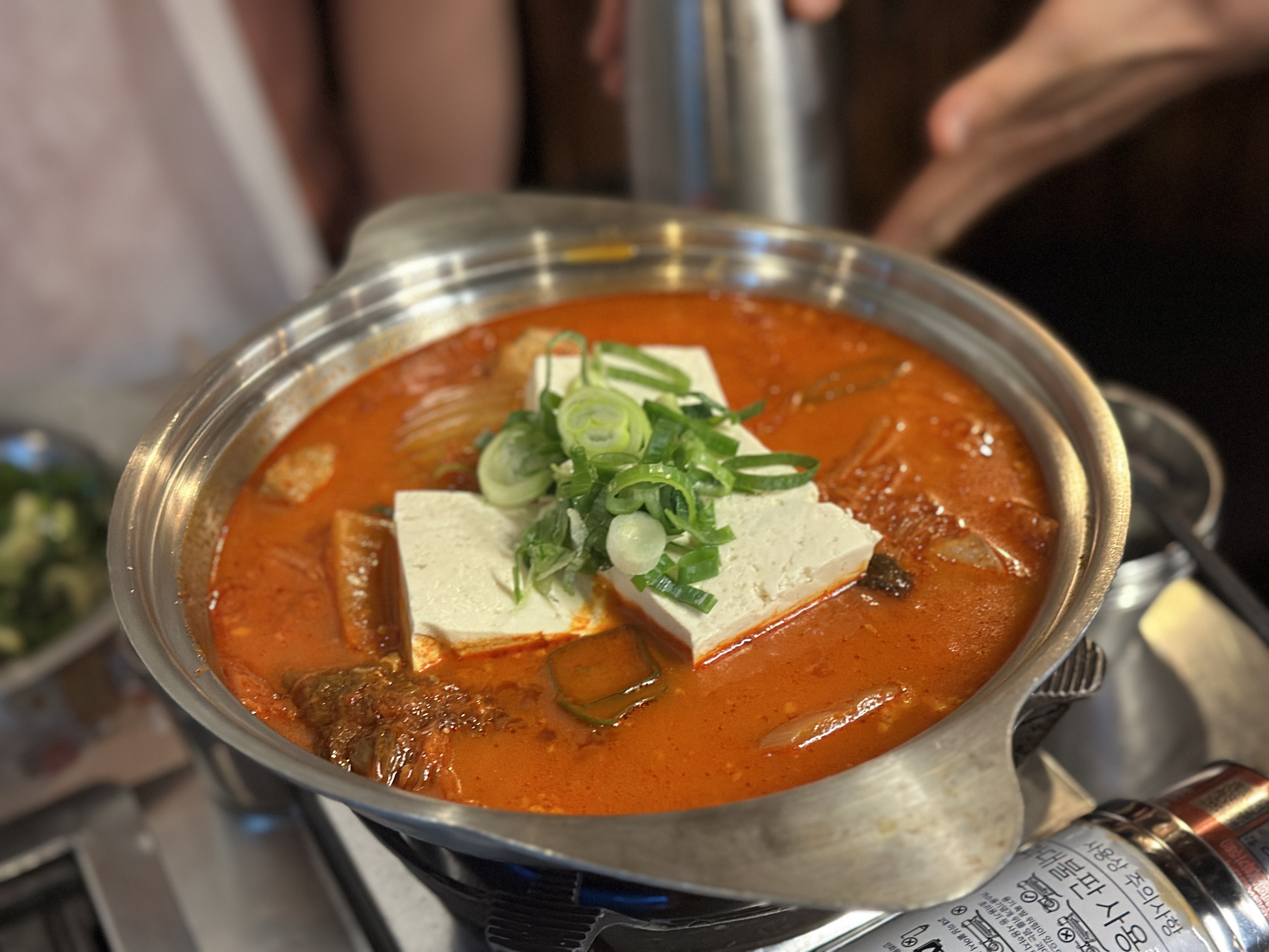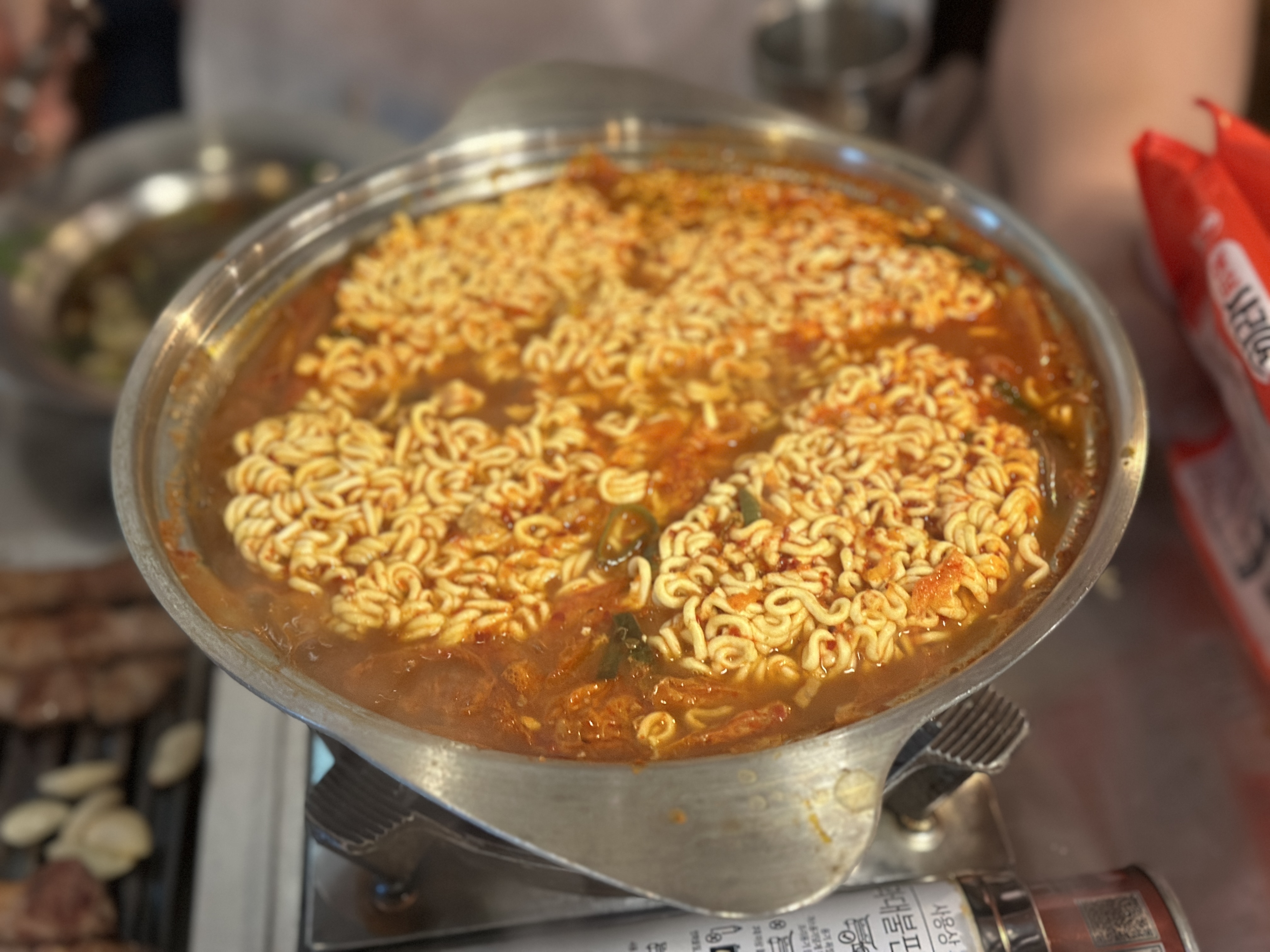신당동 금돼지식당의 또 한가지 대표메뉴인 통돼지 김치찌개입니다. 저희는 어느정도 먹고 육수 추가 후 라면사리 두개를 넣었습니다. 기본적으로 육수를 내기 위해 오랜시간 끓여서 이미 1차적으로 요리를 한 다음에 나와서 바로 끓기만 해도 맛이 깊습니다. 라면사리는 꼭 넣어 드시구요.ㅋㅋㅋ 건데기도 푸짐하고 맛있습니다.
