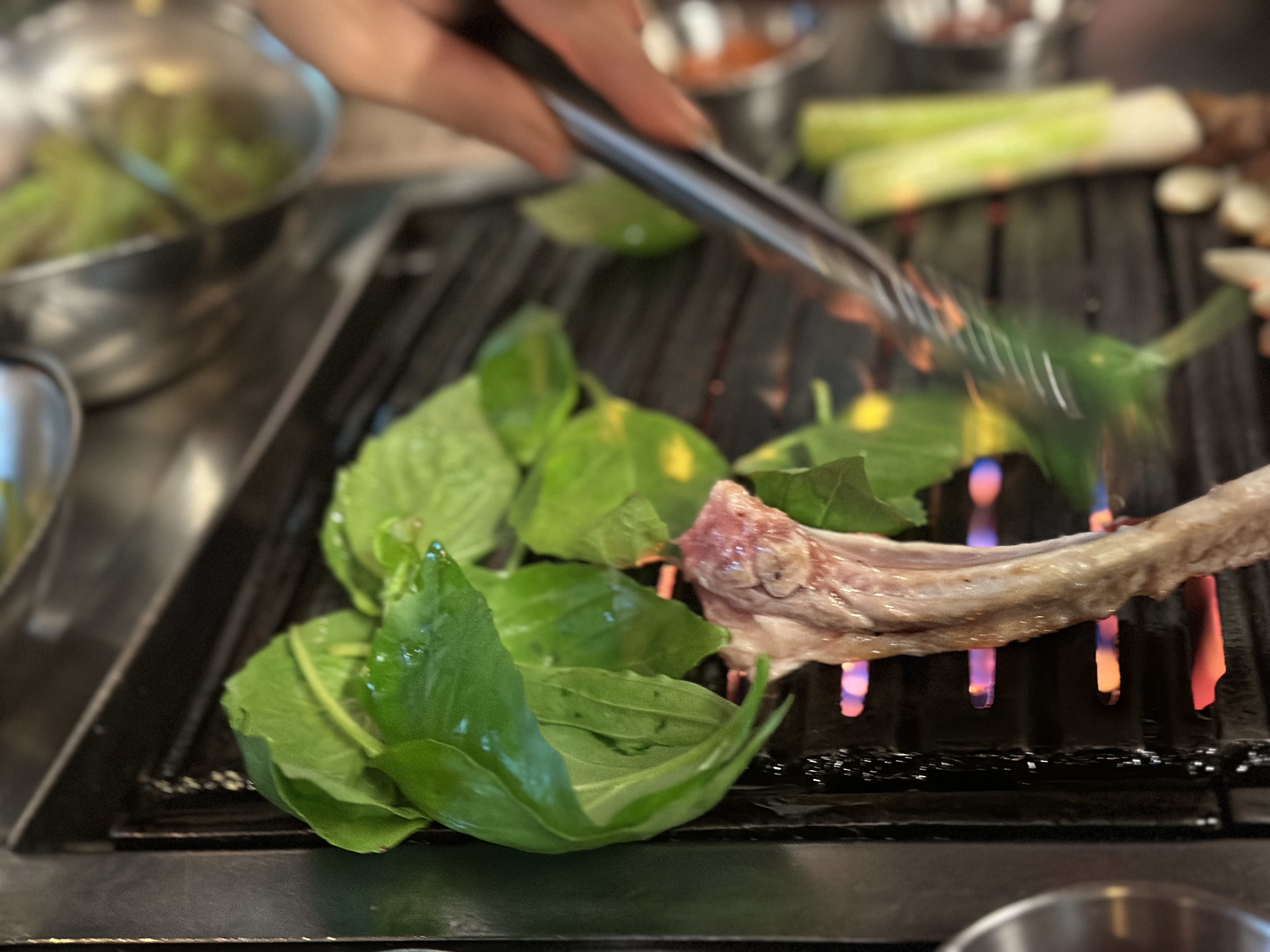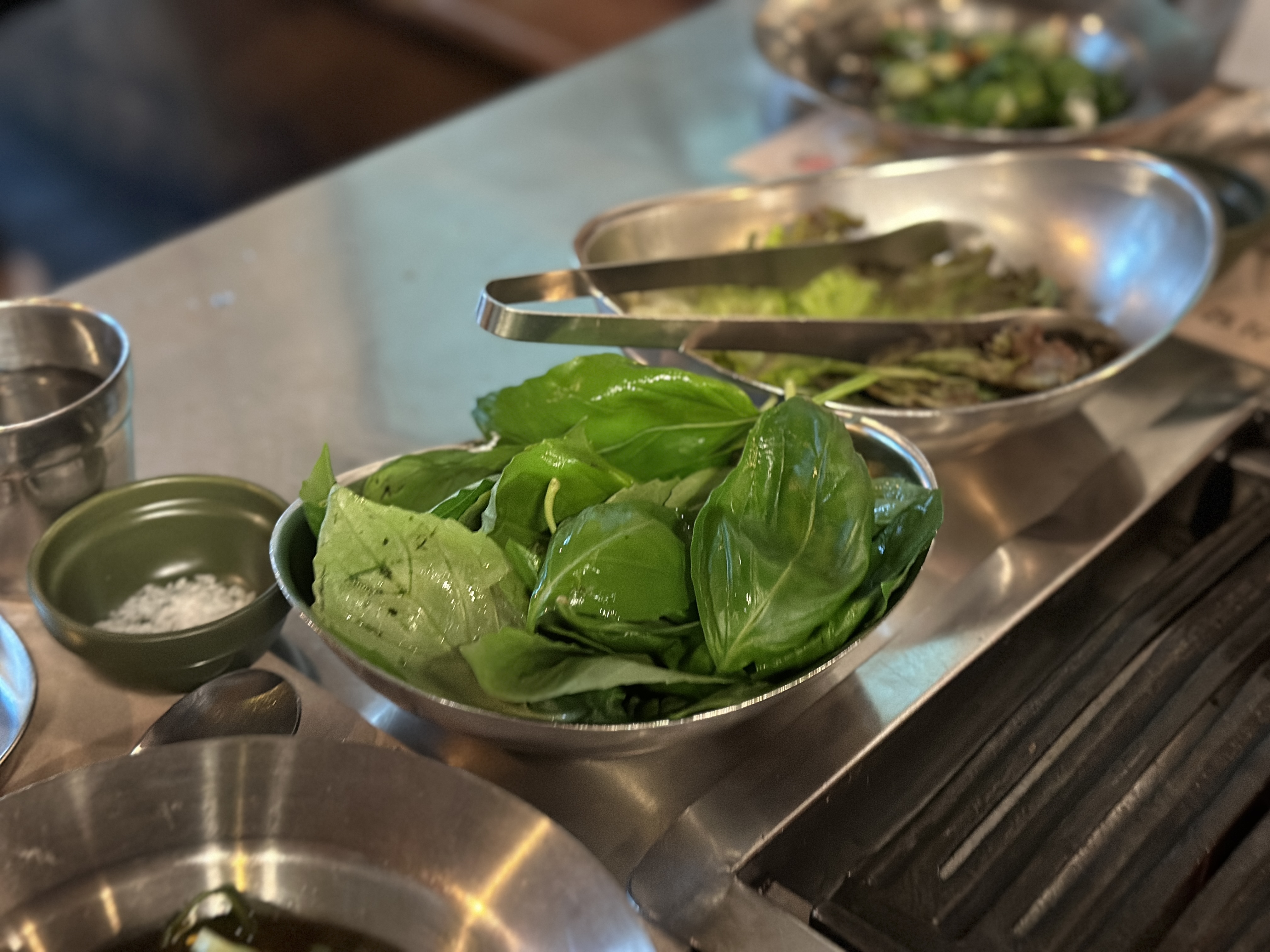 신당동 금돼지식당의 시그니쳐인 바질쌈입니다. 중간에 고기 한타임 굽고 바질을 가볍게 구워봤는데 이게 진짜 별미입니다. 향긋한 바질향이 단독으로 먹으면 감흥이 없는데 삼겹살과 결합되면 이게 미칩니다. ㅋㅋㅋ 솔직히 인정.
