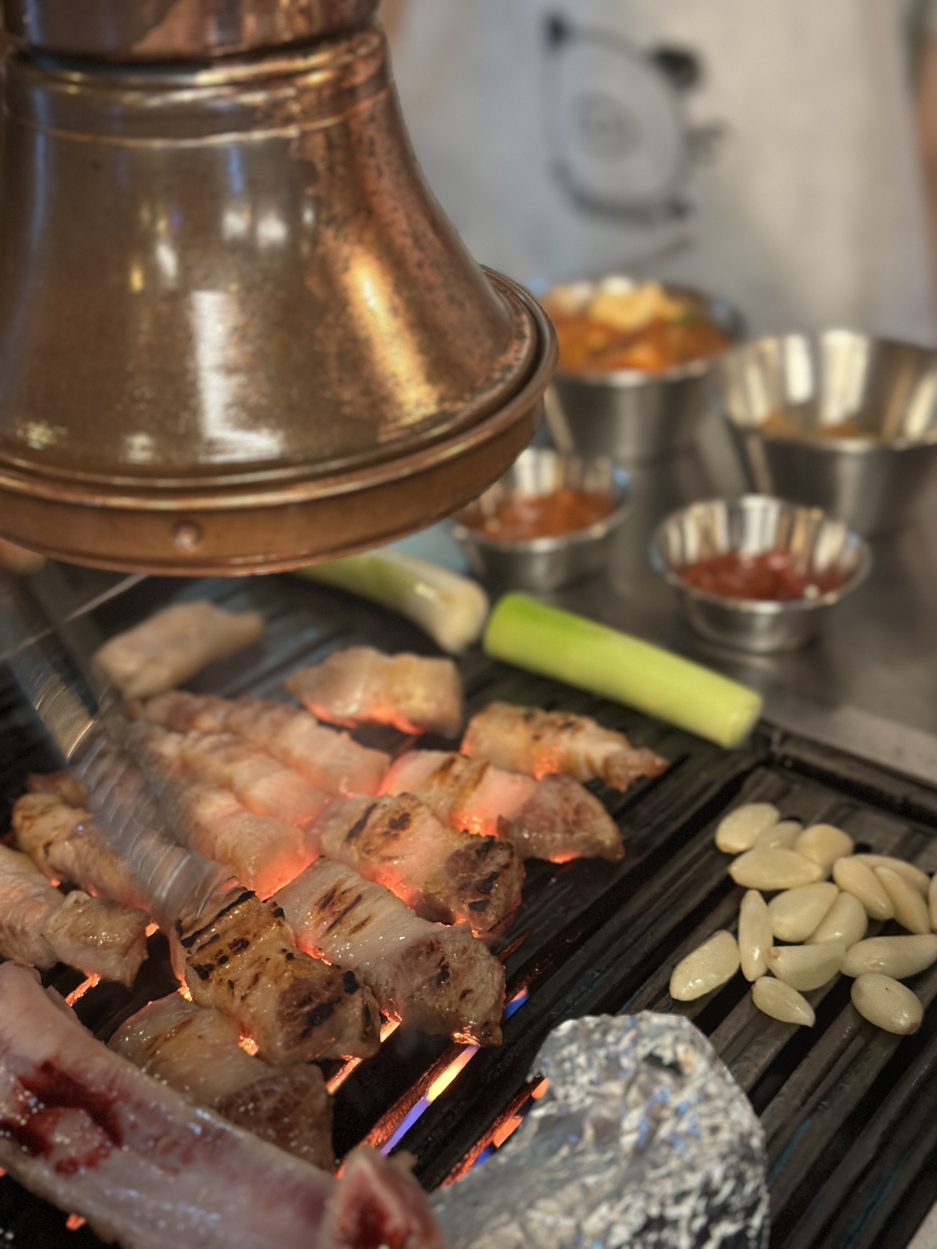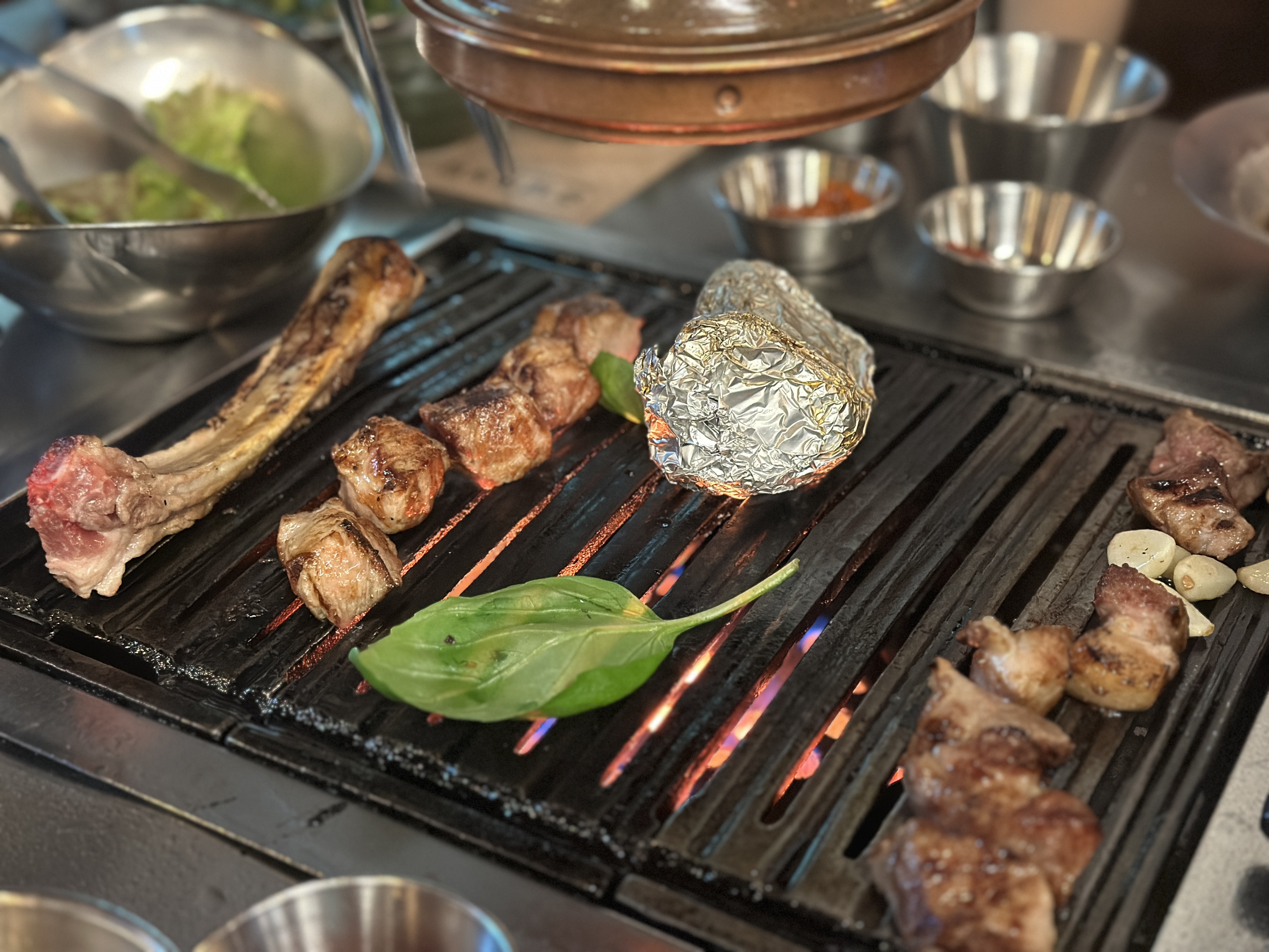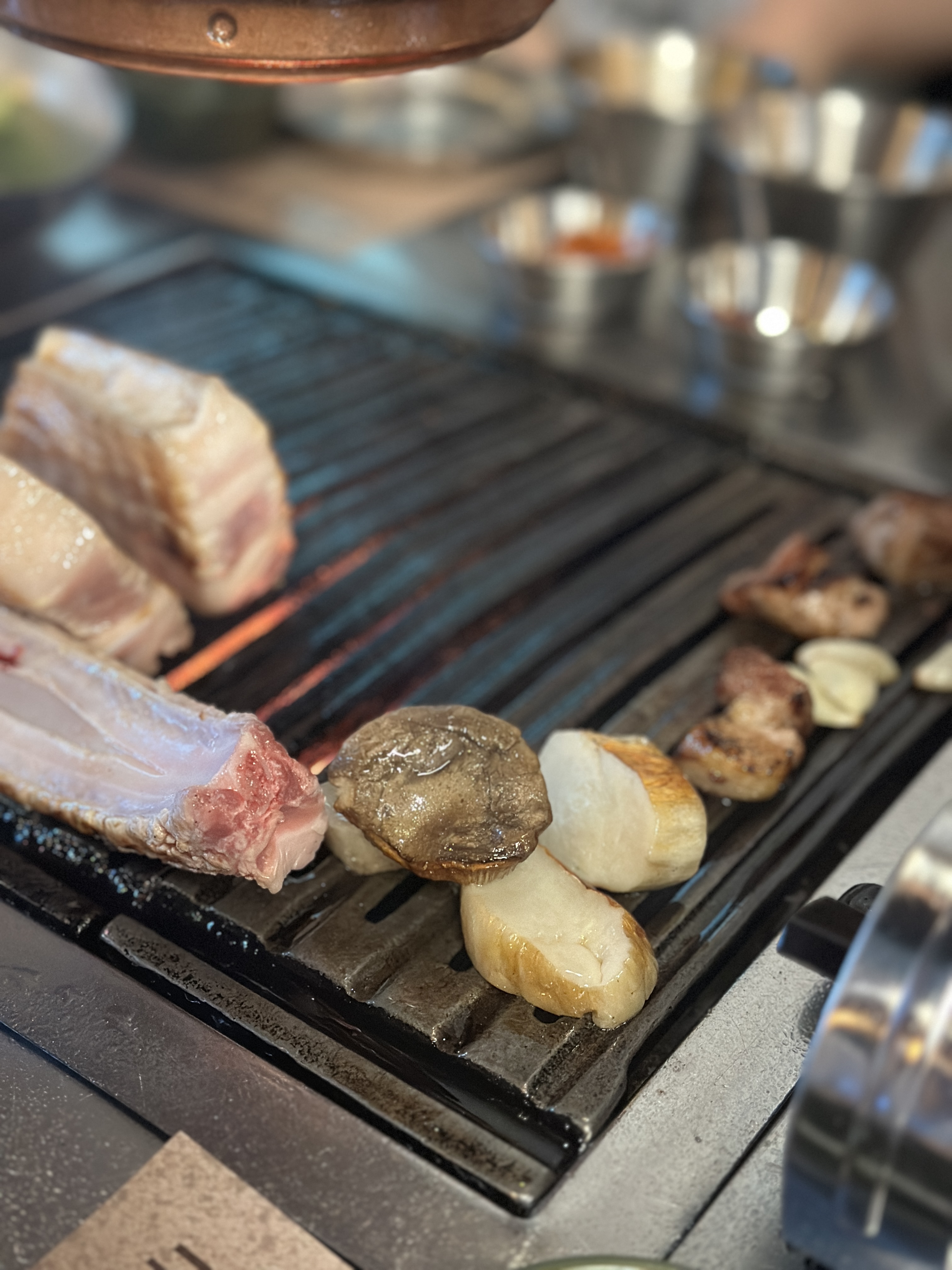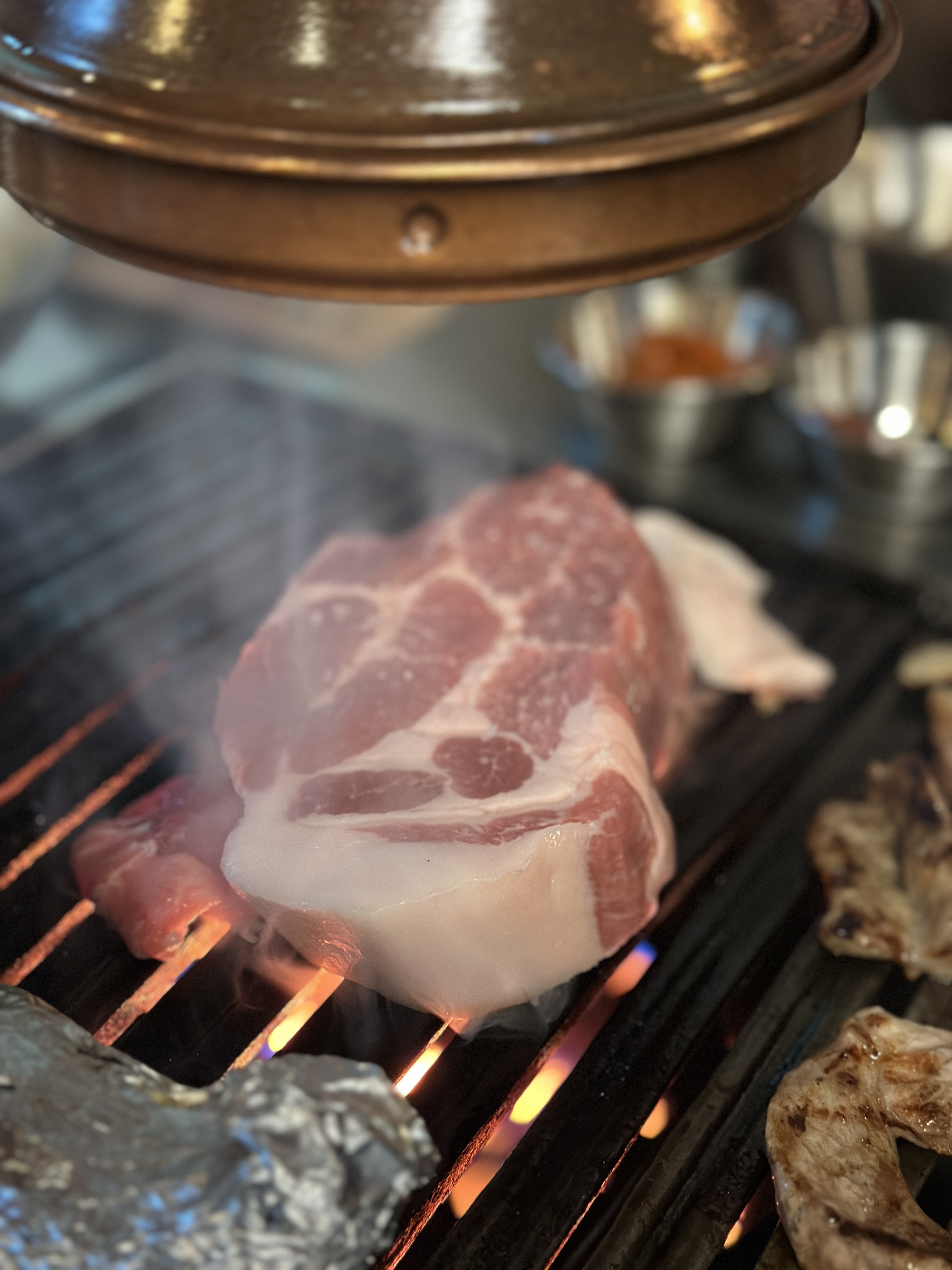 앉자마자 주문한 등목살과 본삼겹살 총 4인분입니다. 대파, 마늘, 은박지로 싼 버섯이 등장합니다. 바질과 김치찌개도 같이 주문했어요.