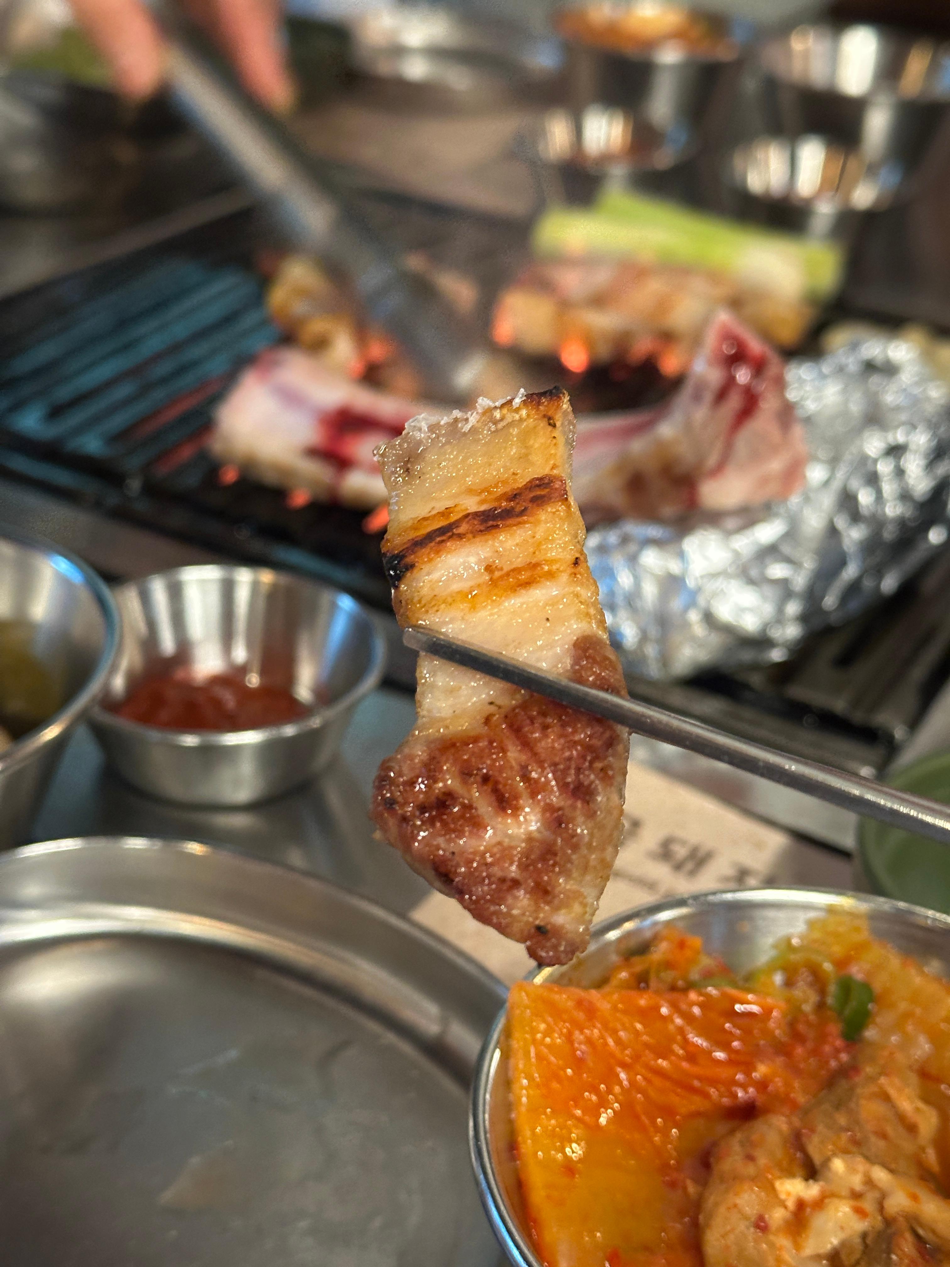 처음 구워주신 고기는 바로 본삼겹살입니다. 직원분이 한 분당 두 테이블을 구워주시는데, 정말 맛있게 구워주셔서 맛있게 먹을 수 있습니다. 역시 전문가의 손길을 즐기는 데 이유가 있네요.