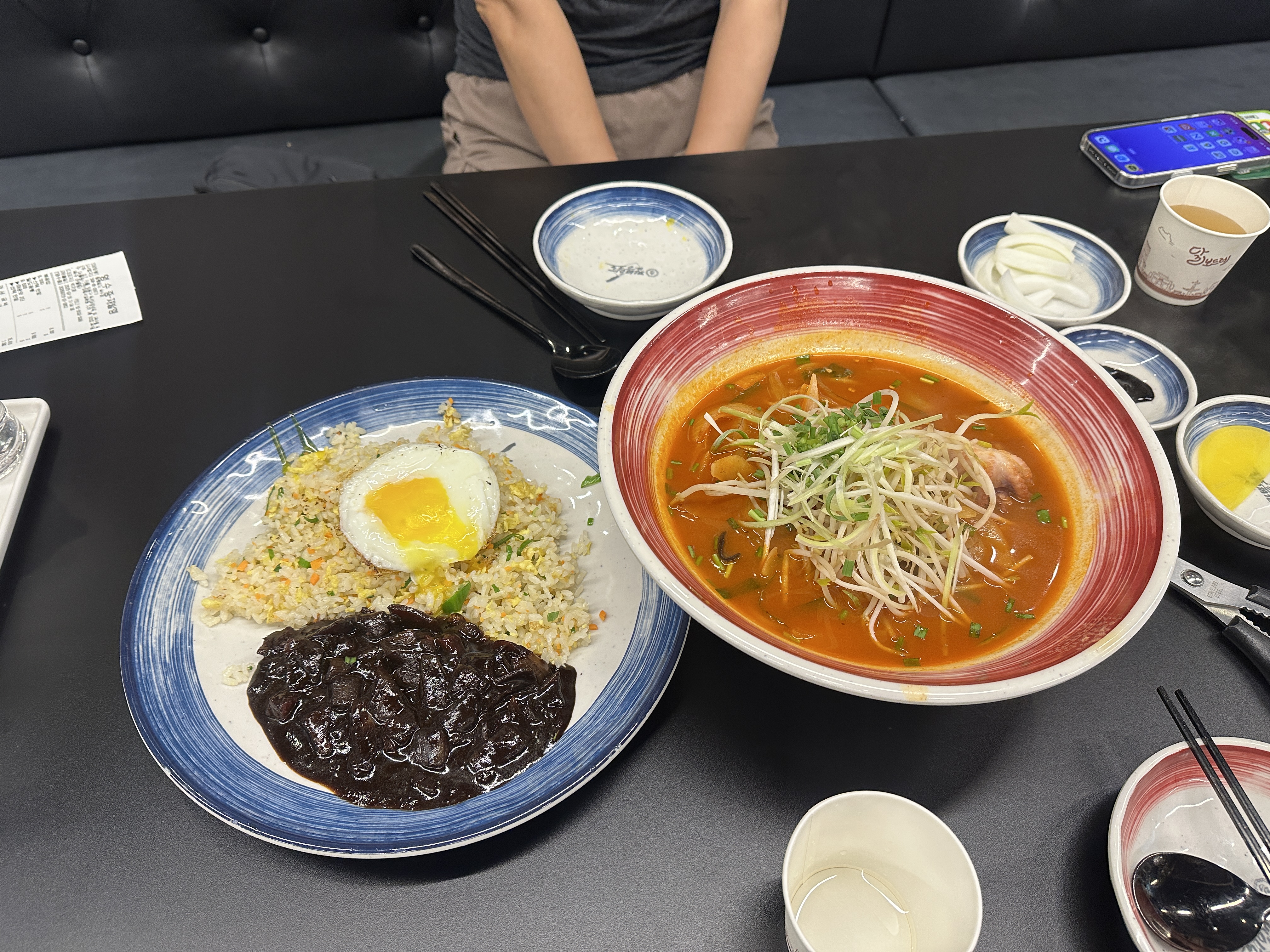 이번 방문은 그동안 먹었던 메뉴들 중에서 가장 무난하고 좋았던 짬뽕과 볶음밥을 주문합니다. 기본 메뉴가 맛있으면 일단 합격이니말이죠.ㅋㅋㅋ 테이블 세팅도 간단합니다. 양파, 단무지 그리고 춘장.ㅋㅋㅋㅋ