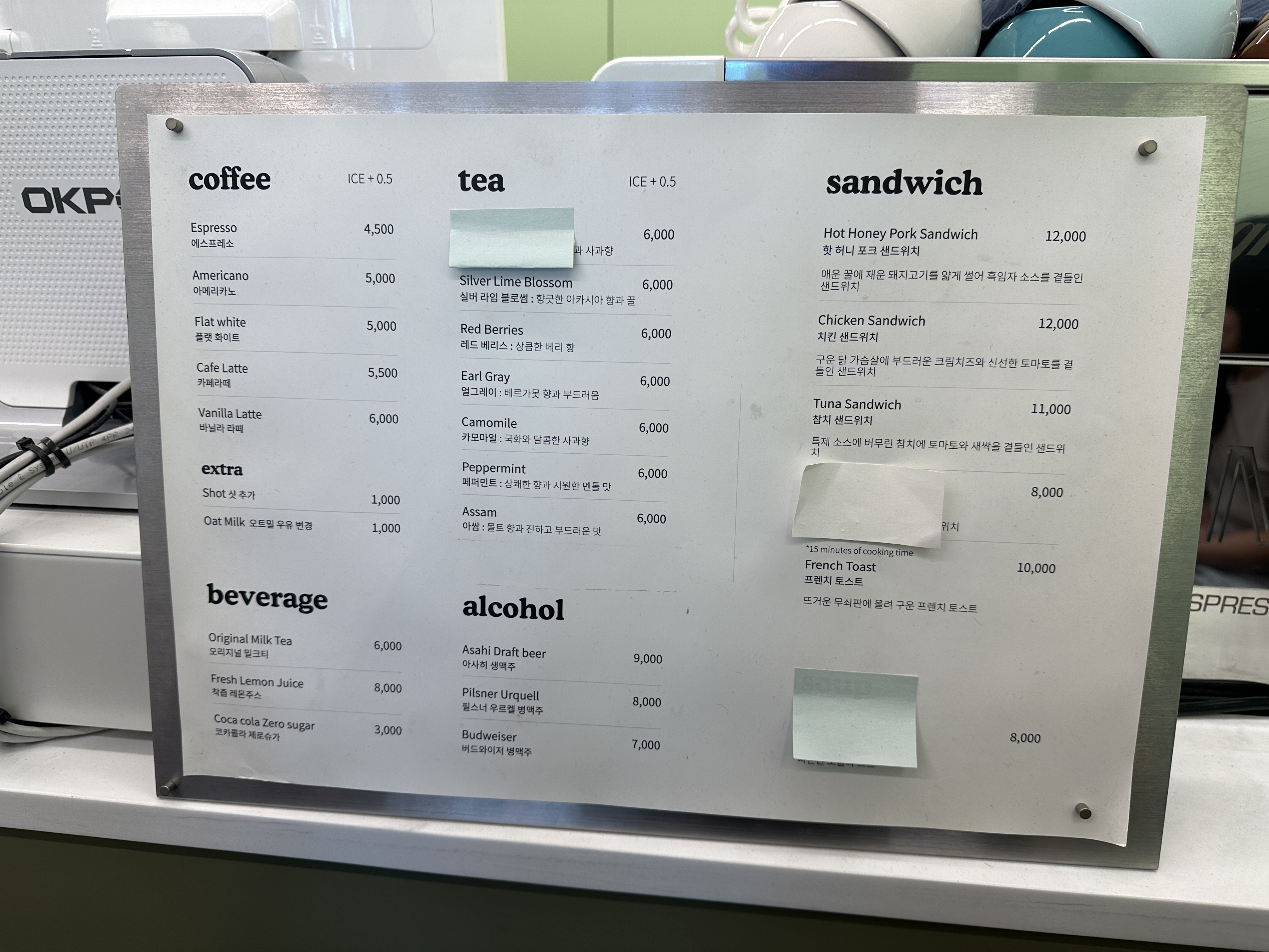C플라밍고(Cflamingo) 베이커리의 메뉴판입니다. 음료 2잔과 샌드위치를 주문했고, 지금 보니 케잌이 유명한가봐요.