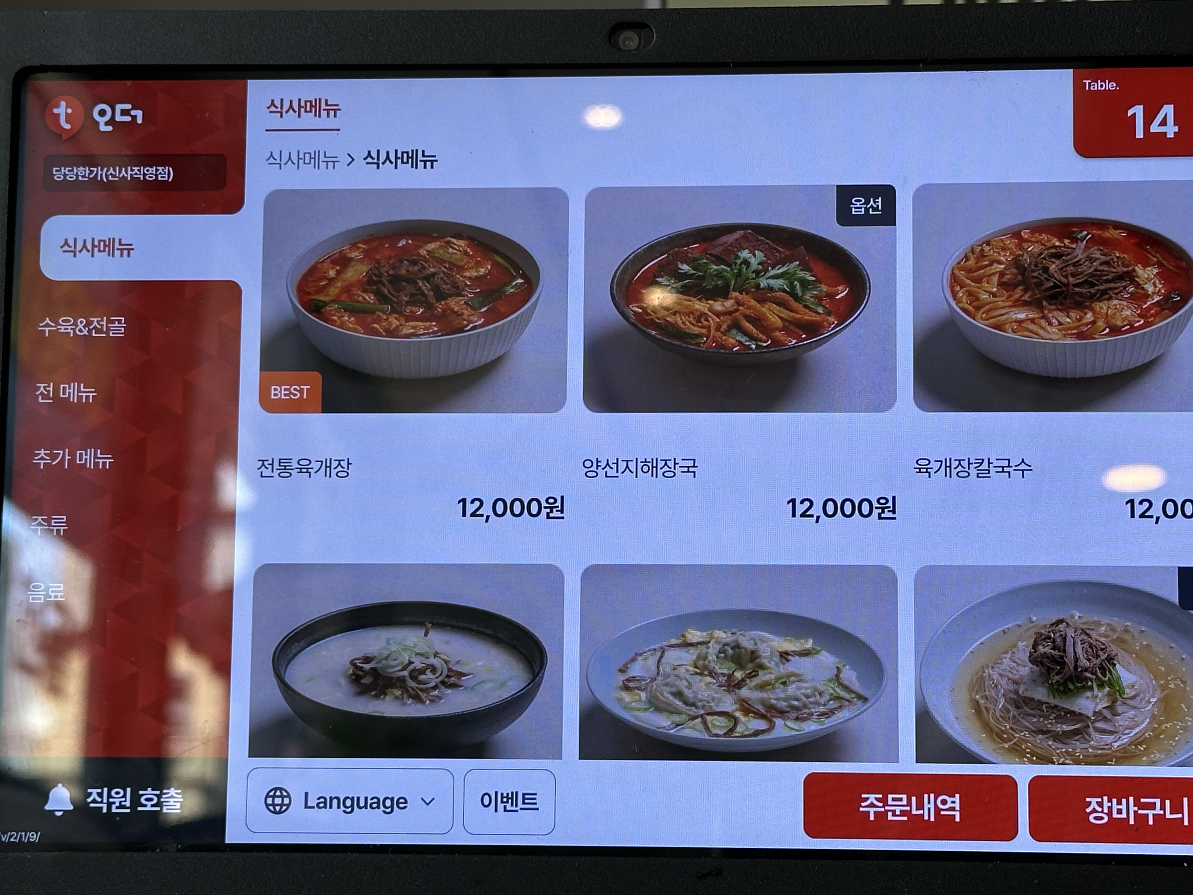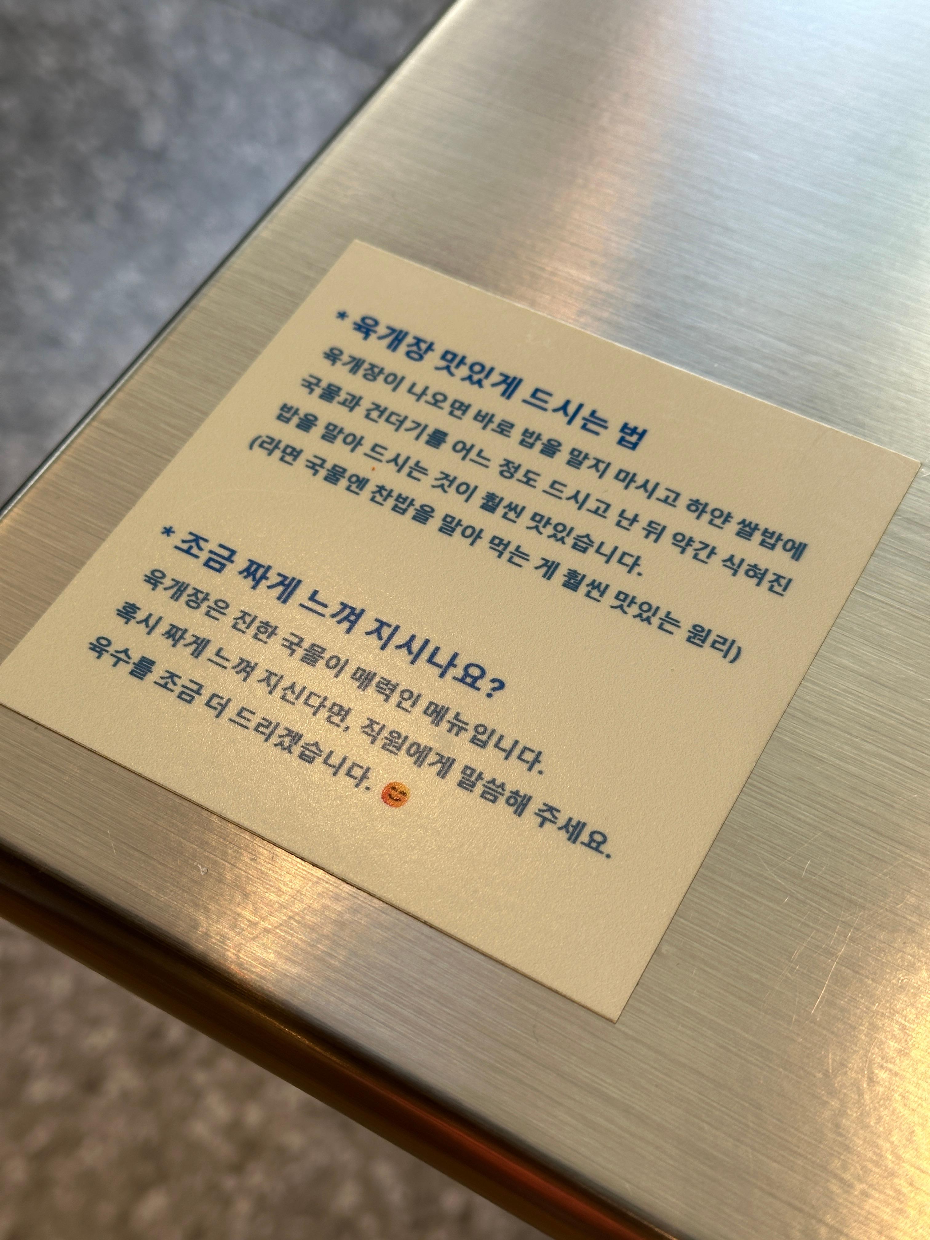 당당한가 신사직영점의 주문은 키오스크로 하고, 결제는 나가면서 합니다. 육개장이 땡겨서 온 식당이니 육개장으로 주문합니다. 한 그릇은 육개장, 한 그릇은 육개장칼국수로 했어요. ㅋㅋㅋ 맛있게 먹는 법도 있으니 참고하시구요
