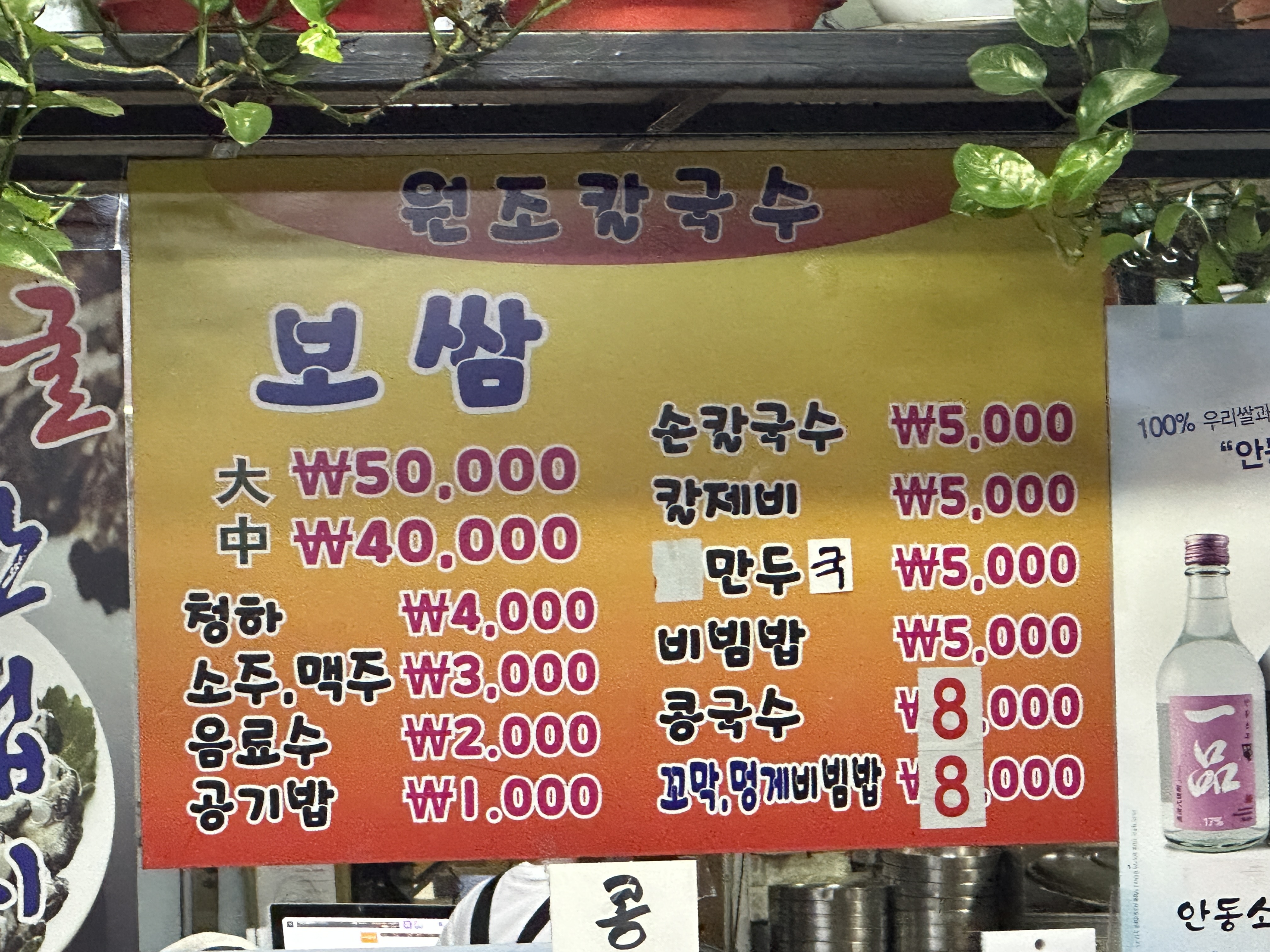 김경자 원조손칼국수보쌈 메뉴판을 보고 사실 좀 놀랐습니다. 보쌈은 사실 가성비라고보긴 어렵지만, 청하4천원, 소주/맥주3천원...?ㅋㅋㅋㅋ 그리고 오른쪽 줄을 보니 식사류가 5천원이라니????? ㅋㅋㅋㅋ 이거 가격 맞습니까?