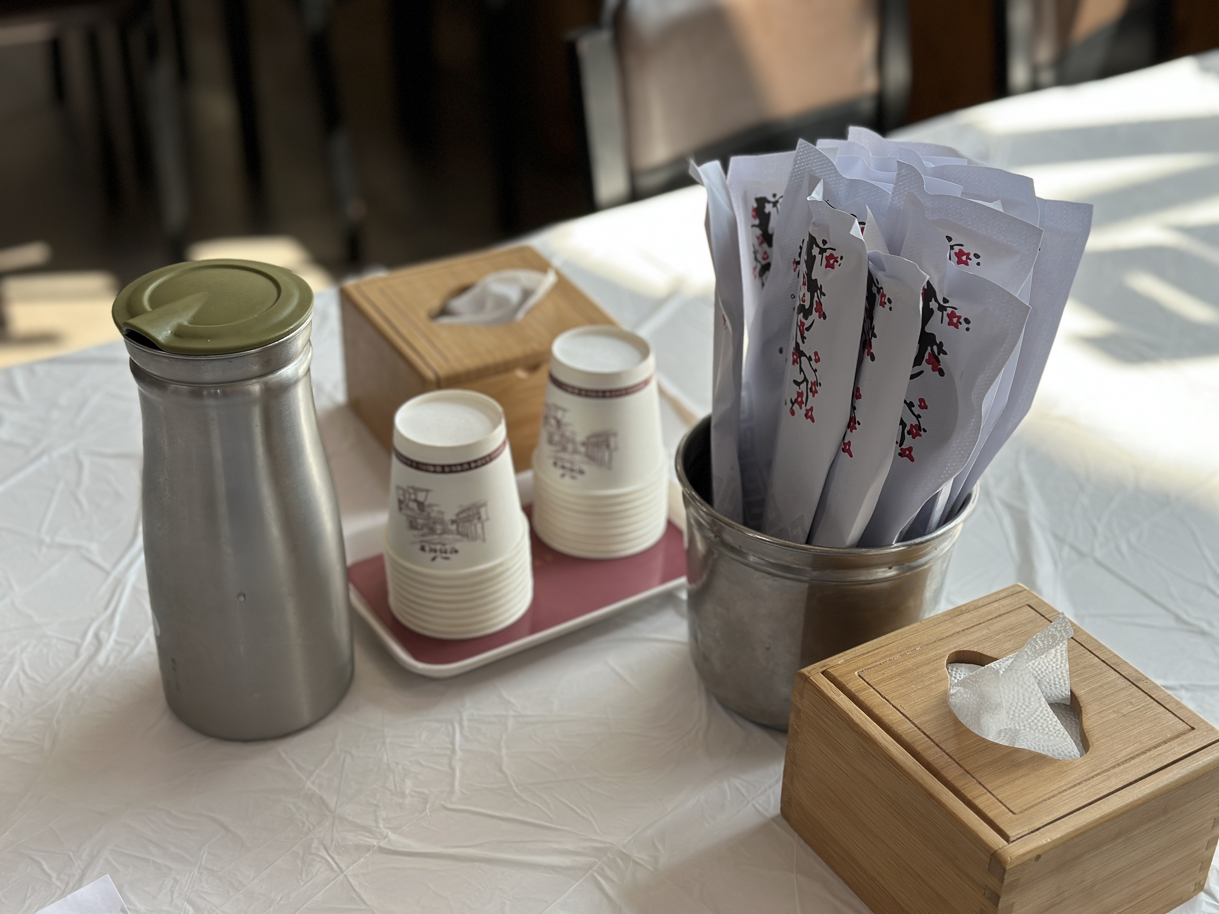 테이블은 별다른 건 없습니다. 물컵을 종이컵을 쓰시고, 수저는 종이로 포장되어 있으니 깔끔합니다.
