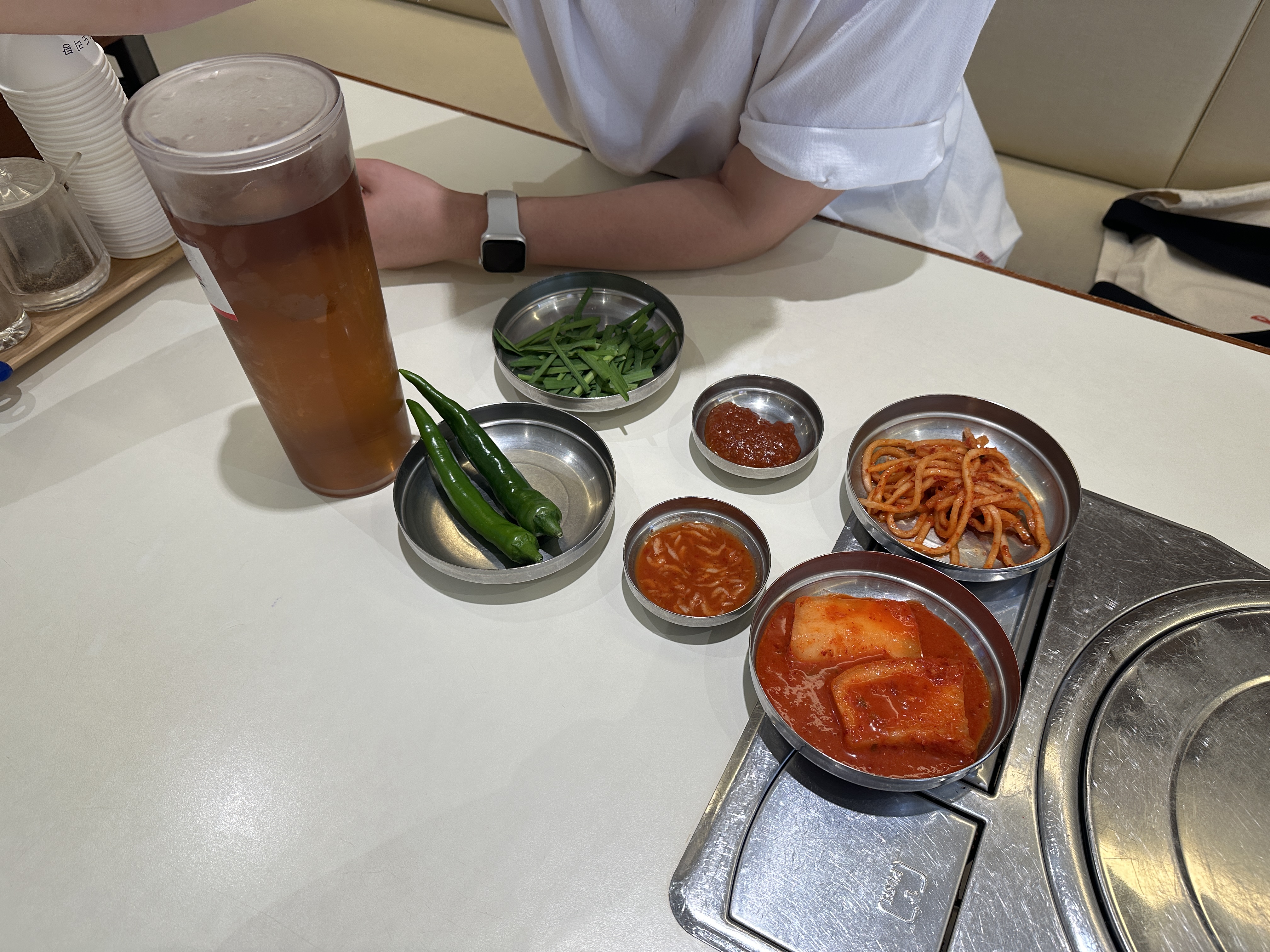 이번엔 순대국에 고추튀김이 같이 나오는 세트를 1인분 시켜서 맛보기 위해 기본 순대국과 같이 시켜봅니다. 주문을 마치니 테이블 기본 세팅을 해 주십니다. 한 켠에는 추가 반찬류도 셀프로 가져갈 수 있게 준비되어 있구요.