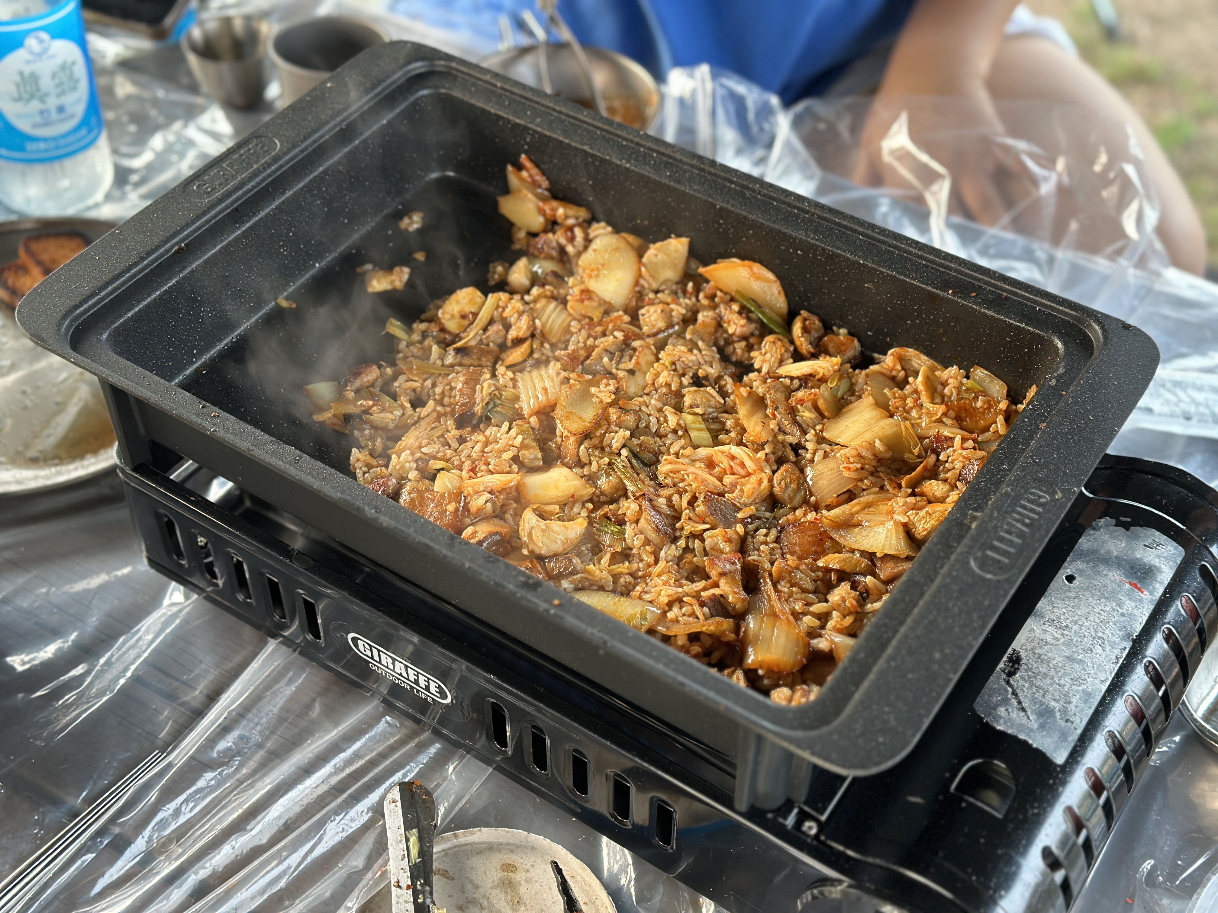 최초 세팅을 화로대에서 조금 멀게 해서, 먹기가 불편하다보니 초벌만 화로대에서 하고 마무리는 구이바다에서 깔끔하게 진행했습니다. 김치와 밥까지 야무지게 비벼먹고, 소세지까지 먹으니 배가 터질 것 같았답니다. ^^