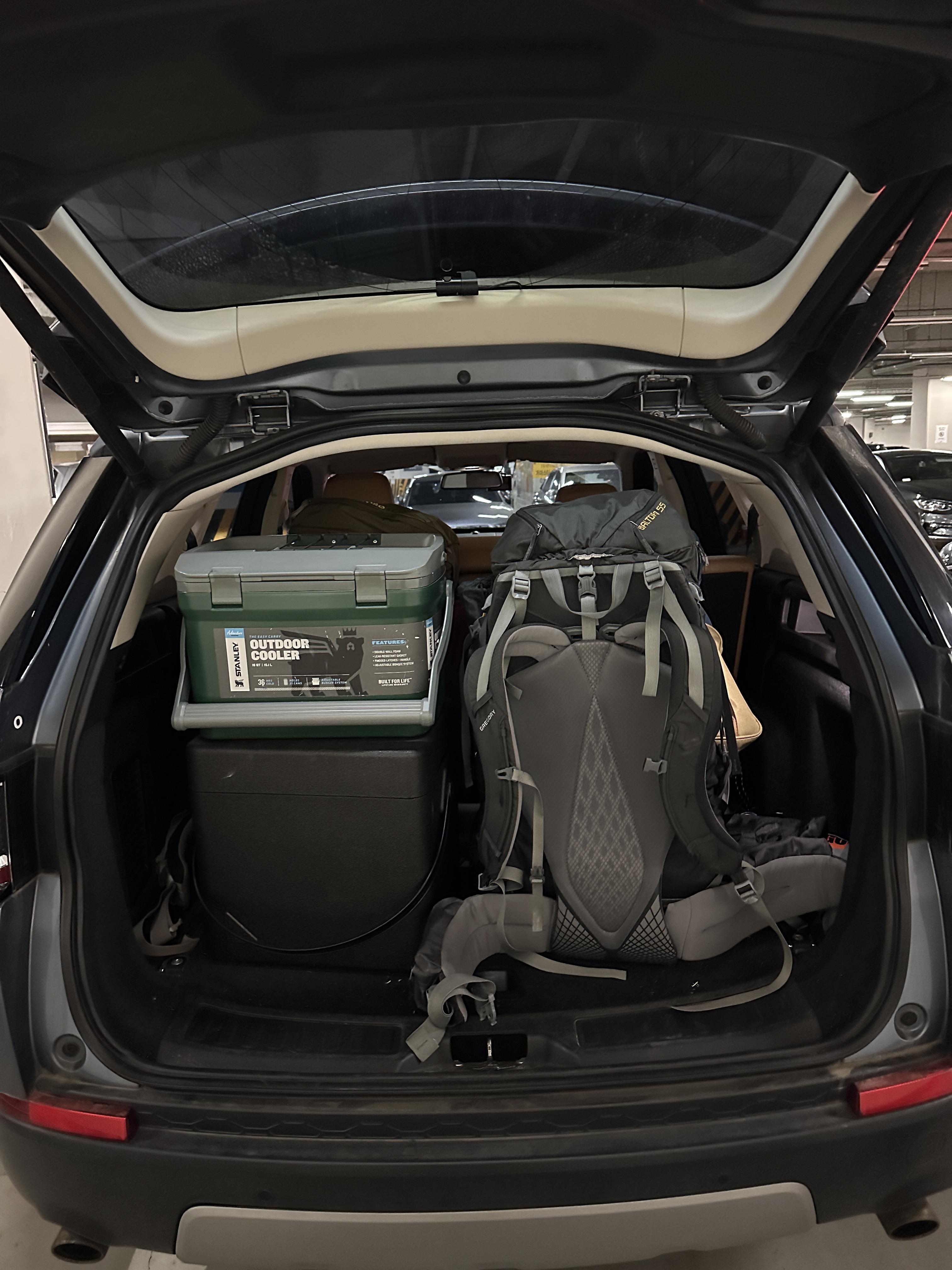 짐은 백패킹 세팅 + 아이스박스 2개로 결정했습니다. (물론, 쇼핑백 두개 정도 더 펴서 먹거리를 담았어요.)