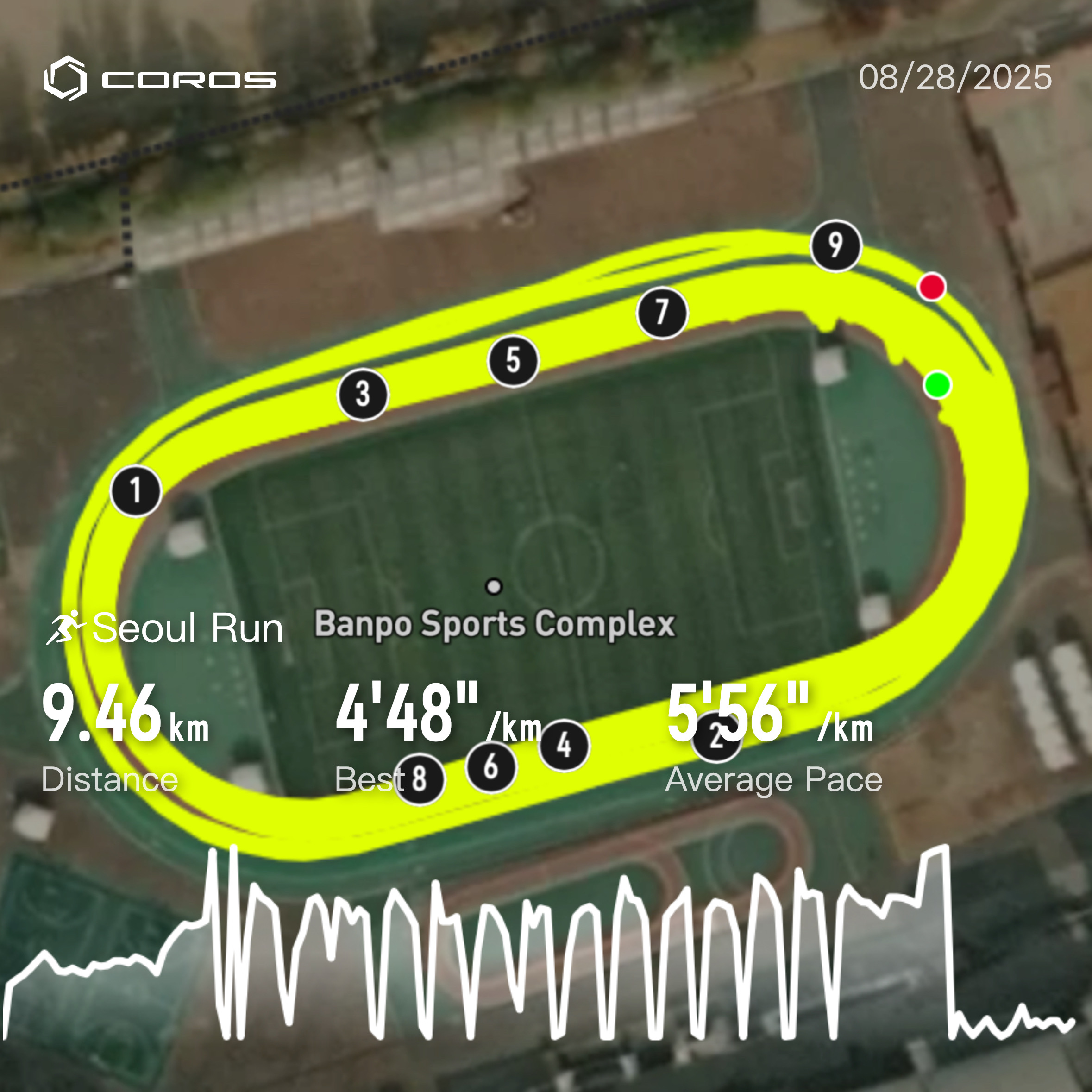가볍게 웜업 러닝을 먼저 진행합니다. 5바퀴 2km를 적당한 속도로 달려서 열을 내 봅니다.