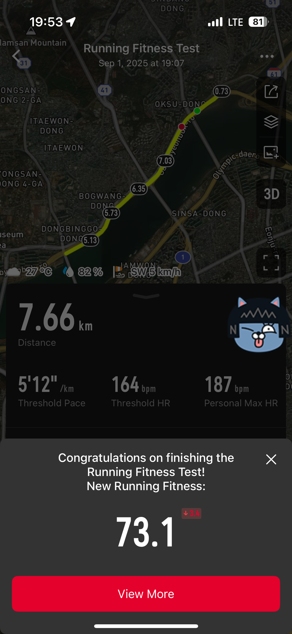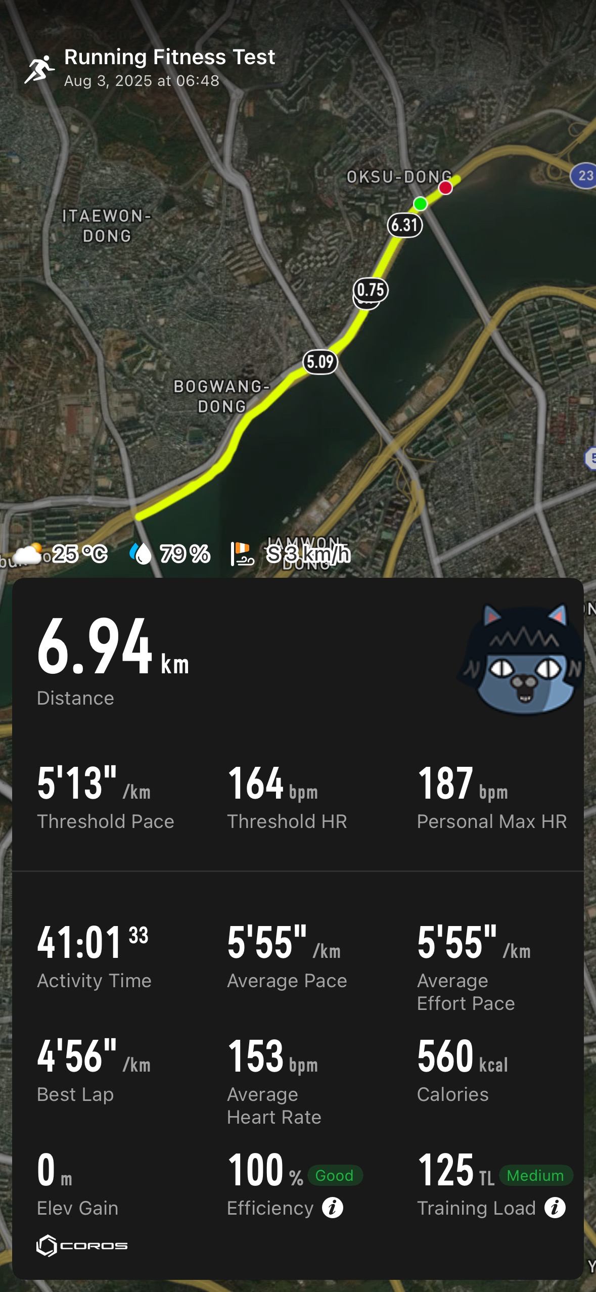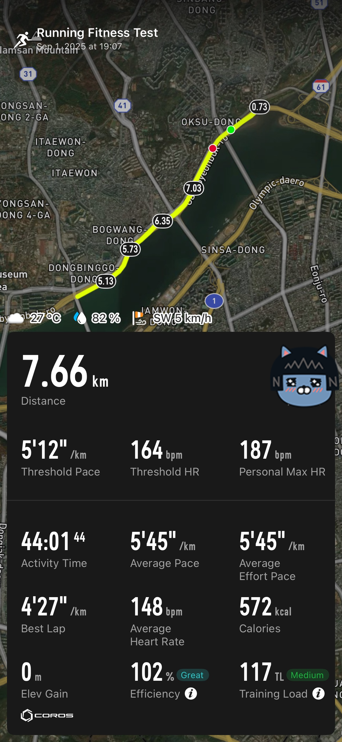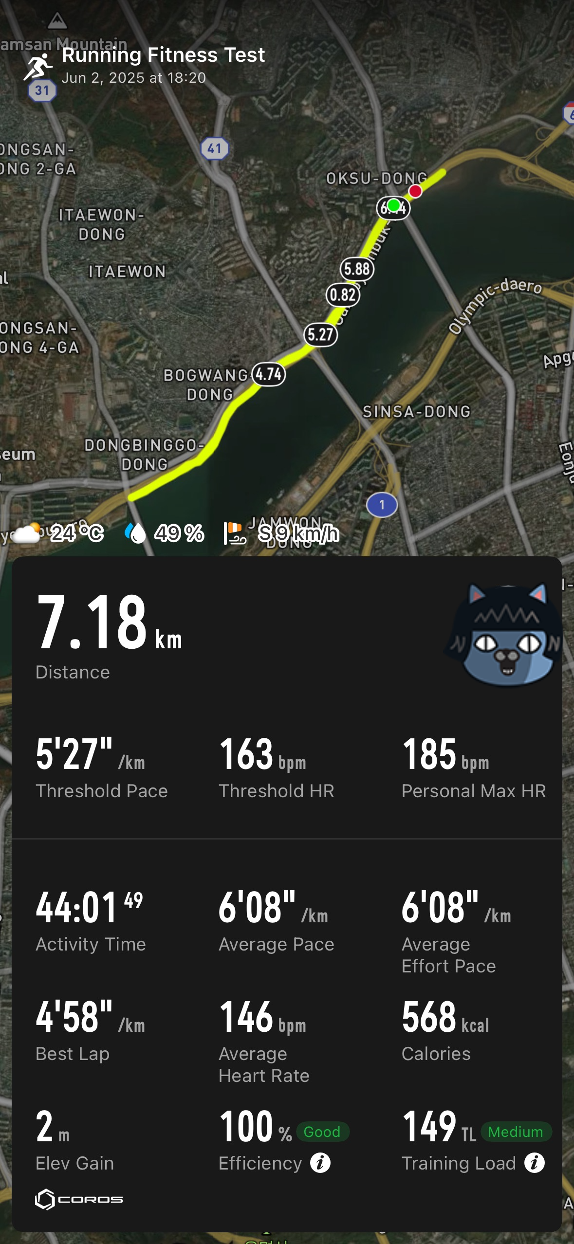 그리고 저는 코로스페이스3으로 매달 1일마다 피트니스테스트를 진행합니다.ㅋㅋㅋ 아래와 같이 똑같은 거리를 똑같은 조건에서 진행해요.ㅋㅋㅋ 나름 한달의 성과를 돌아보는 느낌으로다가 말이죠.