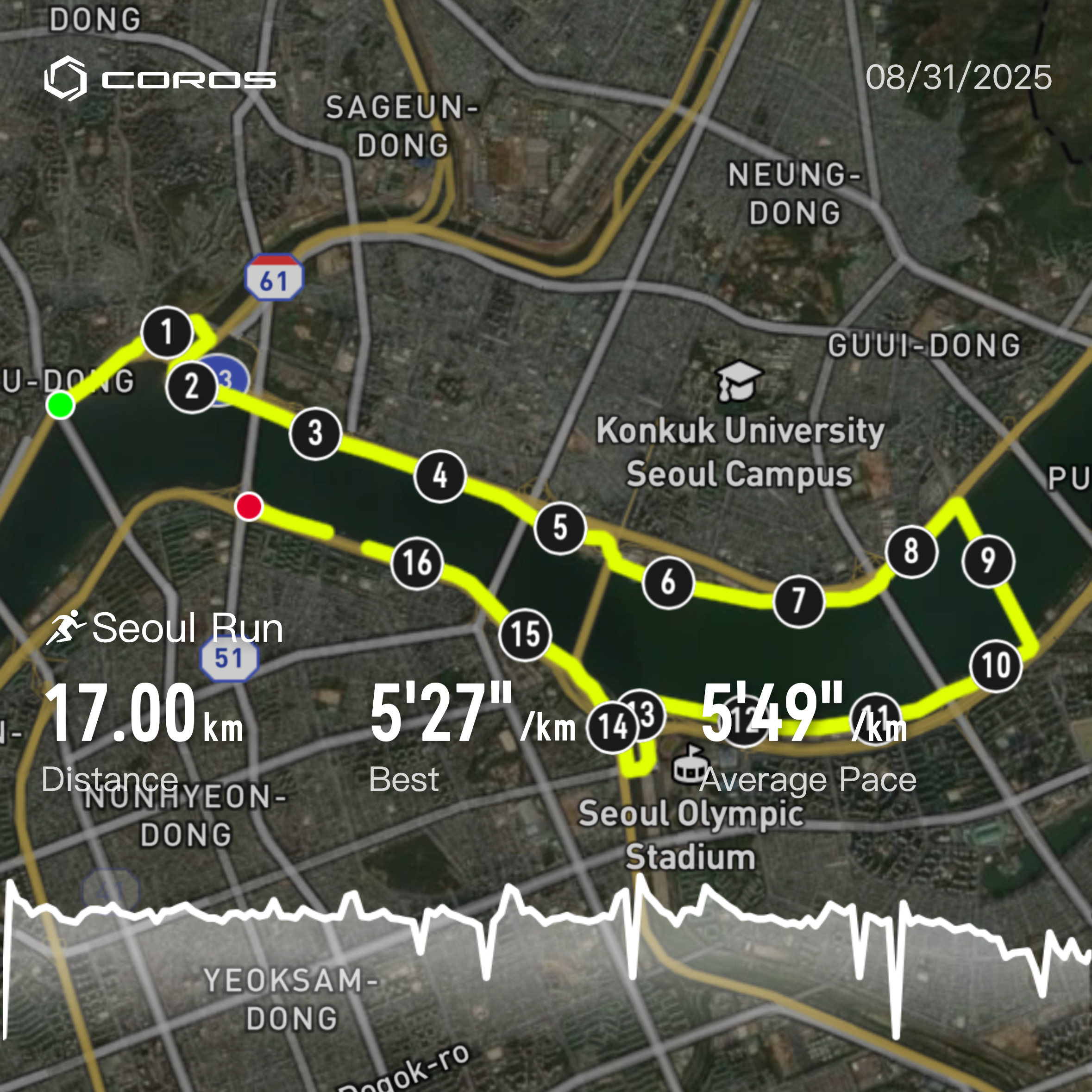그래서 결국 17km 성수대교 부근까지 겨우 가서 종료버튼을 눌렀습니다. 아쉬운 마음이 너무 많이 드는 토요일 아침 과제 실패기였습니다.