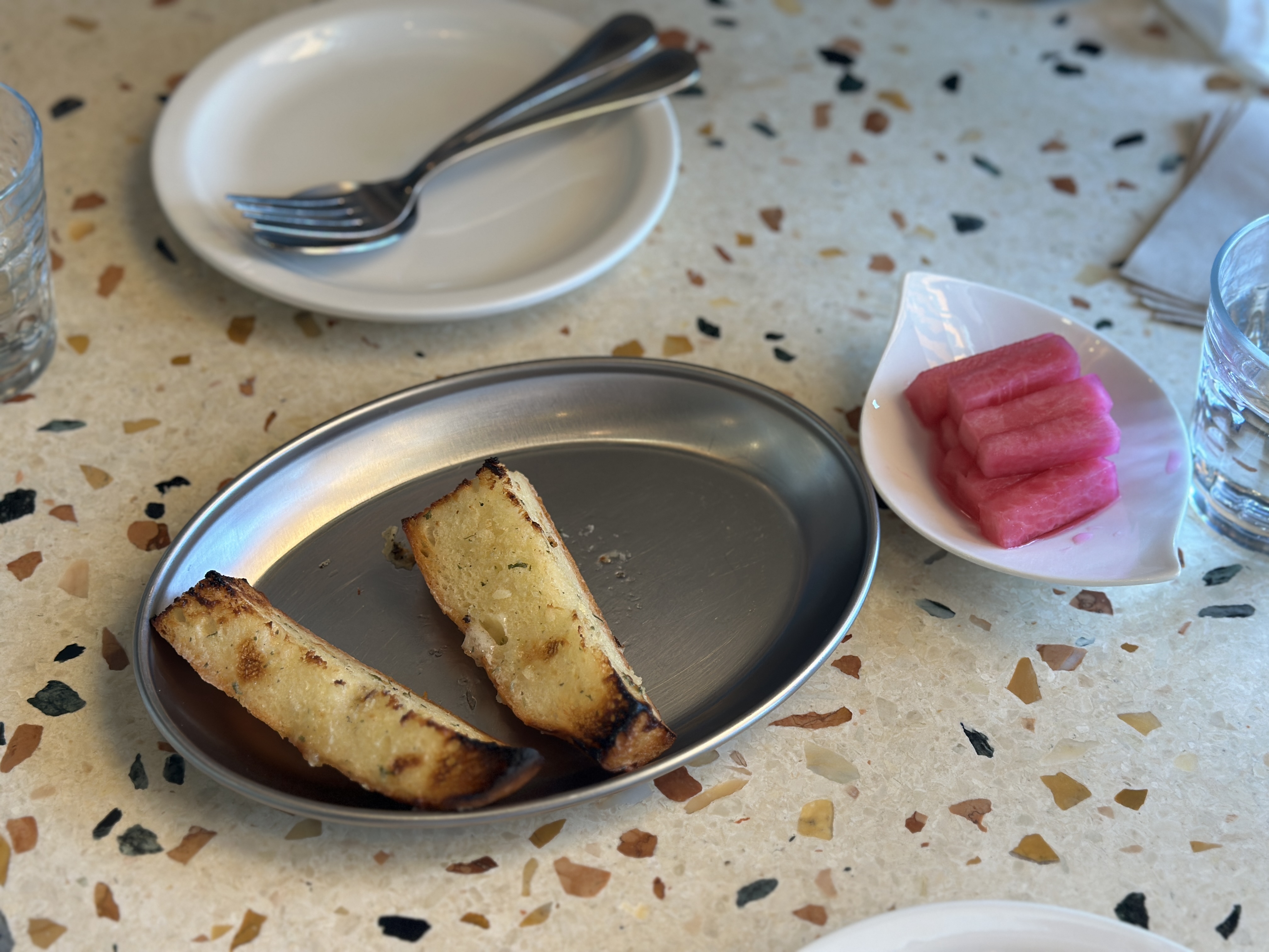 주문하고 얼마 되지 않아서 바로 식전빵이 등장합니다. 지금보니 약간 타긴 했는데 마늘빵 느낌으로 달달하니 맛있습니다.