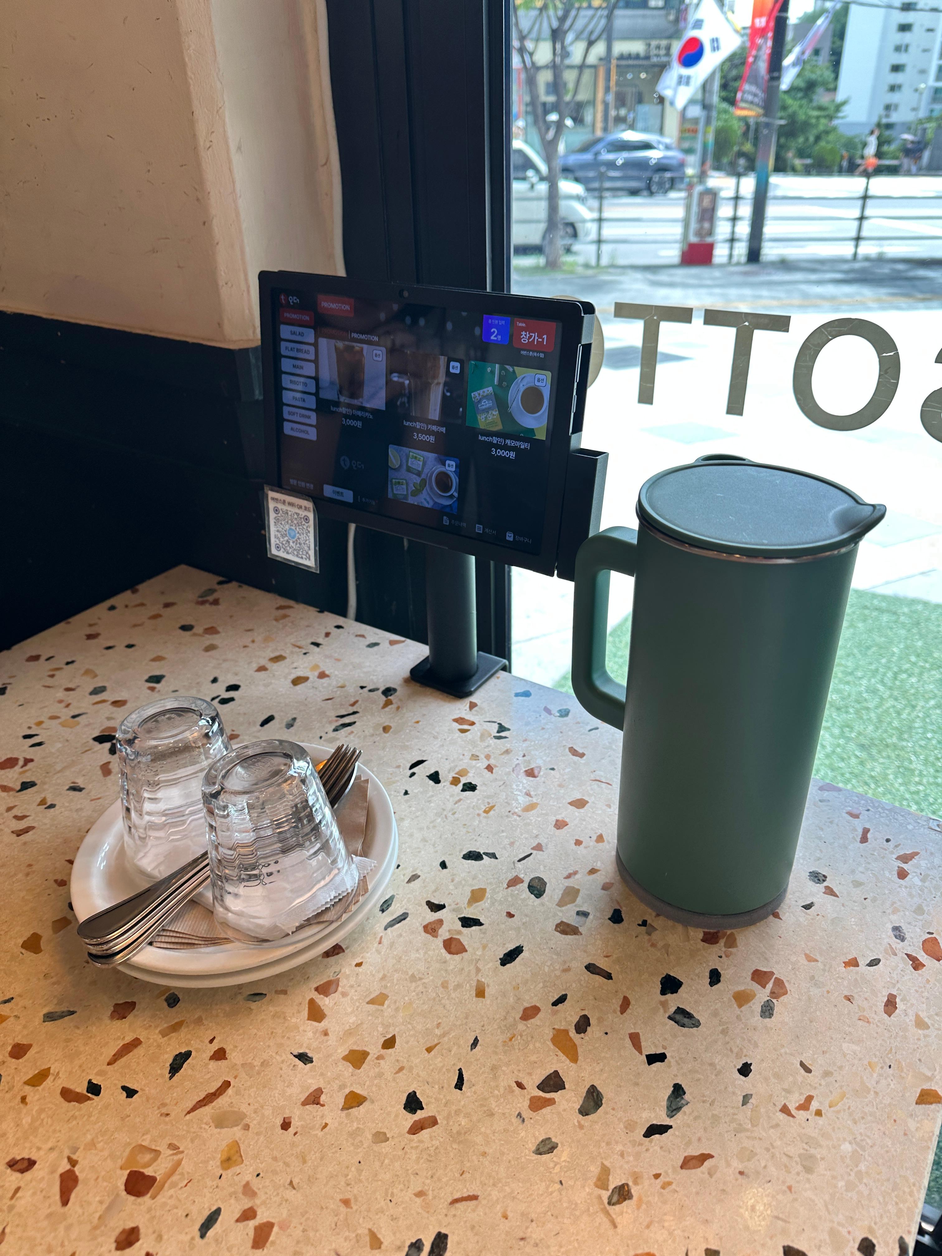 옥수동 어반스푼의 좌석 세팅 및 주문입니다. 주문은 키오스크로, 결제는 나가는길에 합니다. ㅋㅋㅋ 버섯 크림리조또와 해산물 토마토 뚝배기(해장파스타)로 주문해봅니다.