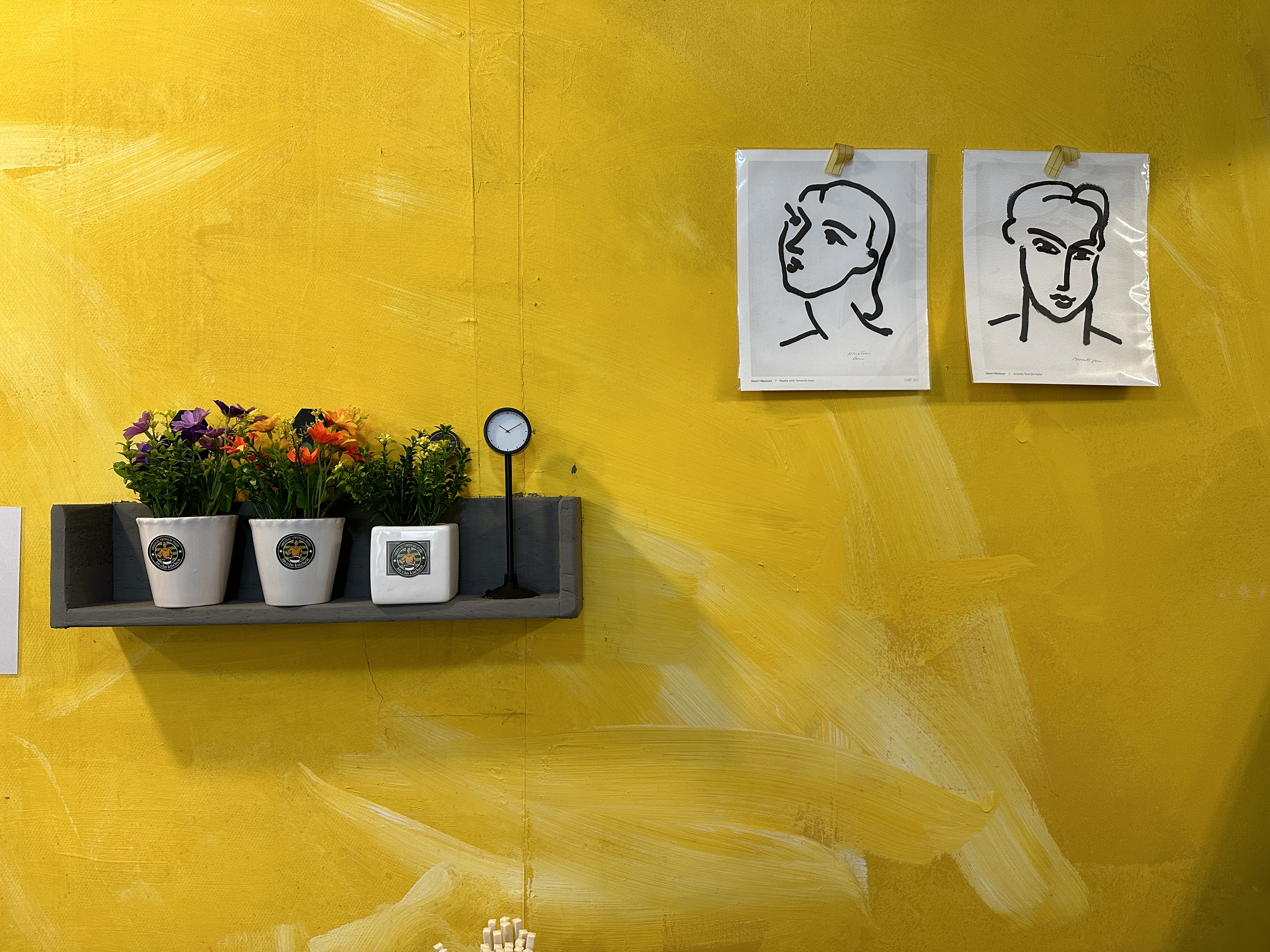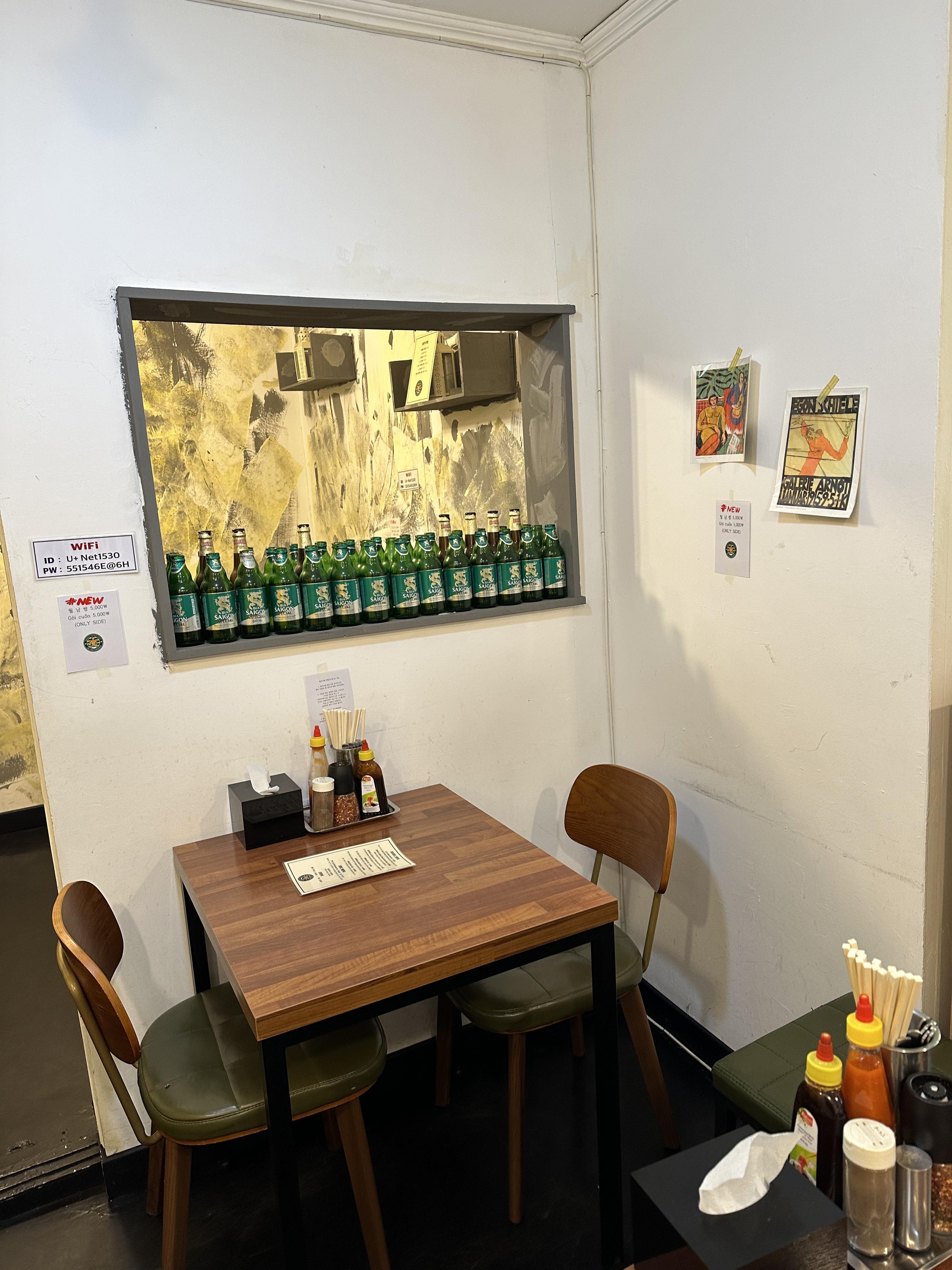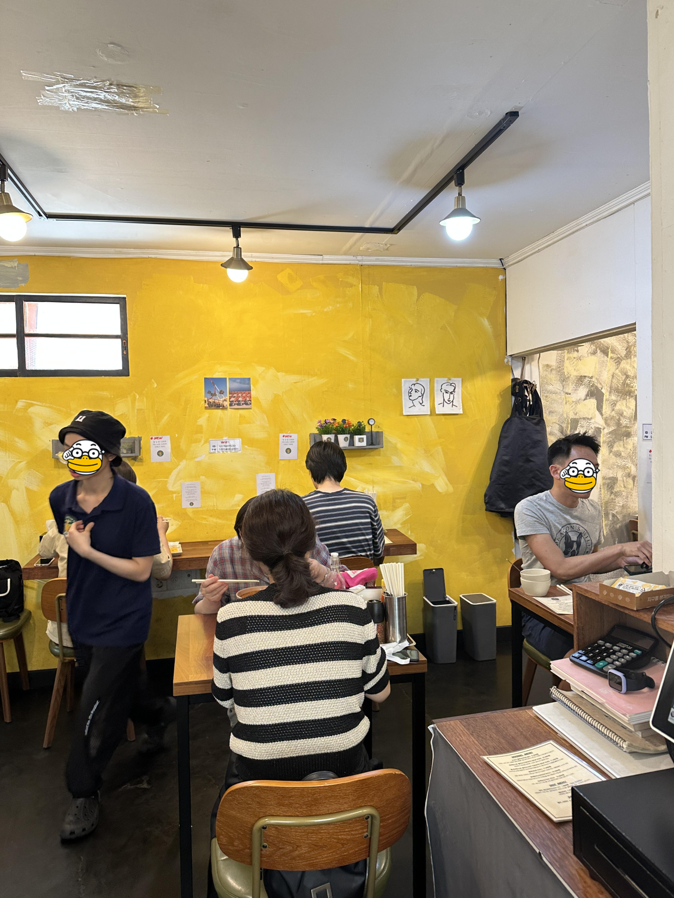 내부 인테리어도 특별한 것은 없지만, 노란 벽면이 눈에 띕니다. 들어가면 테이블이 2인석으로 5개정도 있고, 벽면에 1인석 주루룩 4개 있어요. 저희는 안쪽에 2인석 2개를 붙여서 4인석 자리를 만들었어요. ㅋㅋㅋ 아늑하고 아담한 느낌입니다.