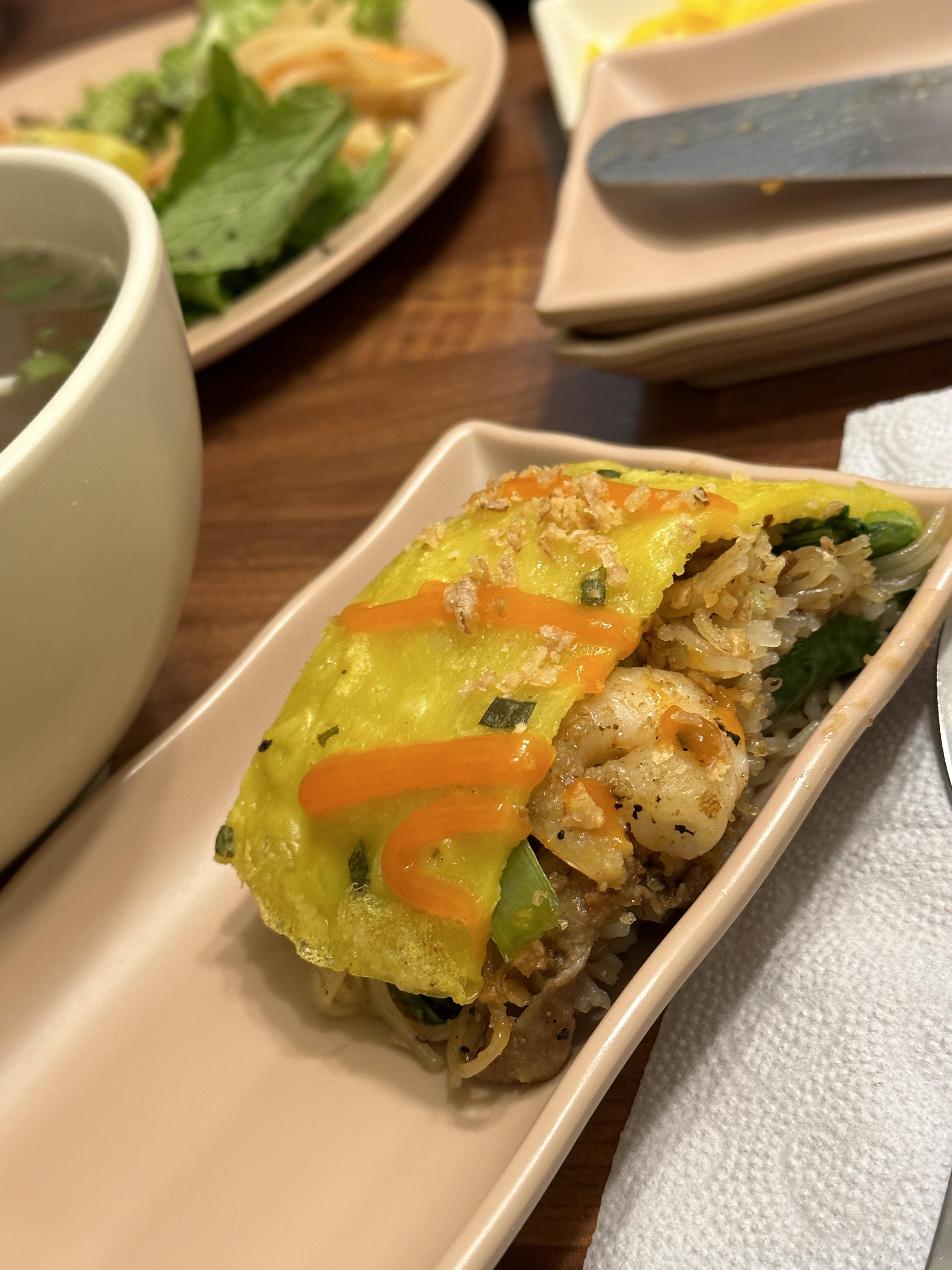 하지만, 넴의 바삭함과 실한 속( 사진 초점이 왜 저모양이지.... 죄송합니다. 하지만 올렸습니다. ㅋㅋㅋ)은 만족스러웠으며, 반쎄오의 속... 보이십니까? 이거 정말 추천합니다. 잘 익혀진 속과 살짝 바삭한 느낌의 계란옷이 정말 잘 어우러져서 먹는 즐거움이 있었어요. 최고최고