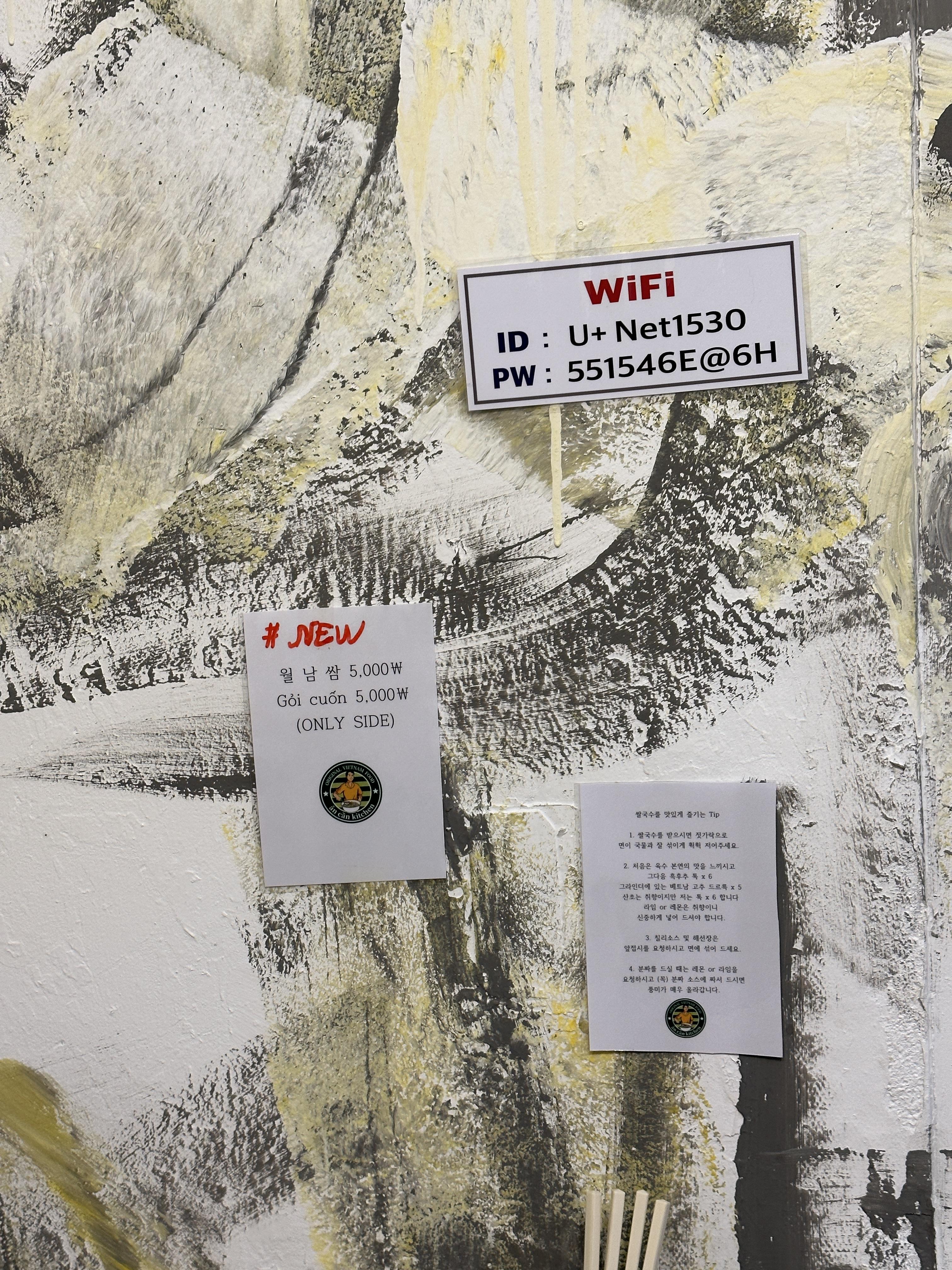 테이블에는 와이파이 비밀번호 및 쌀국수를 맛있게 먹기 위한 방법이 있습니다. ㅋㅋㅋ