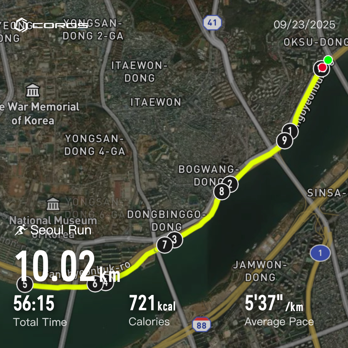 24일 수요일에는 아침에 좀 일찍 일어나서 과감하게 80분 시간주를 계획해봅니다. 옥수나들목에서 잠수교를 건너서 동호대교 남단을 찍고 돌아오니 딱 시간이 맞네요. 15킬로미터나 달릴 줄은 몰랐습니다. 꽤나 잘 뛰었네요. ㅋㅋㅋ 코치님이 칭찬도 해주시고 뭔가 뿌듯합니다. 이번에도 처음 1km는 웜업으로 6분, 나머지는 되는대로 페이스 살짝 올려봤습니다. ㅋㅋ 뭔가 뿌듯한 15km!