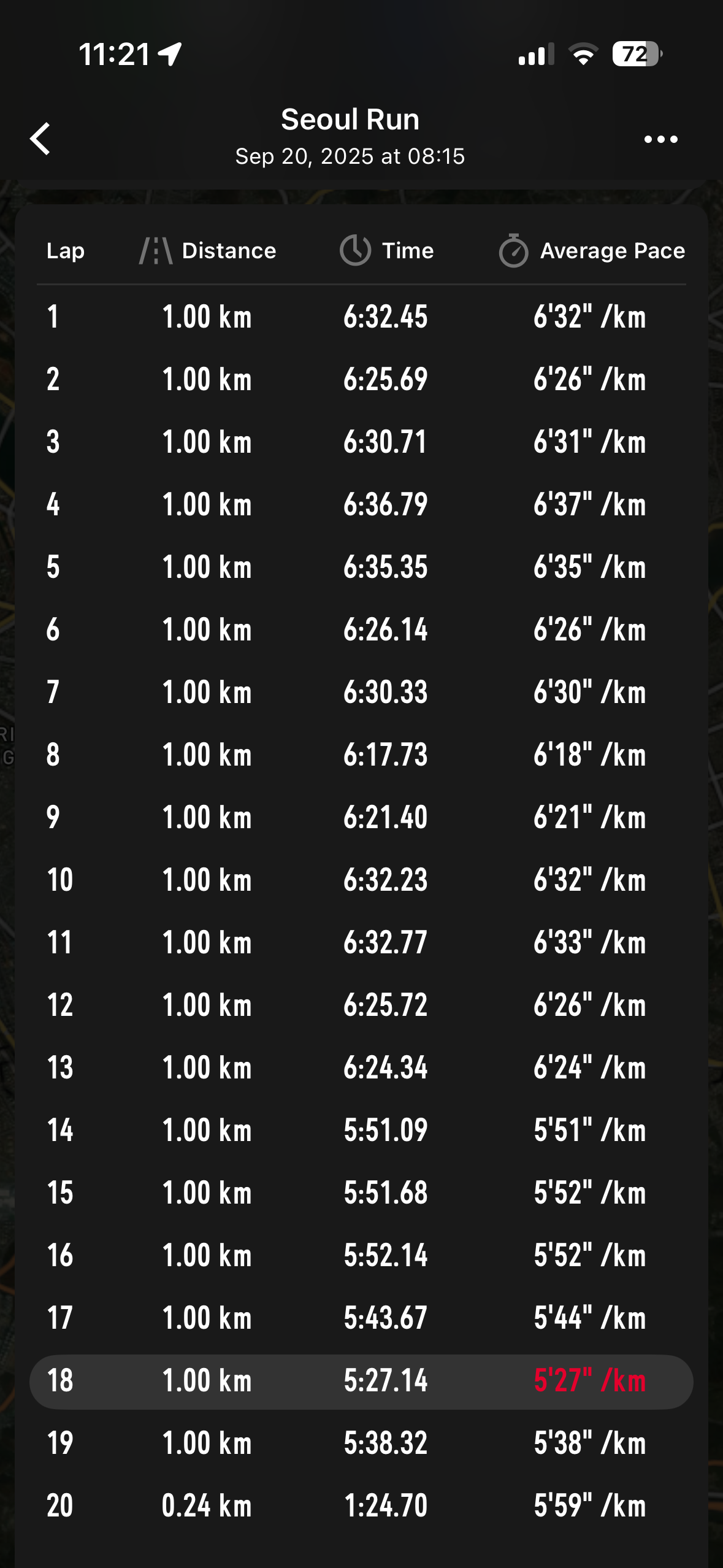 화요일에는 아침일찍 일어나서 10km를 빌드업 러닝 해봤습니다. 6분페이스로 시작해서 웜업 1km 후 조금씩이라도 빠르게 뛰어보자 했는데 지금보니 제대로 된 것 같지는 않네요 ㅋㅋㅋ 마지막에 5분11초로 마무리했습니다. 그래도 이제 1시간 안쪽은 쉽게 달성하는 편이네요. 만족스럽습니다.