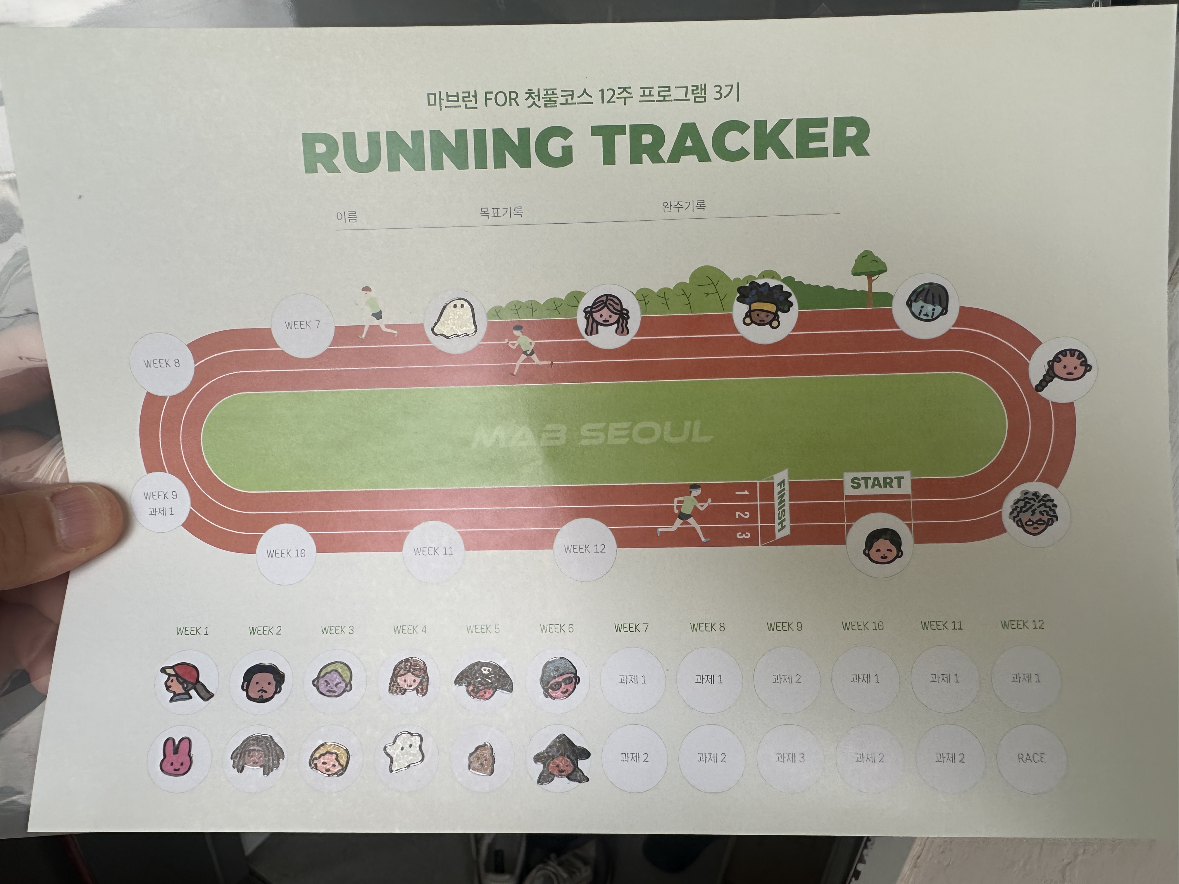 러닝트래커에 또 신나게 스티커를 붙여봅니다. ㅋㅋ 어느새 절반이 딱 찼네요. ㅋㅋㅋㅋ 지금까지 한 만큼 하면 결전의 날이 오는구나 생각하니 갑자기 숨이 턱 막힙니다.ㅋㅋㅋㅋ 진짜 열심히 하고는 있는데 과연 끝까지 완주가 될 지도 모르겠구요...ㅋㅋㅋ 사실 이번주에는 목감기가 심하게 걸려서 조금 힘들긴 합니다만... 그래도 견디고 이겨낸 것 같아서 뿌듯하기도 합니다.