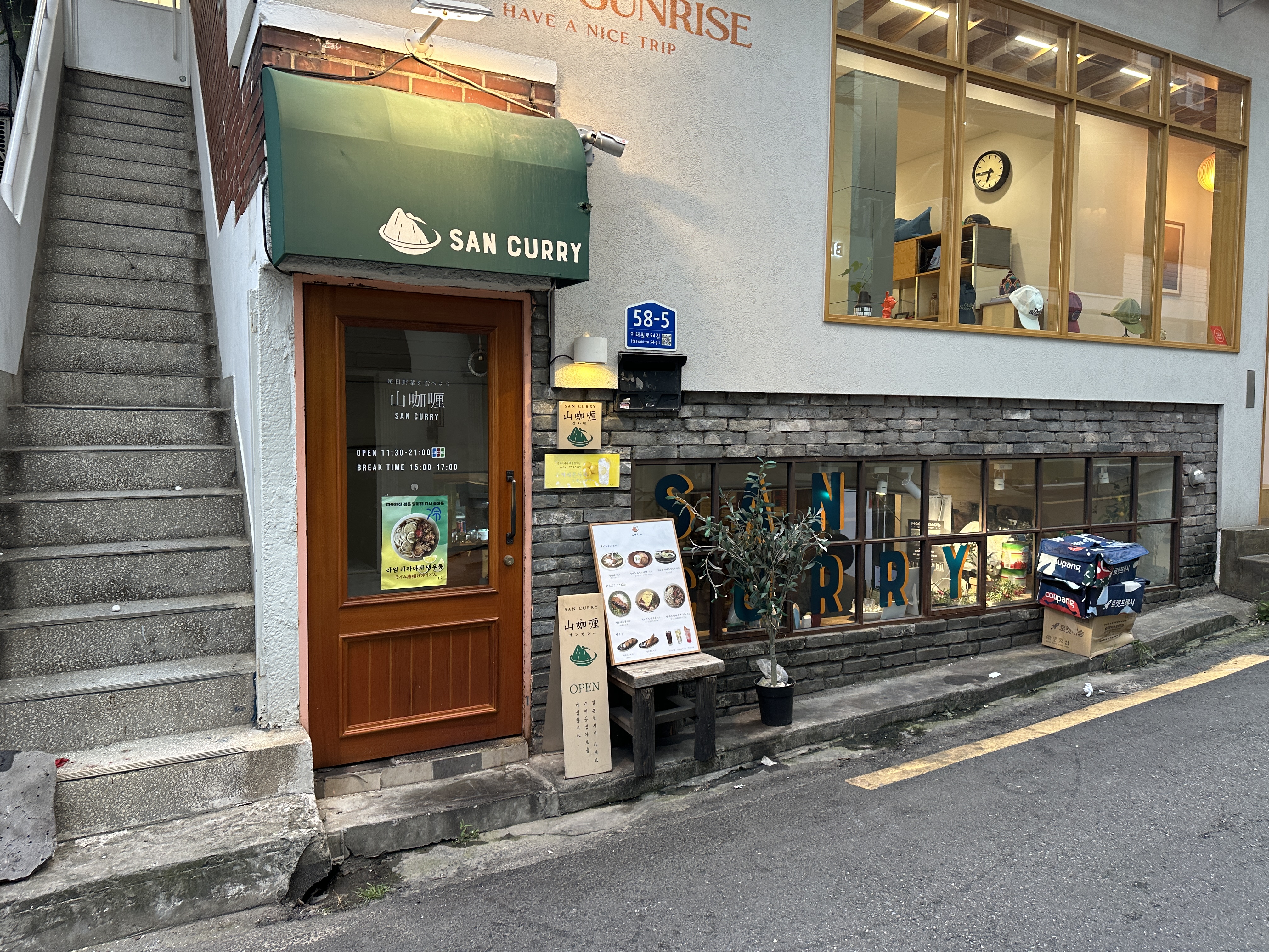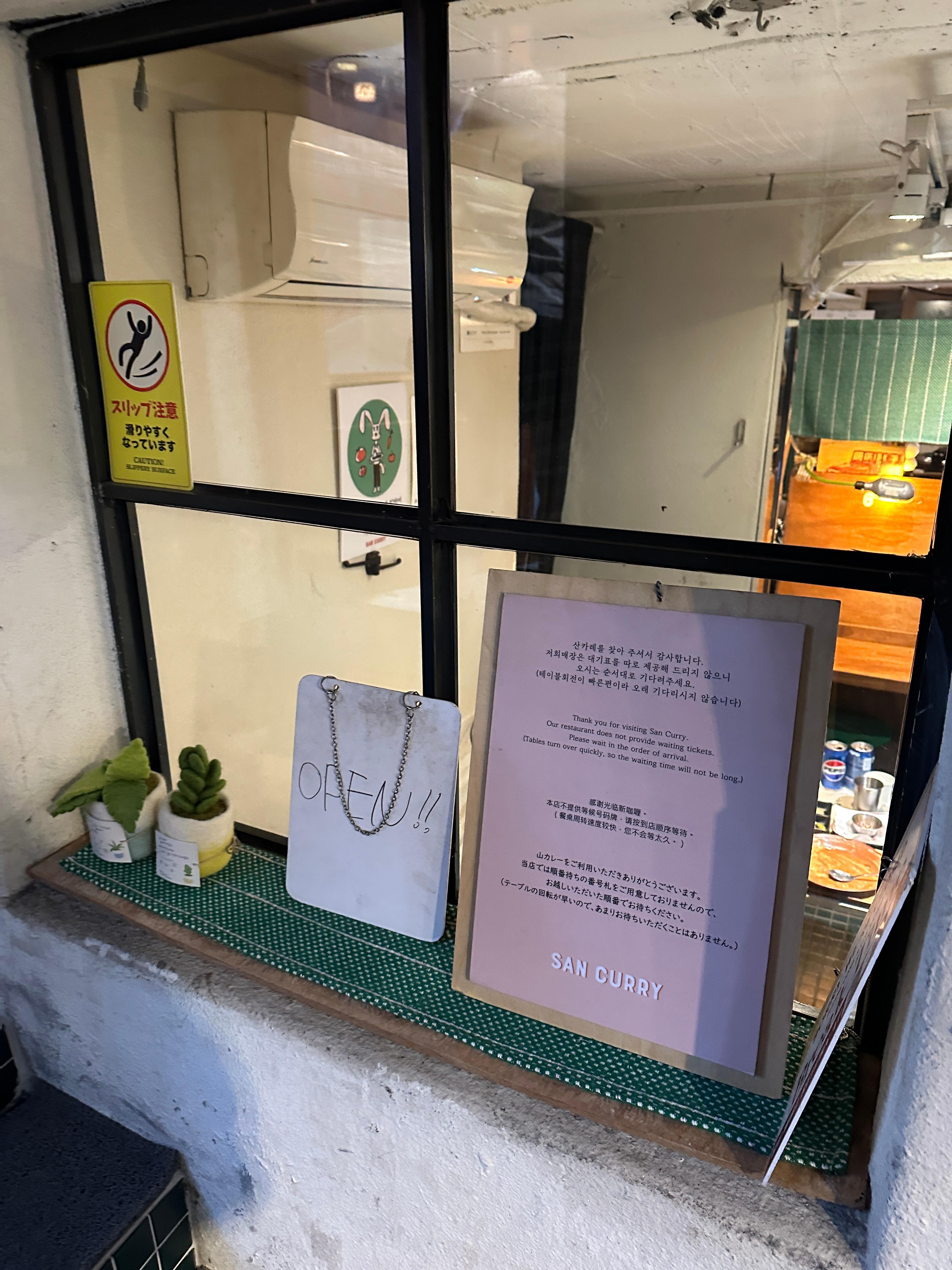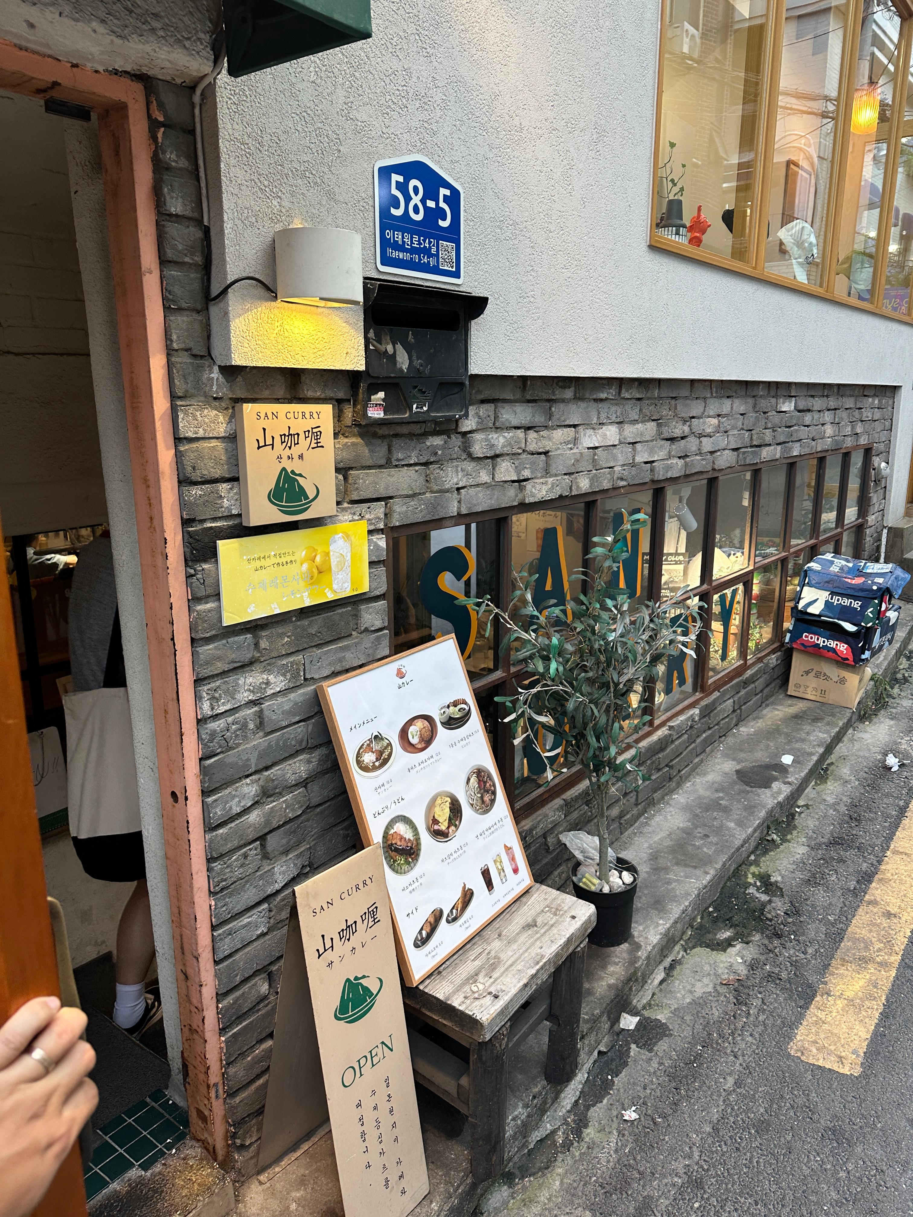 산 카레의 외관입니다. 지하에 자리하고 있어서 간판이 조금 낮지만, 뭐 나름 운치있고 좋습니다. 메뉴도 밖에서 확인이 가능하구요.