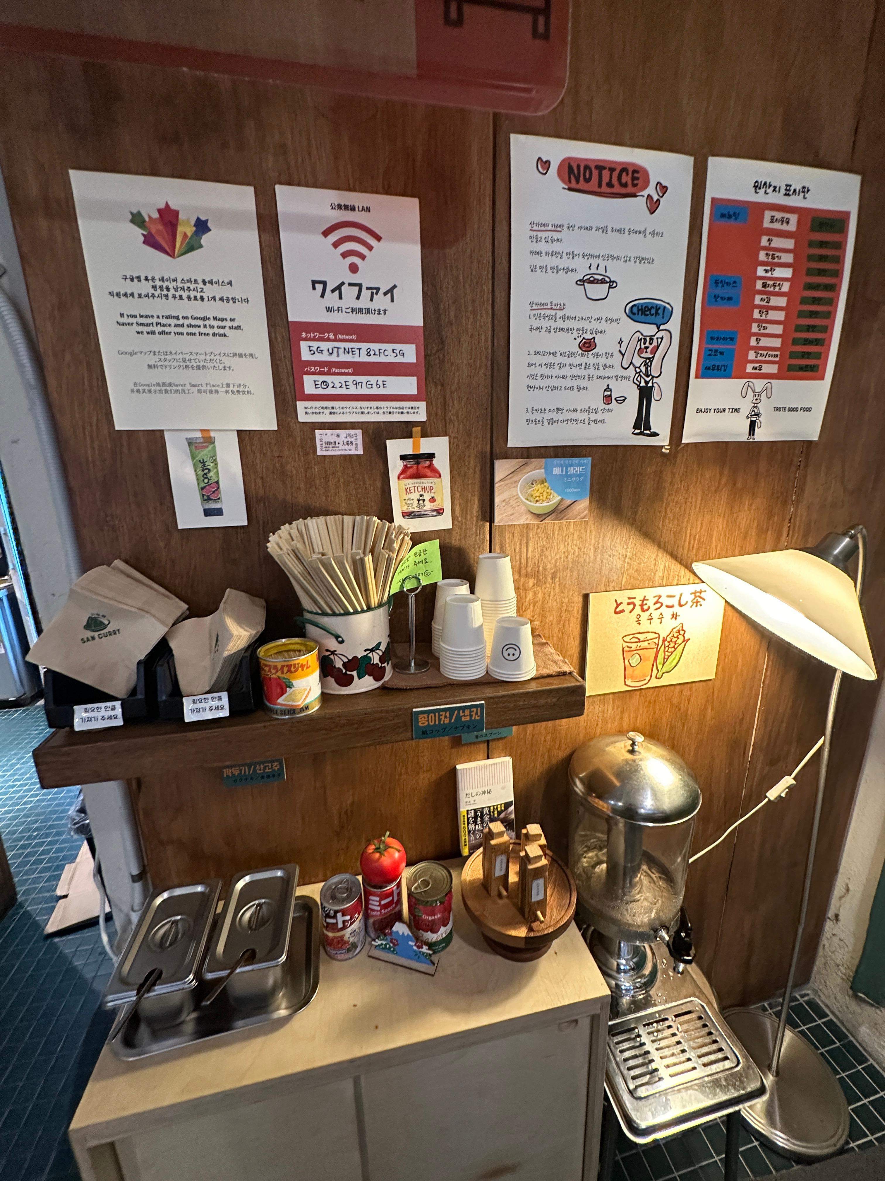 산 카레의 실내입니다. 엄청 넓거나 쾌적하진 않습니다. 그래도 이런 분위기도 나름의 운치를 줍니다. 셀프바도 한 켠에 마련되어 있어요.