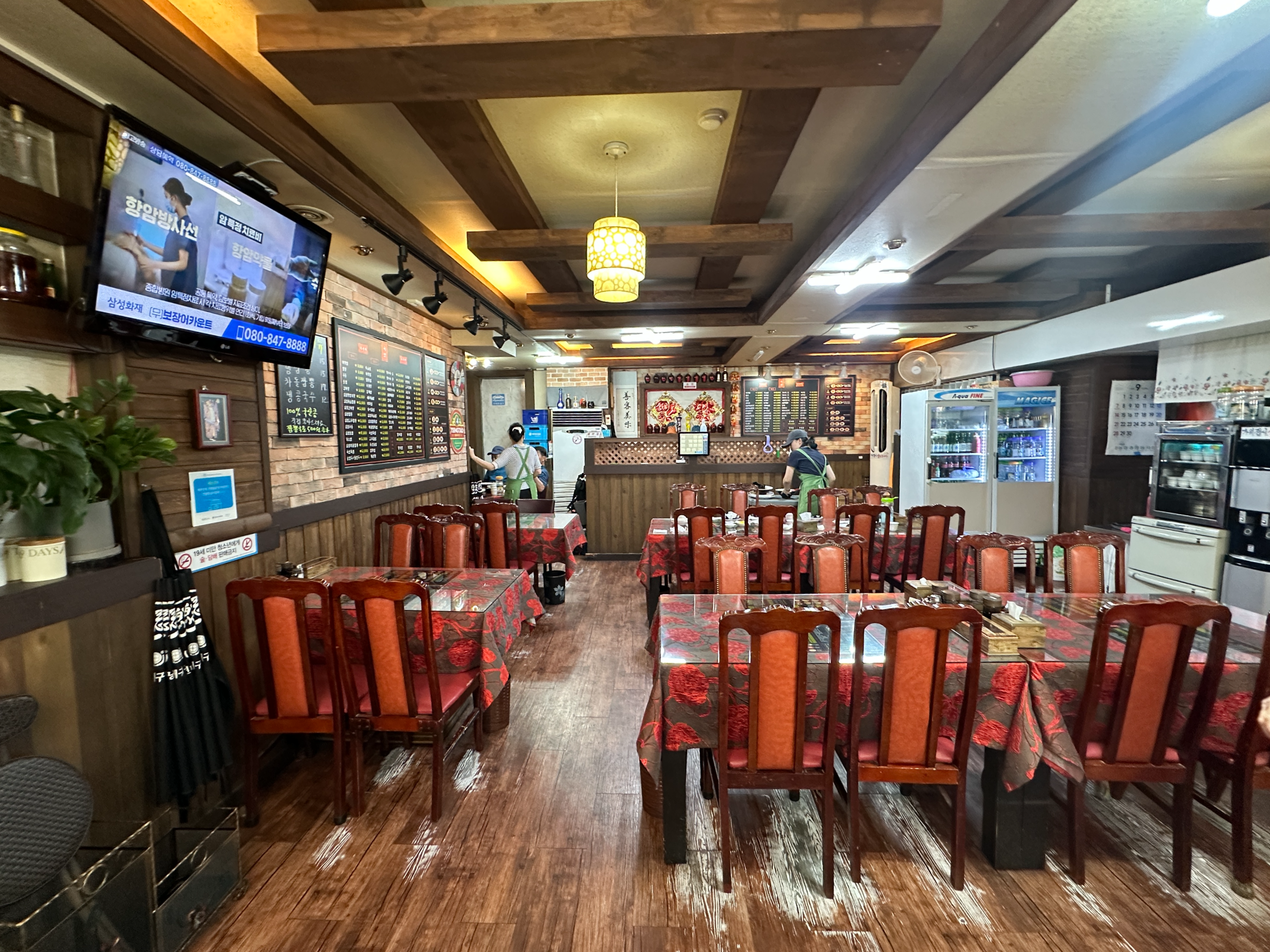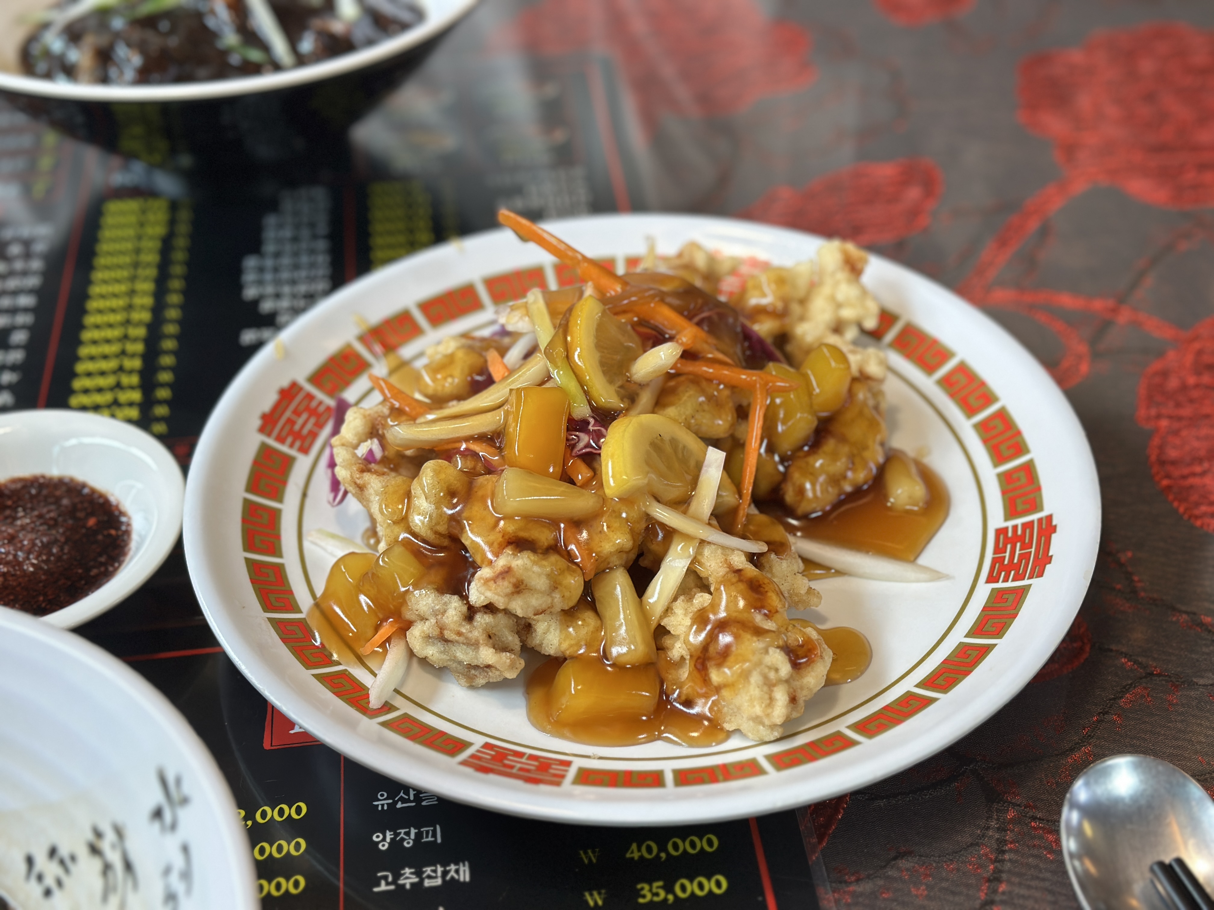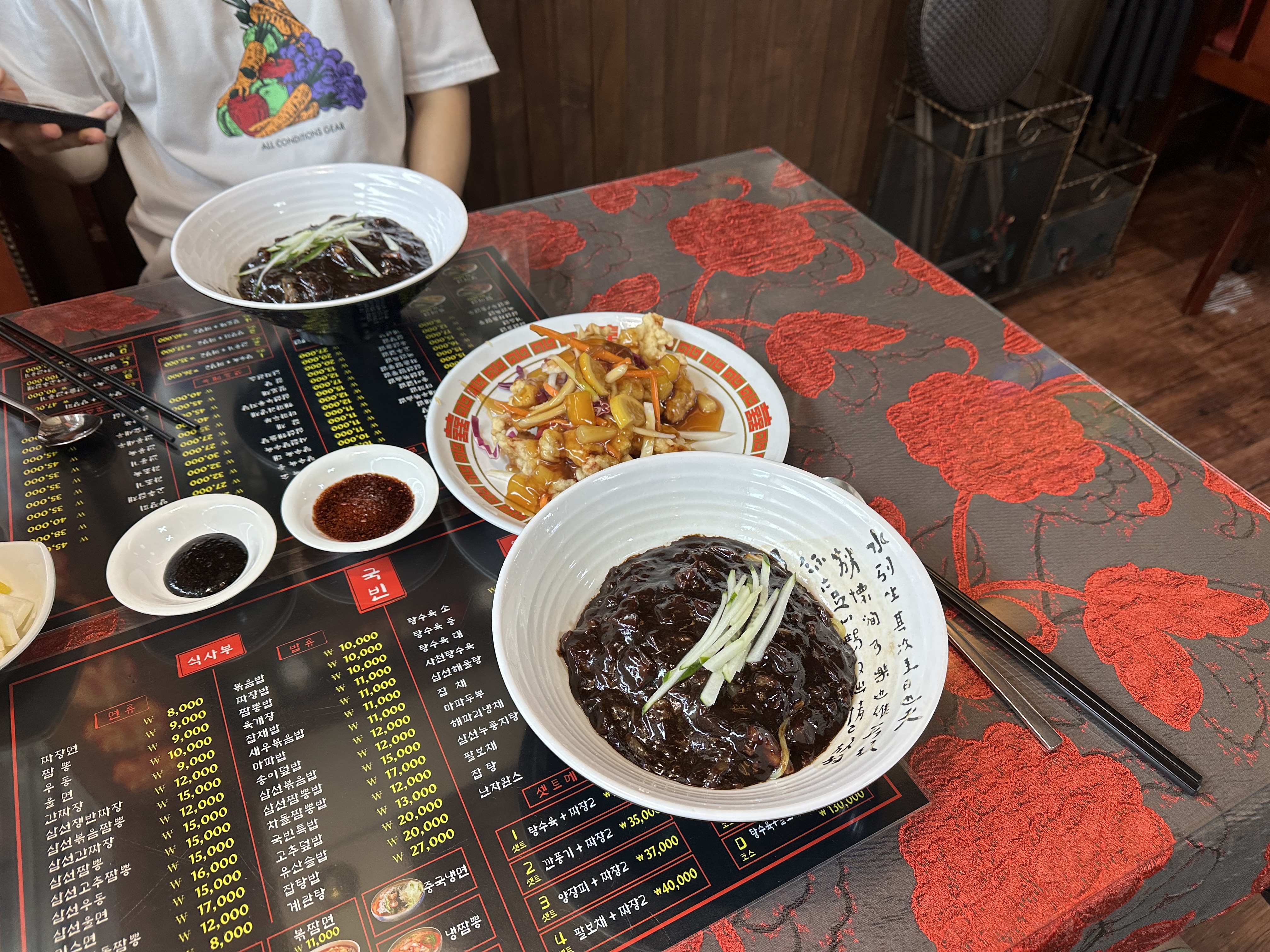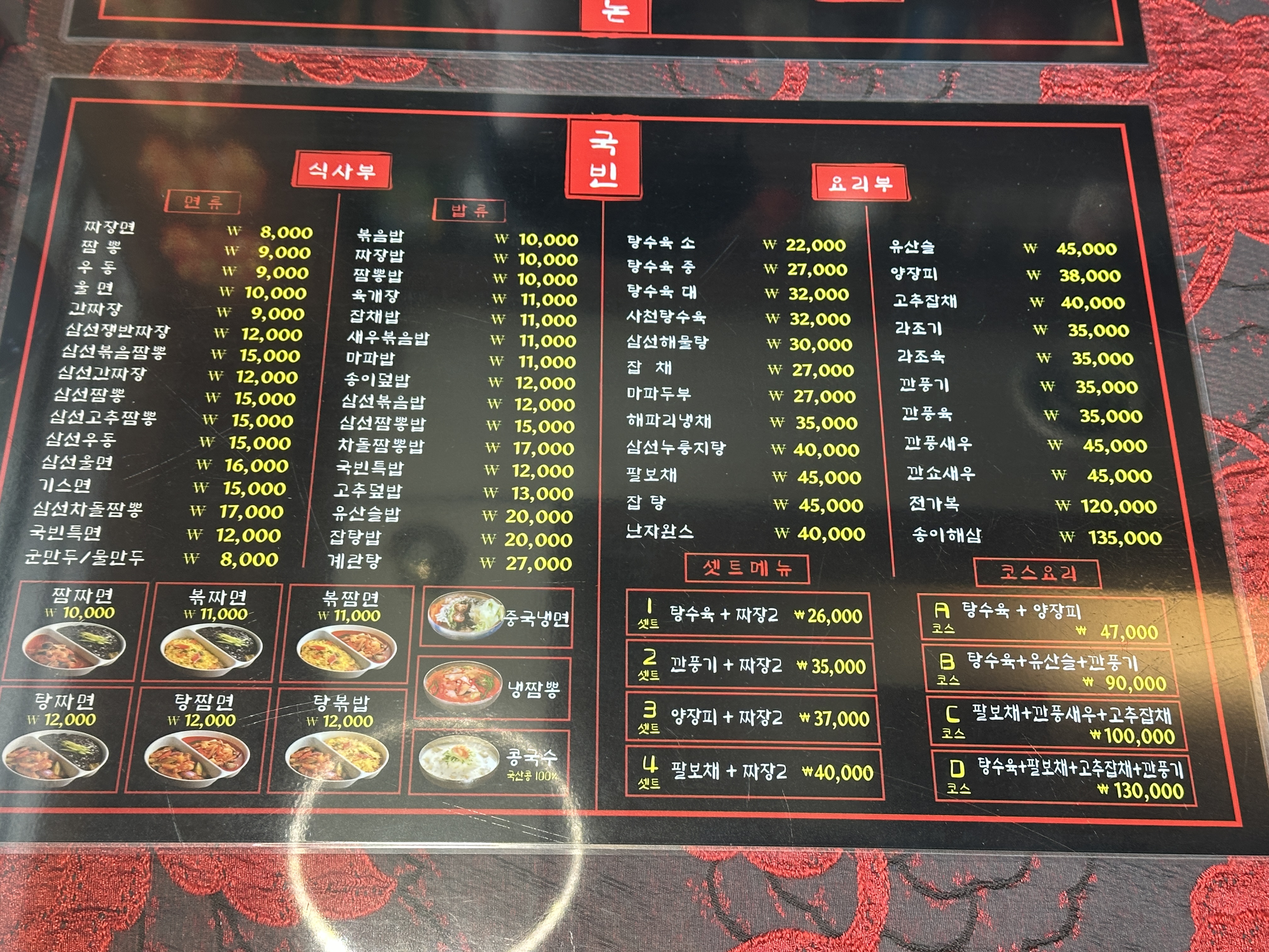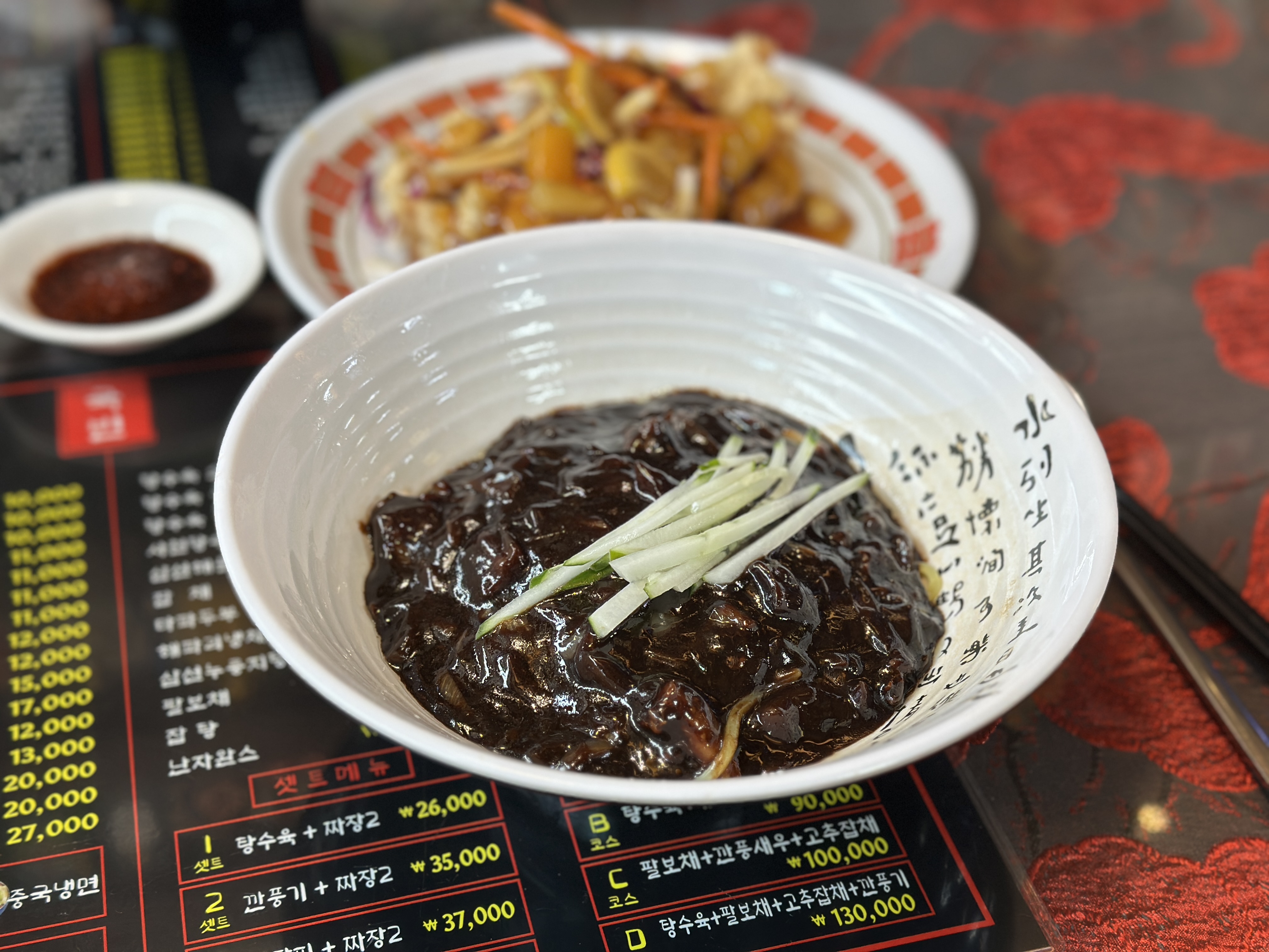 뭔가 붉은 기운이 가득한 것이 옛날 느낌 물씬 나는 중화요리 식당이죠?ㅋㅋ 메뉴판 구성도 상당히 짱짱합니다. ㅋㅋㅋ 다양한 메뉴가 가득했지만, 운동 후 왔던 터라 과한 요리가 아닌 짜장2+탕수육의 기본 세트 구성으로 부탁드려봅니다.