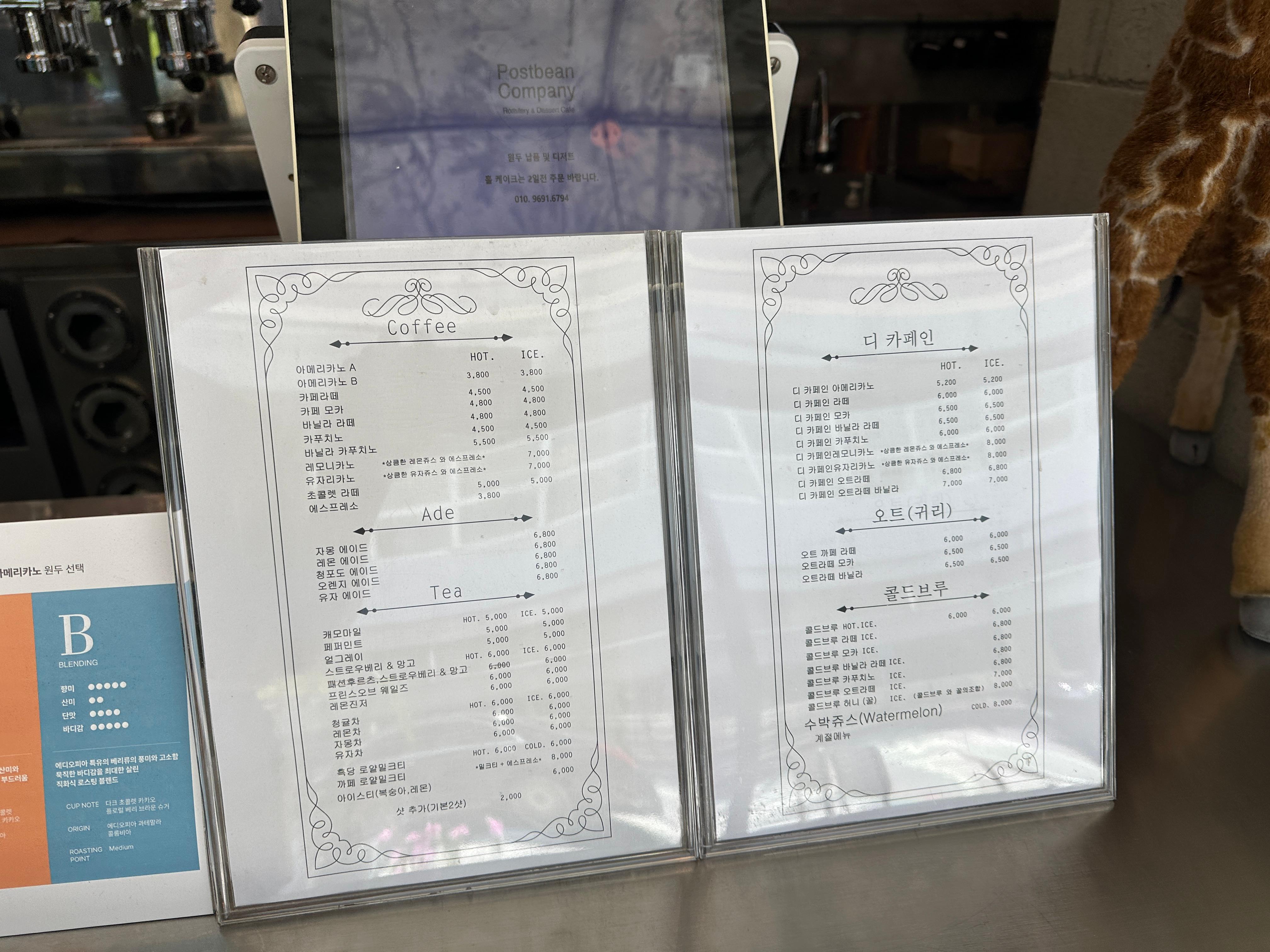 일단 포스트빈컴퍼니의 메뉴판입니다. 원두 A, B를 고르는 걸 보니 커피 내리시는것에 진심이신가보다 싶어서 아메리카노로 주문합니다. 운동하고 와서 시원한 녀석으로 부탁드려봅니다.