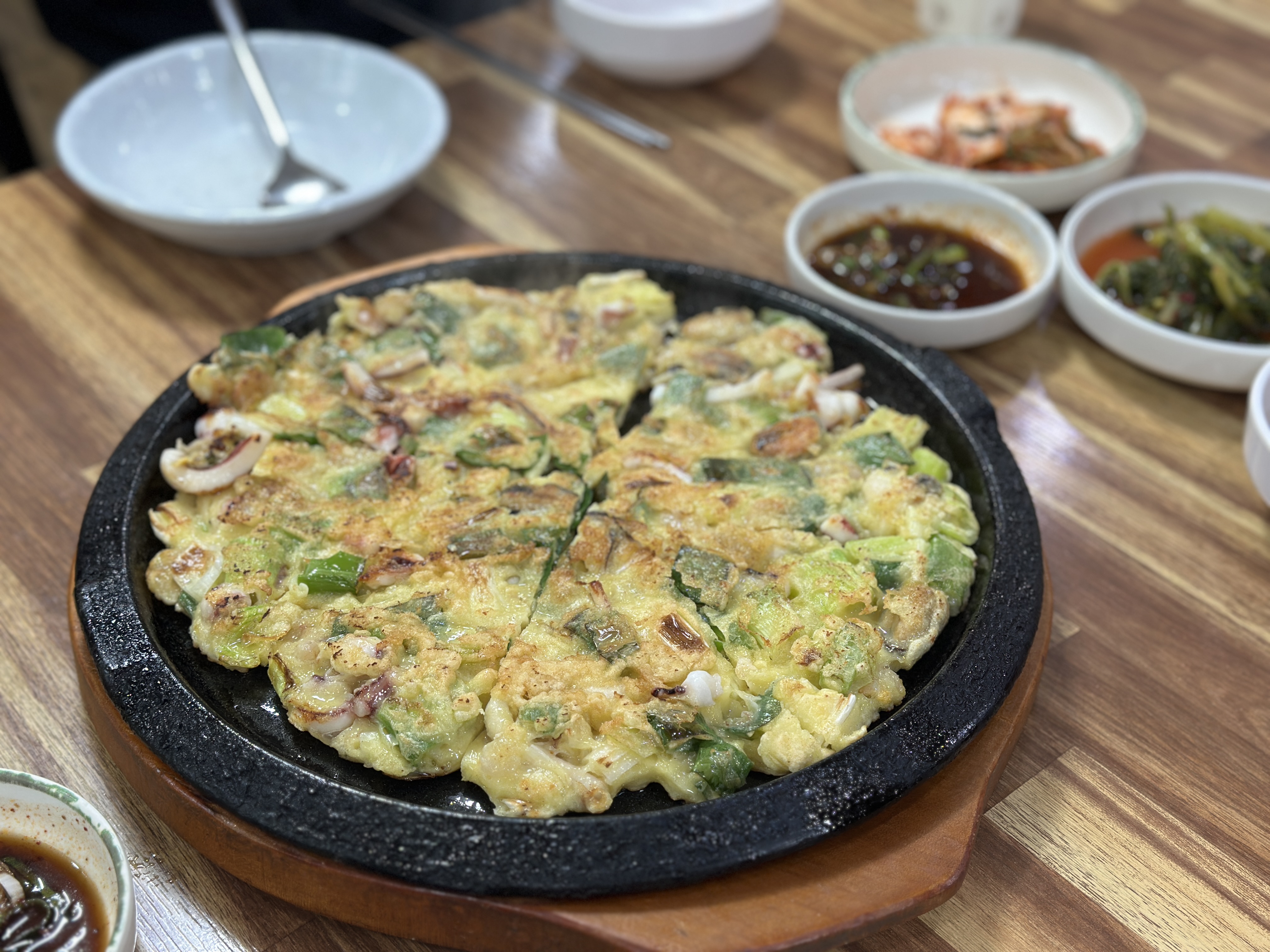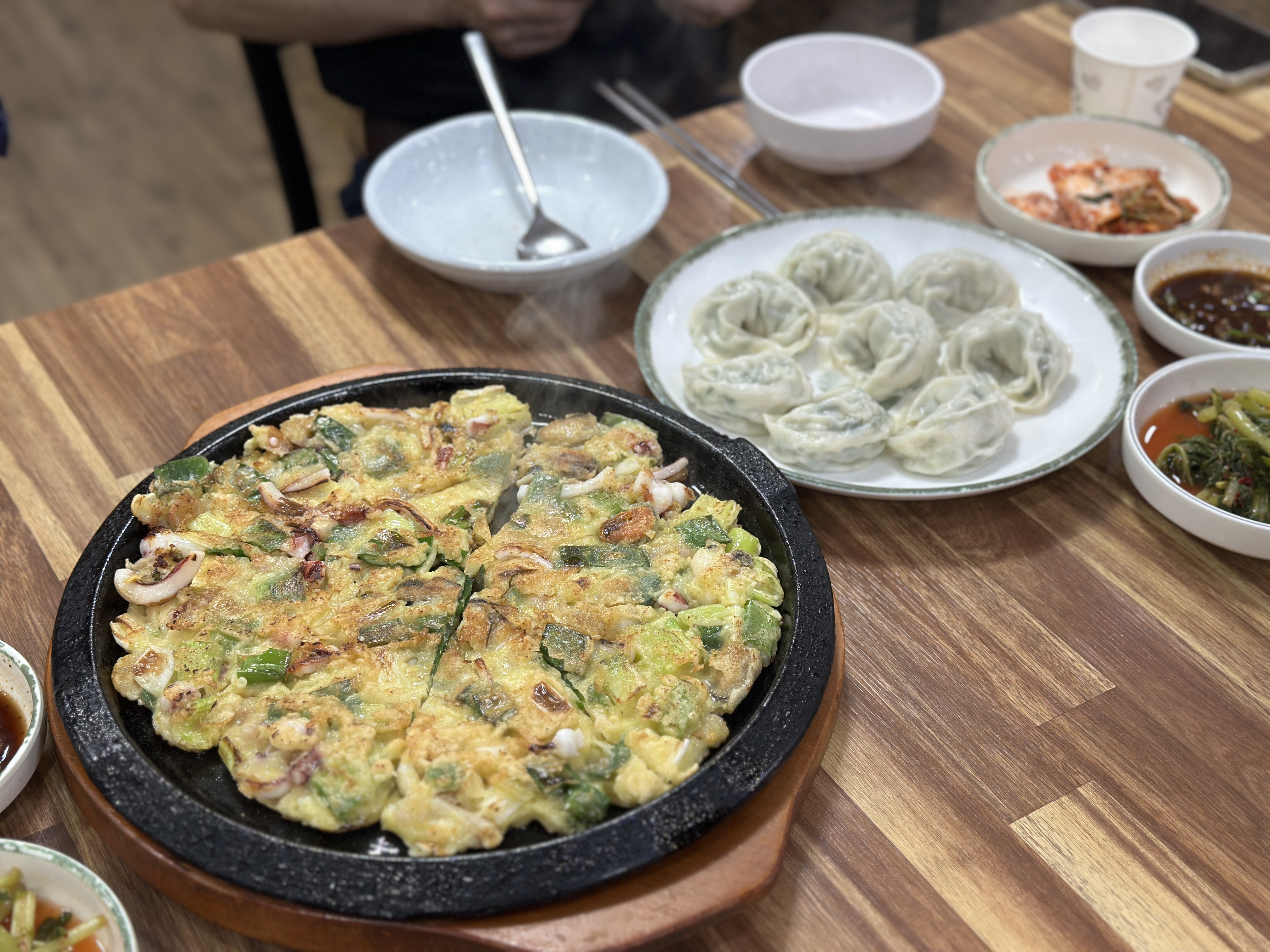 파전과 만두가 나옵니다. ㅋㅋㅋㅋ 파전은 진짜 윤가네 바지락 칼국수의 대표메뉴라고 봐도 과언이 아닙니다. 3명 이상 가신다면 무조건 시켜 드세요. ㅋㅋㅋㅋ 양도 양이고, 바삭바삭한 맛이 정말 일품입니다. 만두는 사실 엄청 대단한 느낌은 아니지만 기대하는 수준의 맛 딱 그정도입니다.