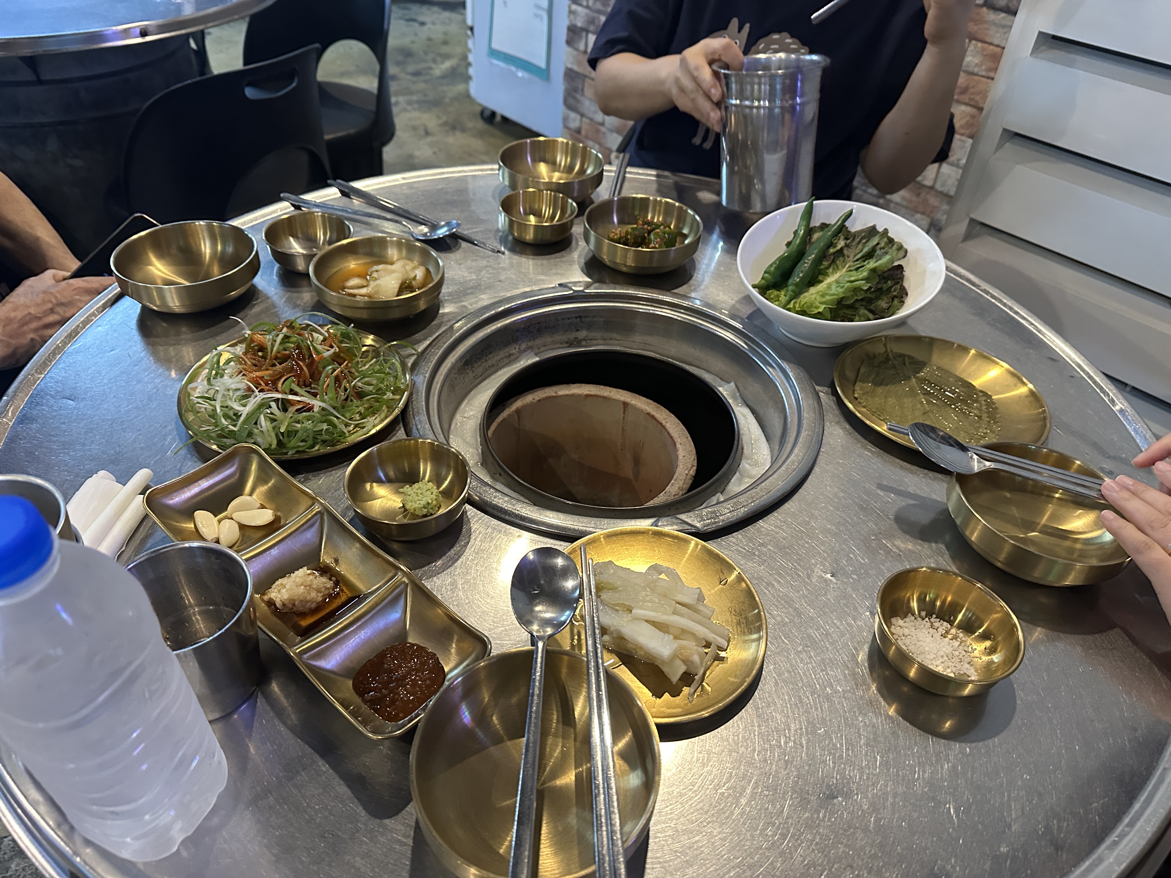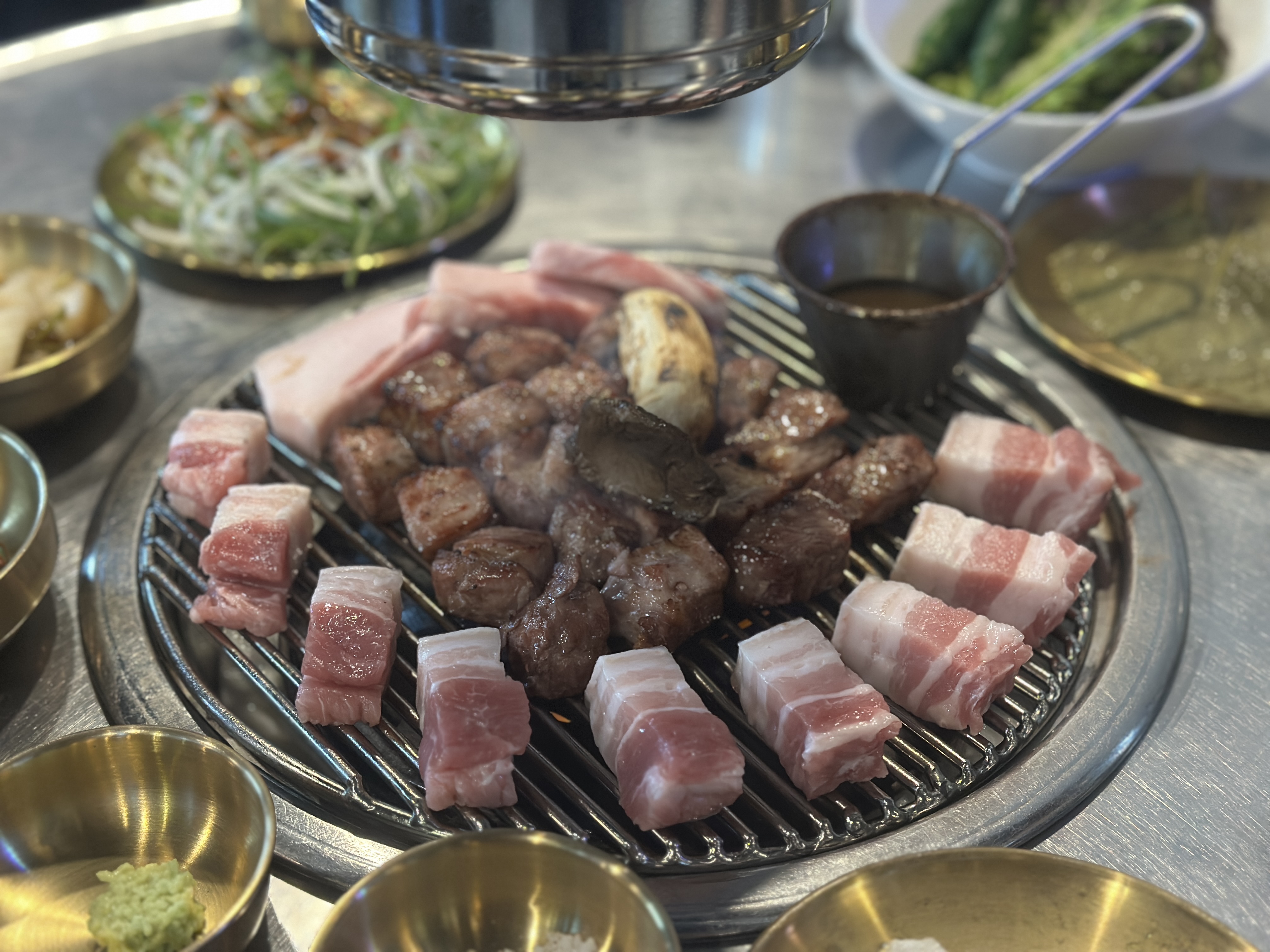 테이블 세팅도 여전하고, 근고기 한 판의 모양도 여전히 아름답습니다. 목살은 구워서 주시고, 목살을 맛보는 동안 삼겹살이 익어가니 고기 먹는 동안 끊길 일도 없고 참 좋아요.