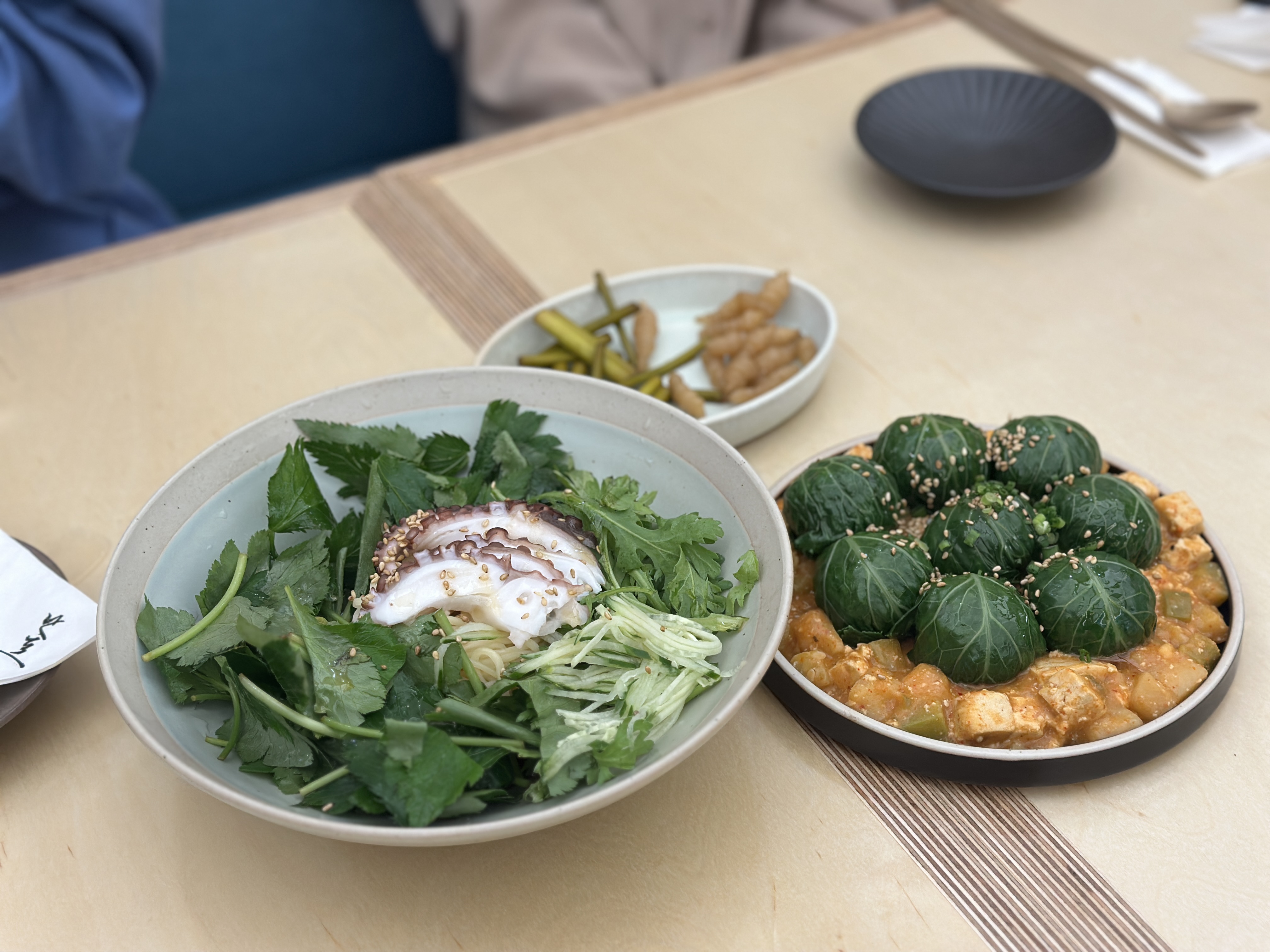 주문은 빠르게 자리에서 QR로 한 것 같습니다. ㅋㅋㅋ 3명이서 갔으니 빠르게 미리 생각해둔 메뉴로 주문완료! 강된장쌈밥, 돌문어간장국수, 전복들깨국수, 새우감자전입니다.