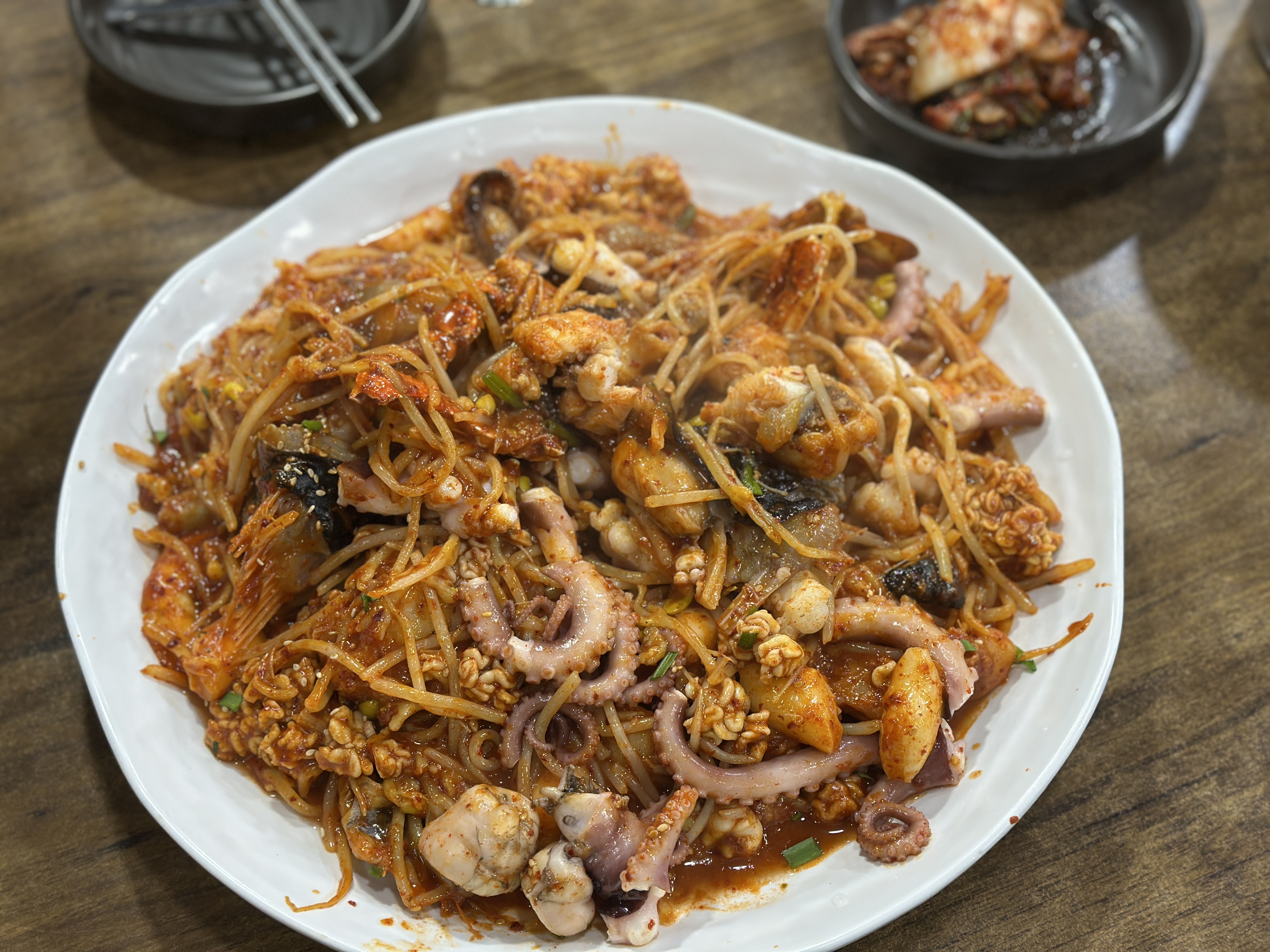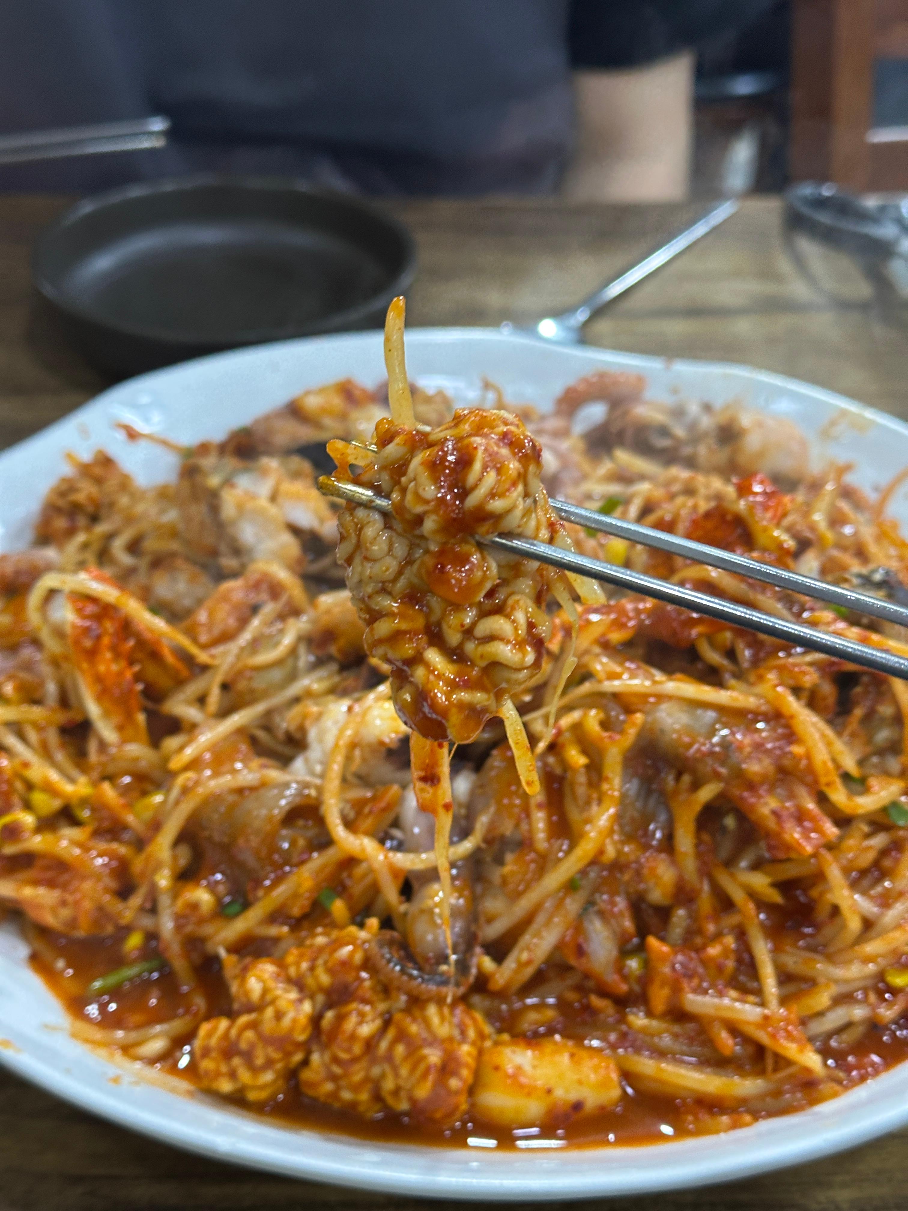 그냥 푸짐만 한 게 아니고, 내용물도 상당합니다. 아낌없이 해물 야채를 넣은 모습입니다. 배가 터질 뻔 했어요. 둘이 먹기엔 저희 부부 기준으론 많습니다.
