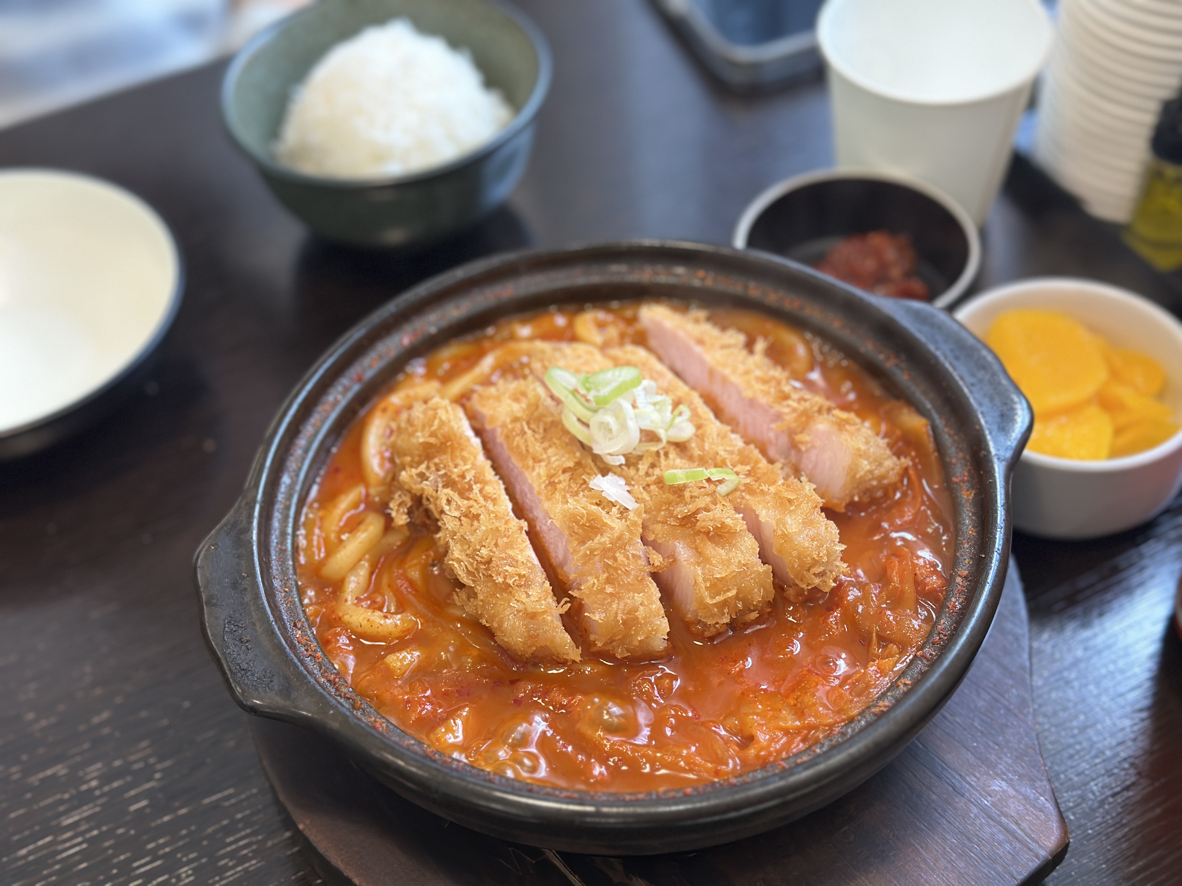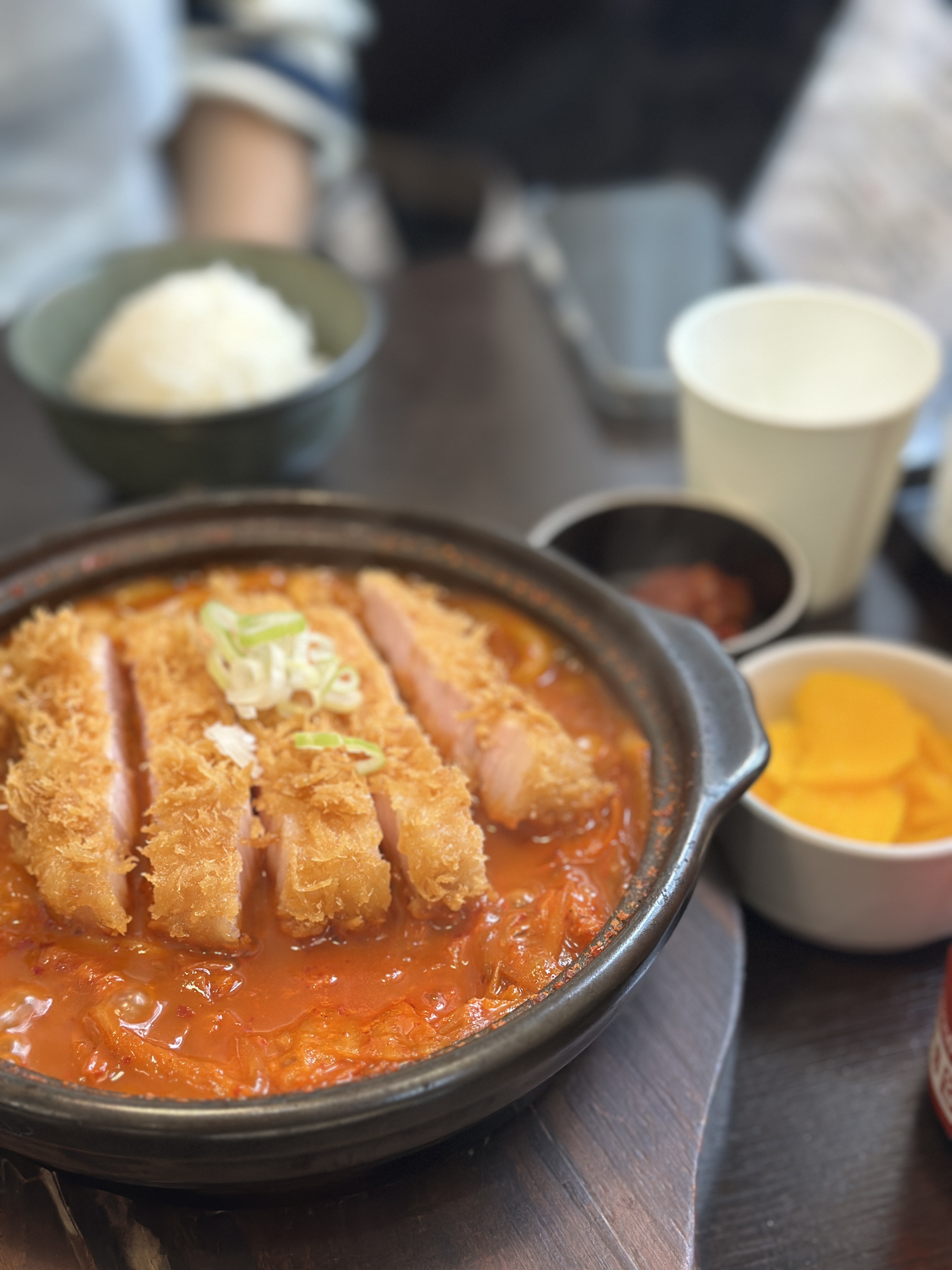희희카츠의 김치나베입니다. 뚝배기 그릇에 자작자작 끓여지는 맛있는 나베와 그 위에 얹어진 돈카츠 한덩이 ㅋㅋㅋ 맛있어요.매콤달콤한 것이 참 매력적입니다.
