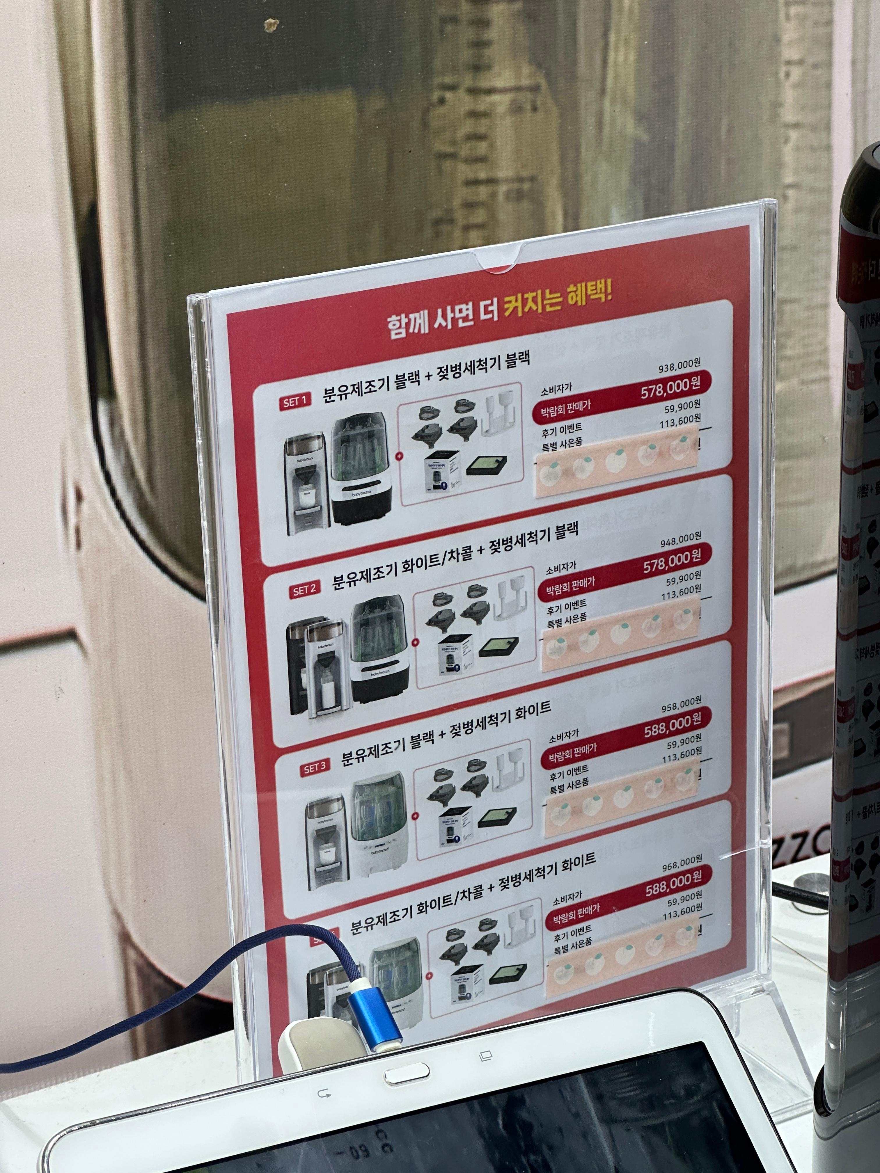베이비브레짜는 임신 후에 알게된 브랜드입니다. ㅋㅋㅋ 젖병세척기도 있고, 분유제조기도 있네요 ㅋㅋㅋ 너무 편리해 보였습니다. ㅋㅋ 베이비페어 특별세일도 진행하고 있었어요 ㅎㅎ 친절한 설명 좋았습니다. ㅋㅋ