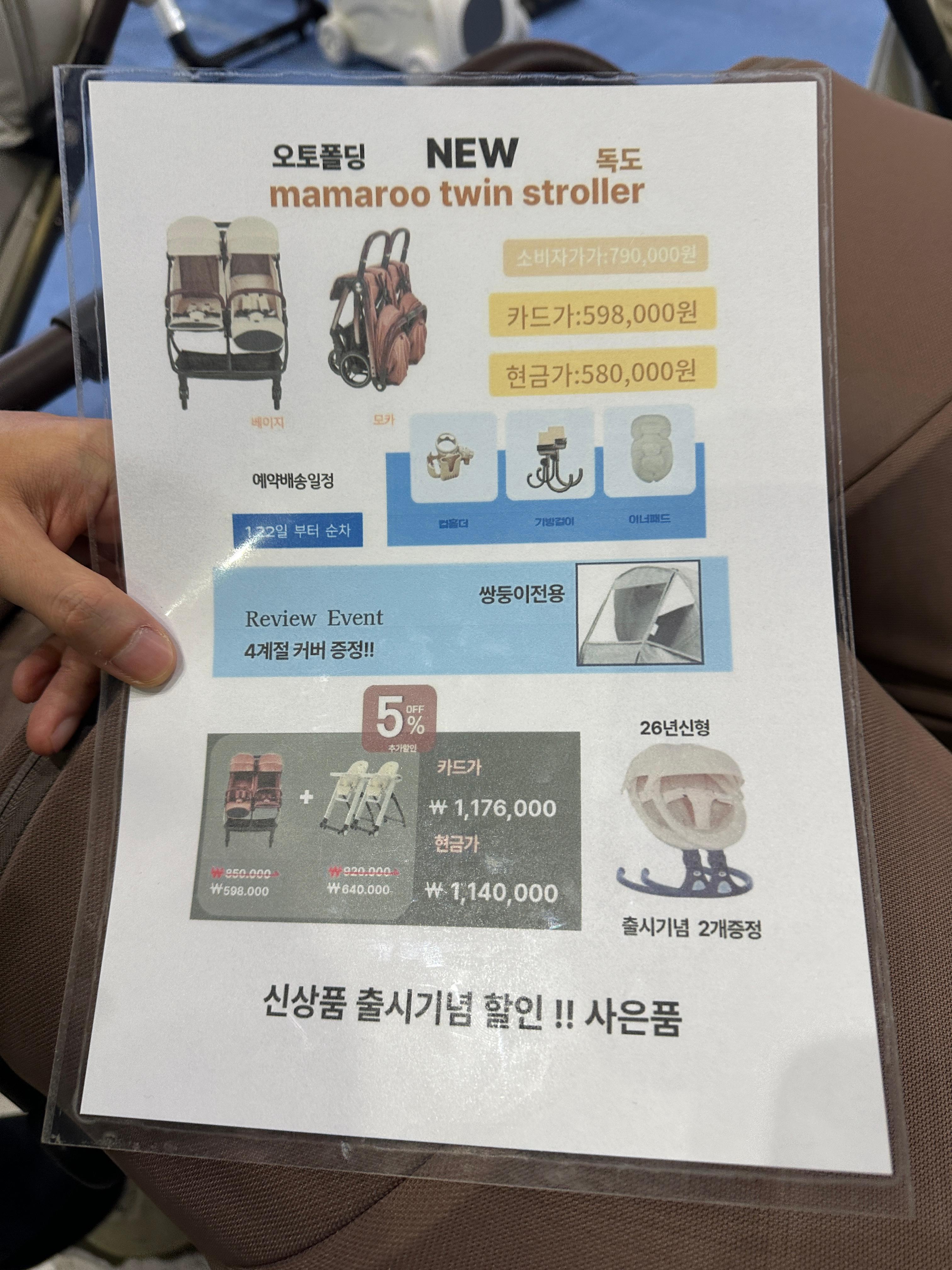 마마루라는 브랜드를 처음 알게 됐습니다. 코베 베이비페어 유아교육전에서는 사실 쌍둥이 유모차를 찾기가 어려웠습니다. 아무래도 다태아보다는 단태아가 많기 때문이겠죠?ㅋㅋ 그런데 마마루에서는 신상품으로 쌍둥이유모차를 세팅해두고 있었어요. 원터치로 접고 펴는 것도 매력적이고, 튼튼한 본체와 핸들링 모두 좋았습니다. 출시기념으로 다양한 프로모션도 진행했네요.