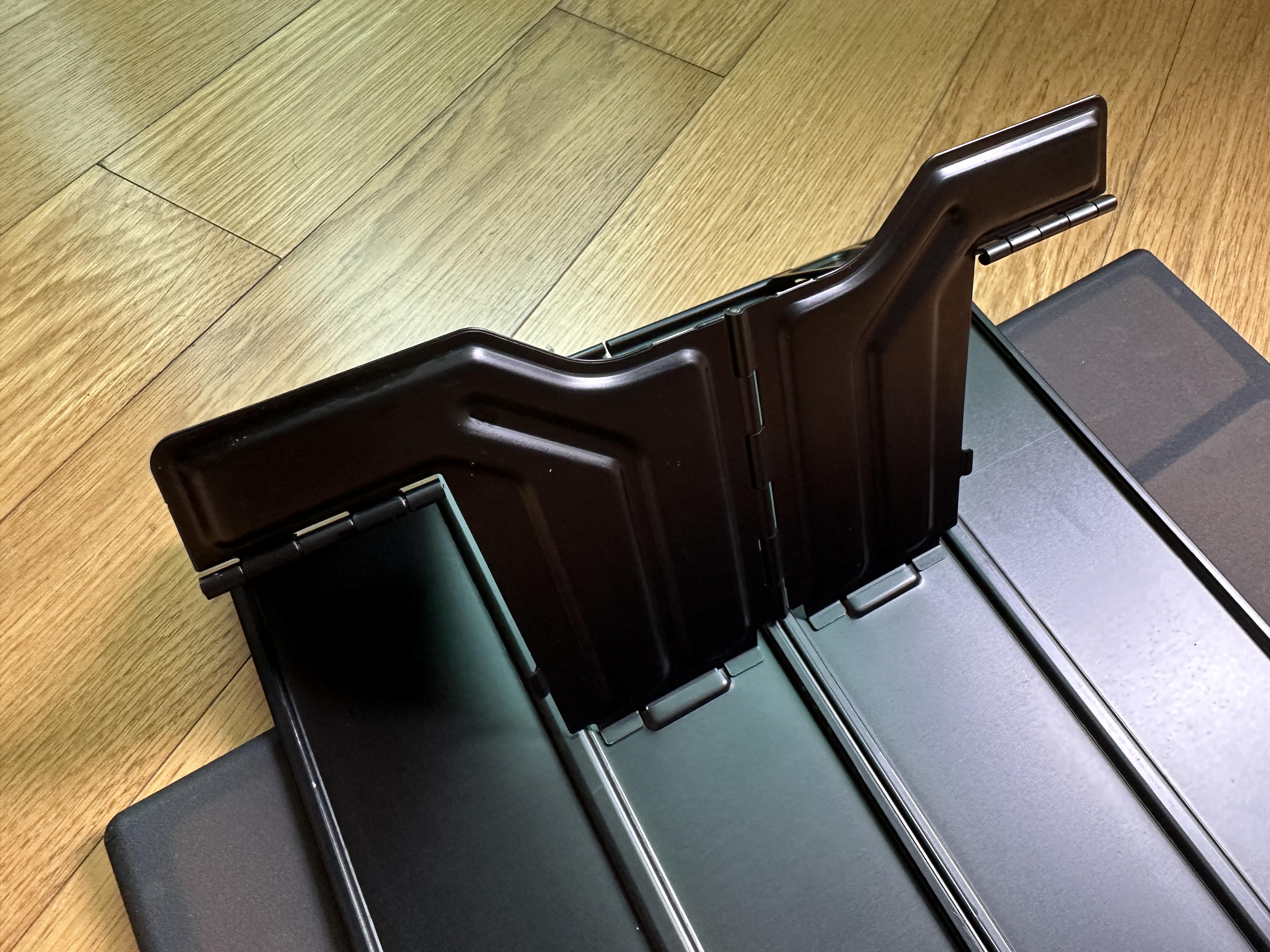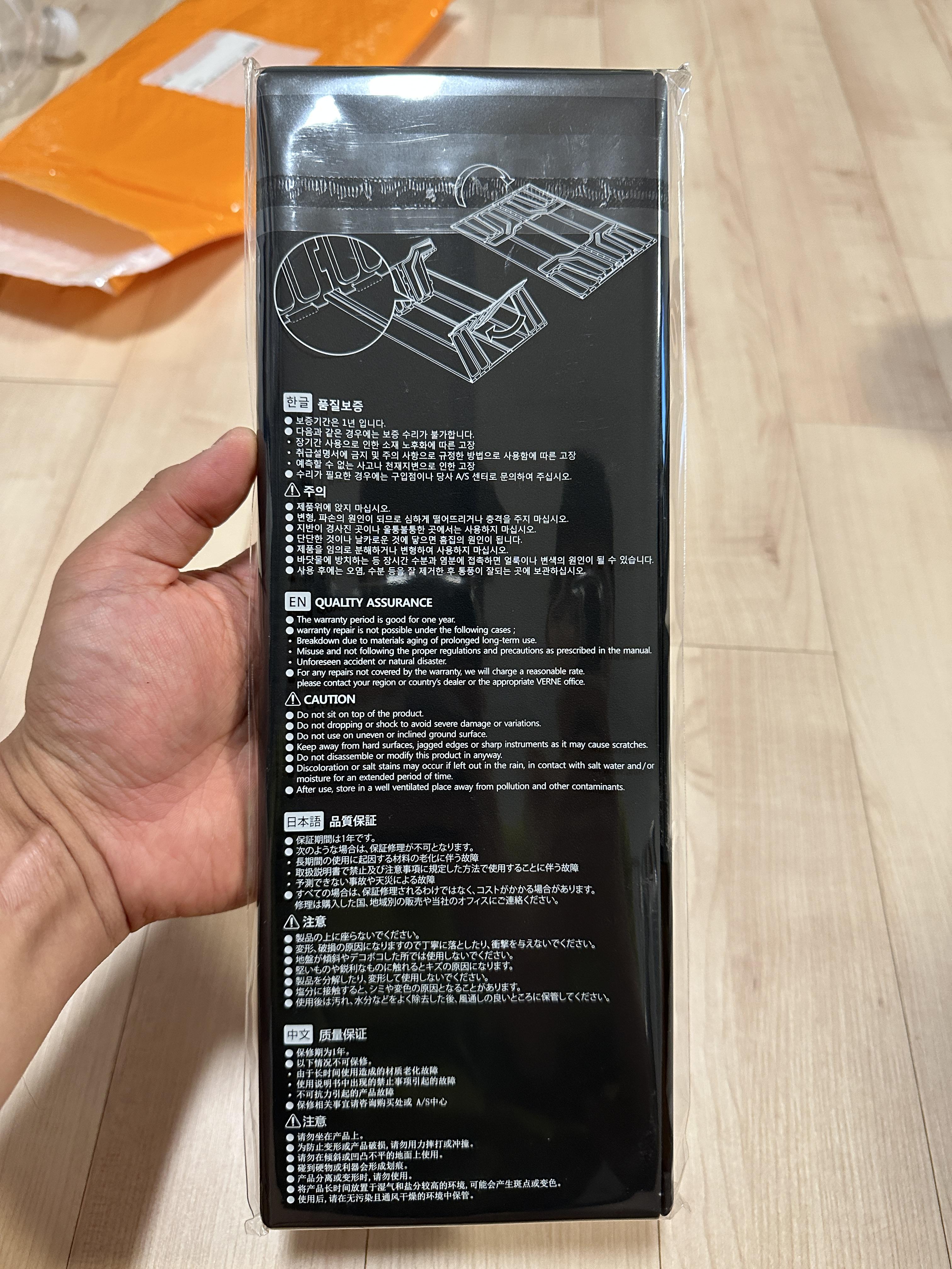 일단 반으로 접혀있어서 긴 몸체를 한 번 열어봅니다. 왼쪽의 사진처럼 열리는데요, 그 안에 접혀있는 부분을 펴게 되면 오른쪽의 사진처럼 펴집니다. 바닥쪽(안쪽) 역시 같은 도장으로 되어있는 것 같습니다.