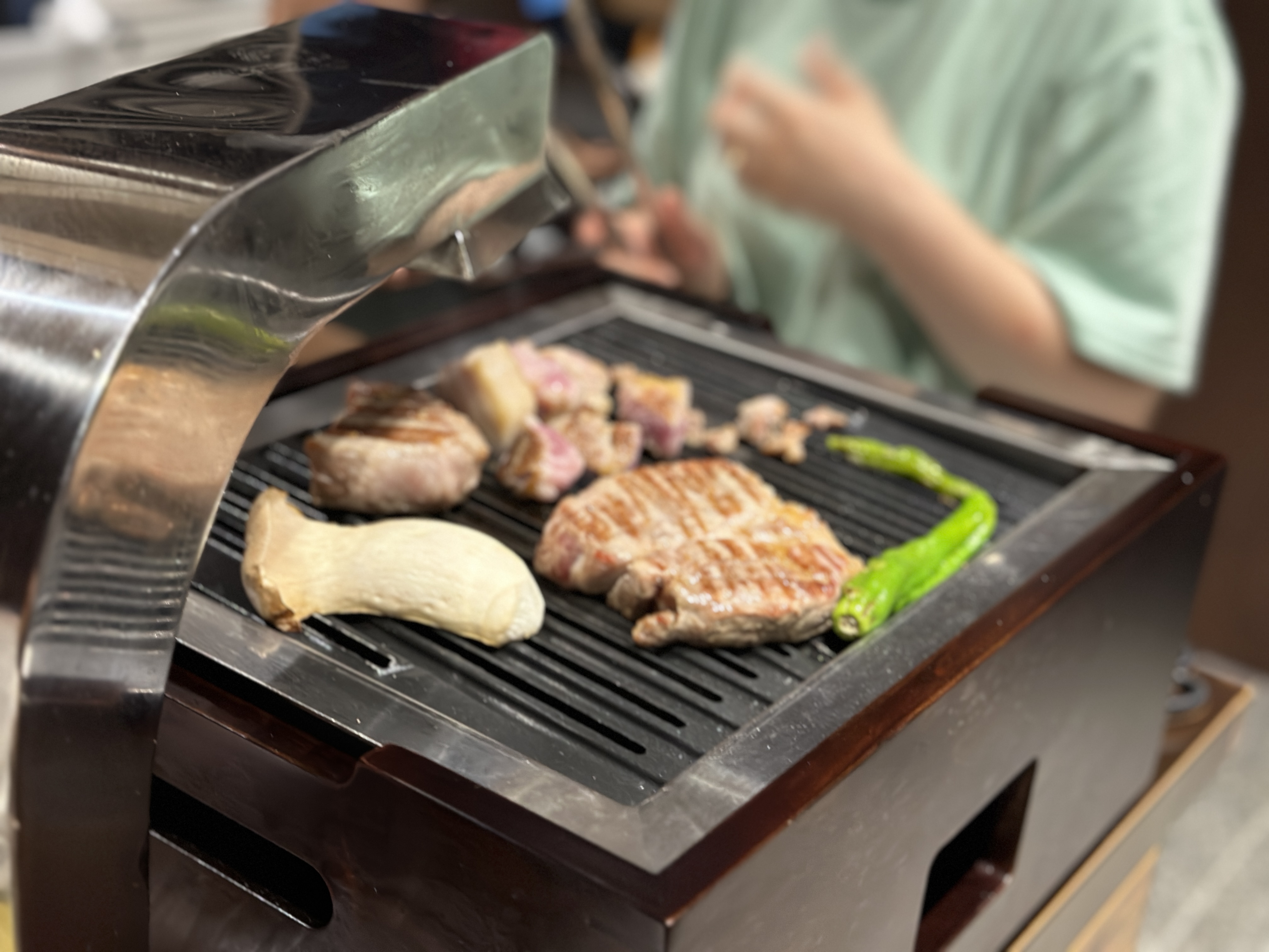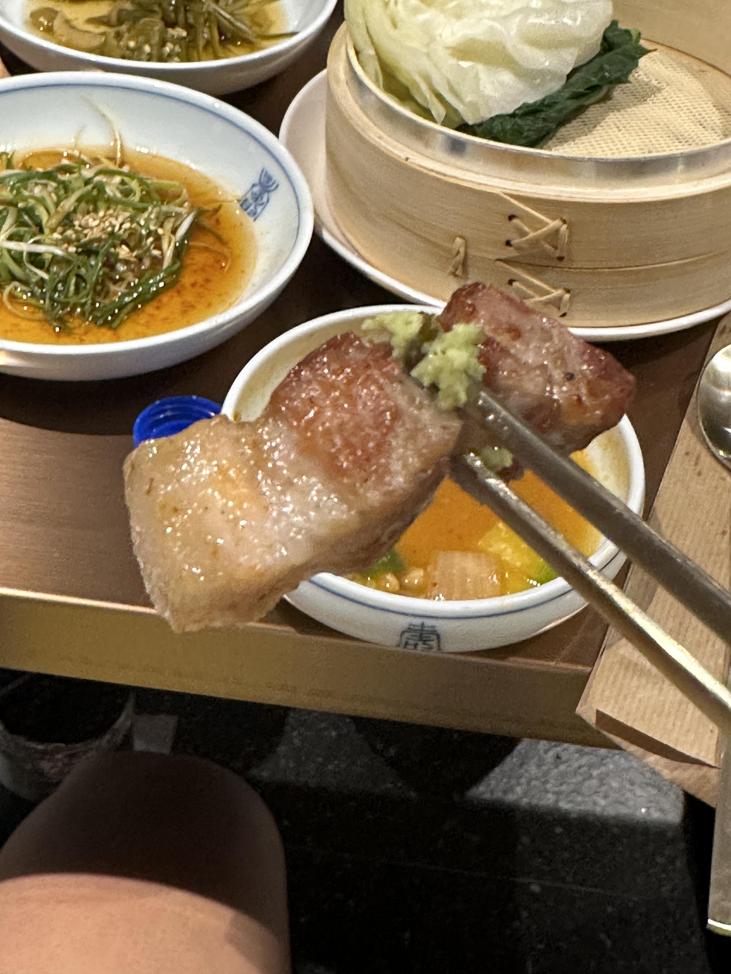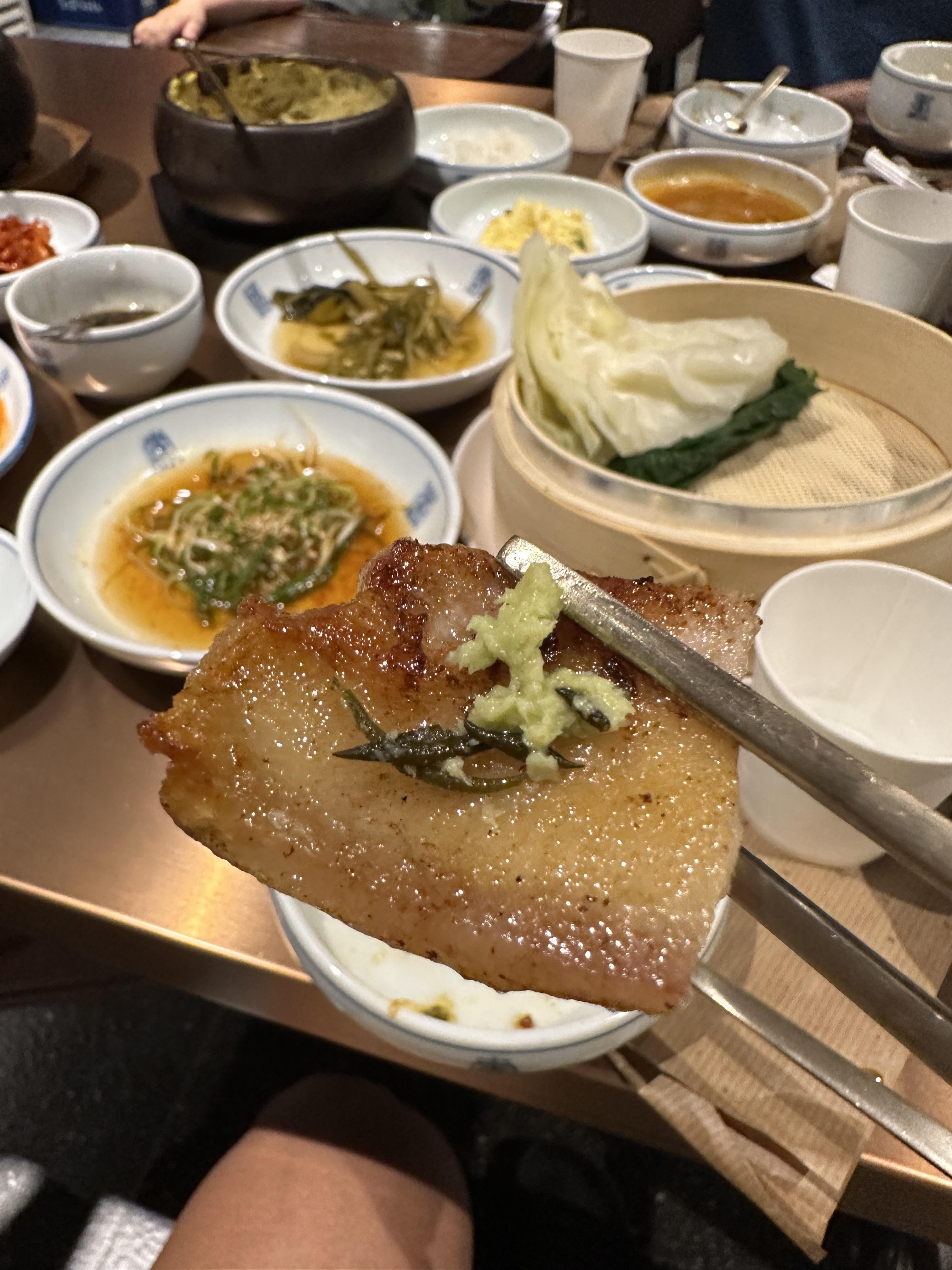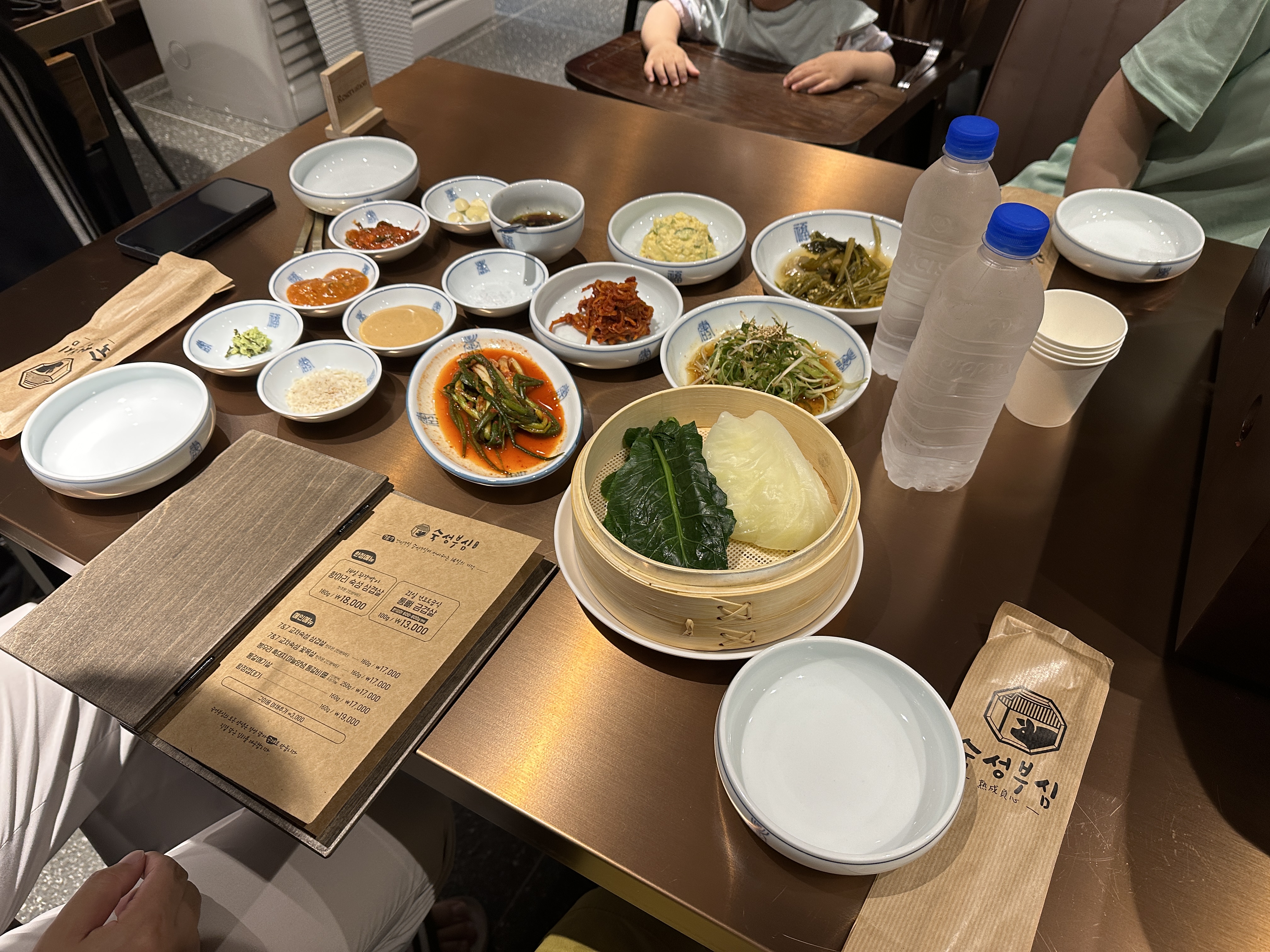 특이한 것 하나 더 있는 것이, 바로 채소입니다. 상추나 깻잎을 생으로 주는 식당들이 대부분인데, 군자역 숙성부심 은 편백찜에 살짝 익혀서 나옵니다. 이 부분이 생각보다 괜찮더라구요. 익힌 양배추 같은 경우는 아이 먹이기도 좋고요