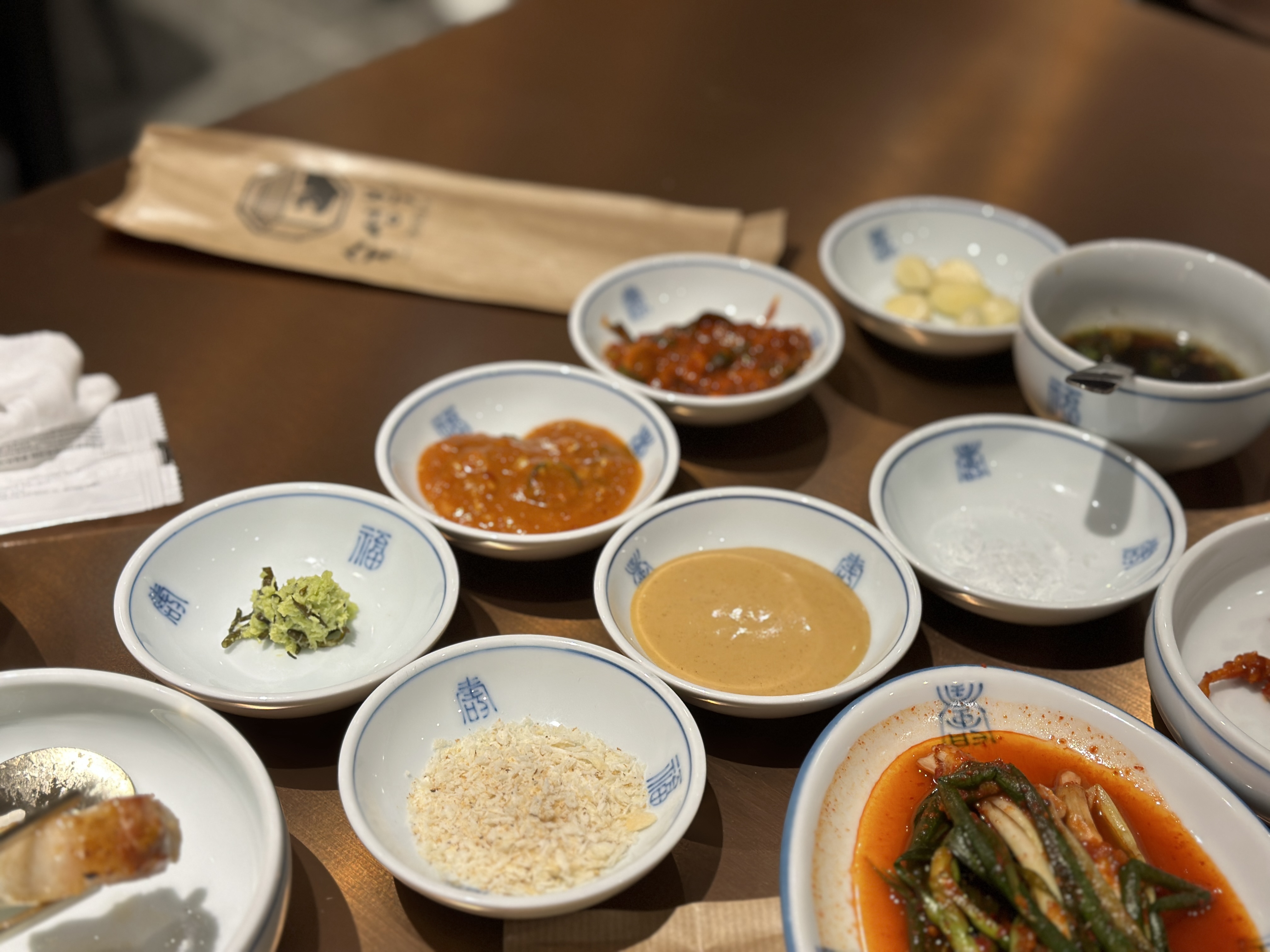 기본 세팅도 꽤나 푸짐합니다. 파채무침, 파김치, 감자샐러드 등등 기본 찬도 훌륭하며, 소스류도 꽤 많습니다.