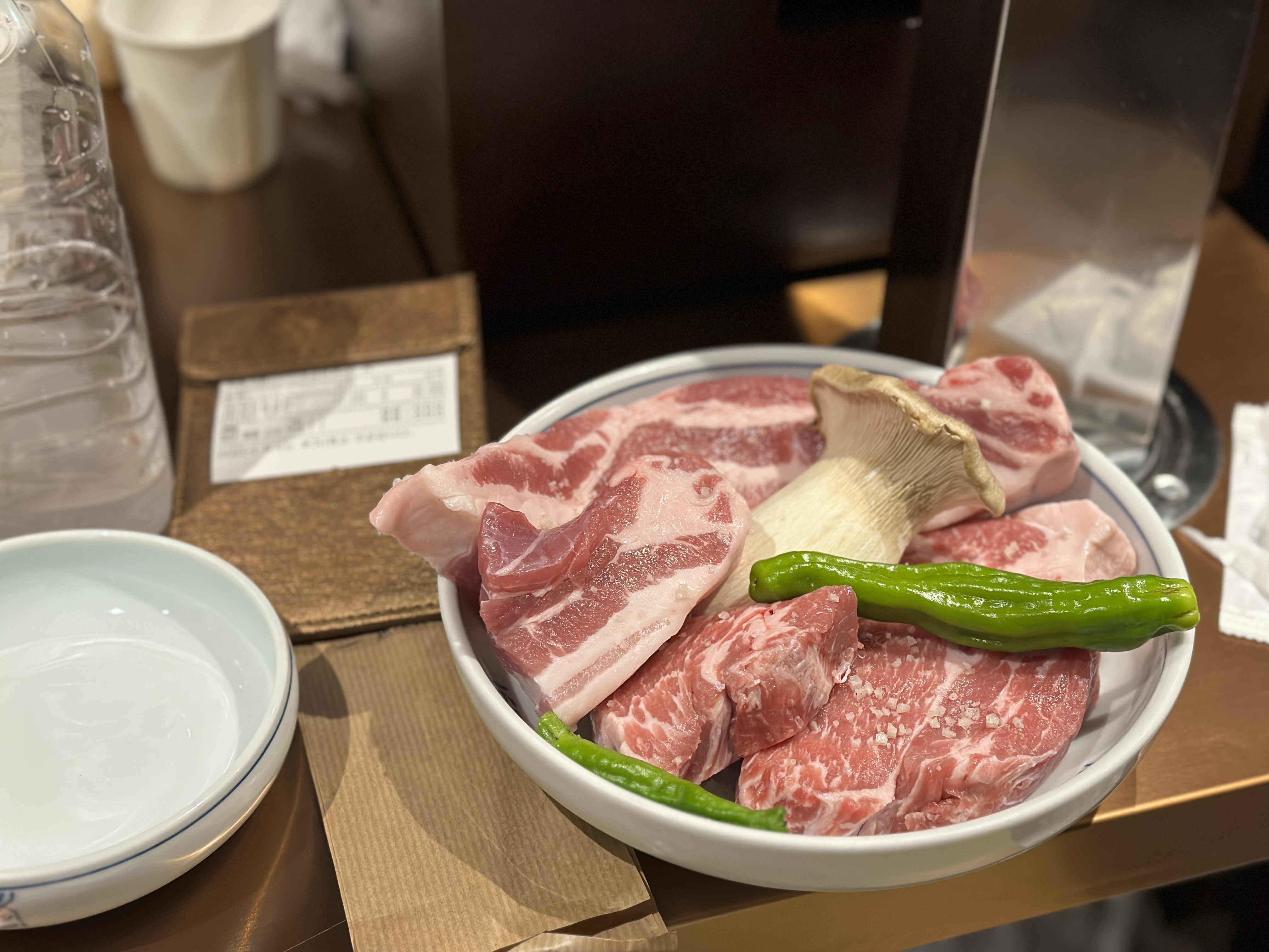 깔끔하게 등장하는 목살과 삼겹살 각 2인분입니다. 도합 4인분이죠. 버섯과 꽈리꼬추가 함께 나옵니다. (조금 더 주면 좋을텐데 ㅋㅋㅋ) 살짝 보아도 고기의 질이 꽤 좋아 보입니다. +_+