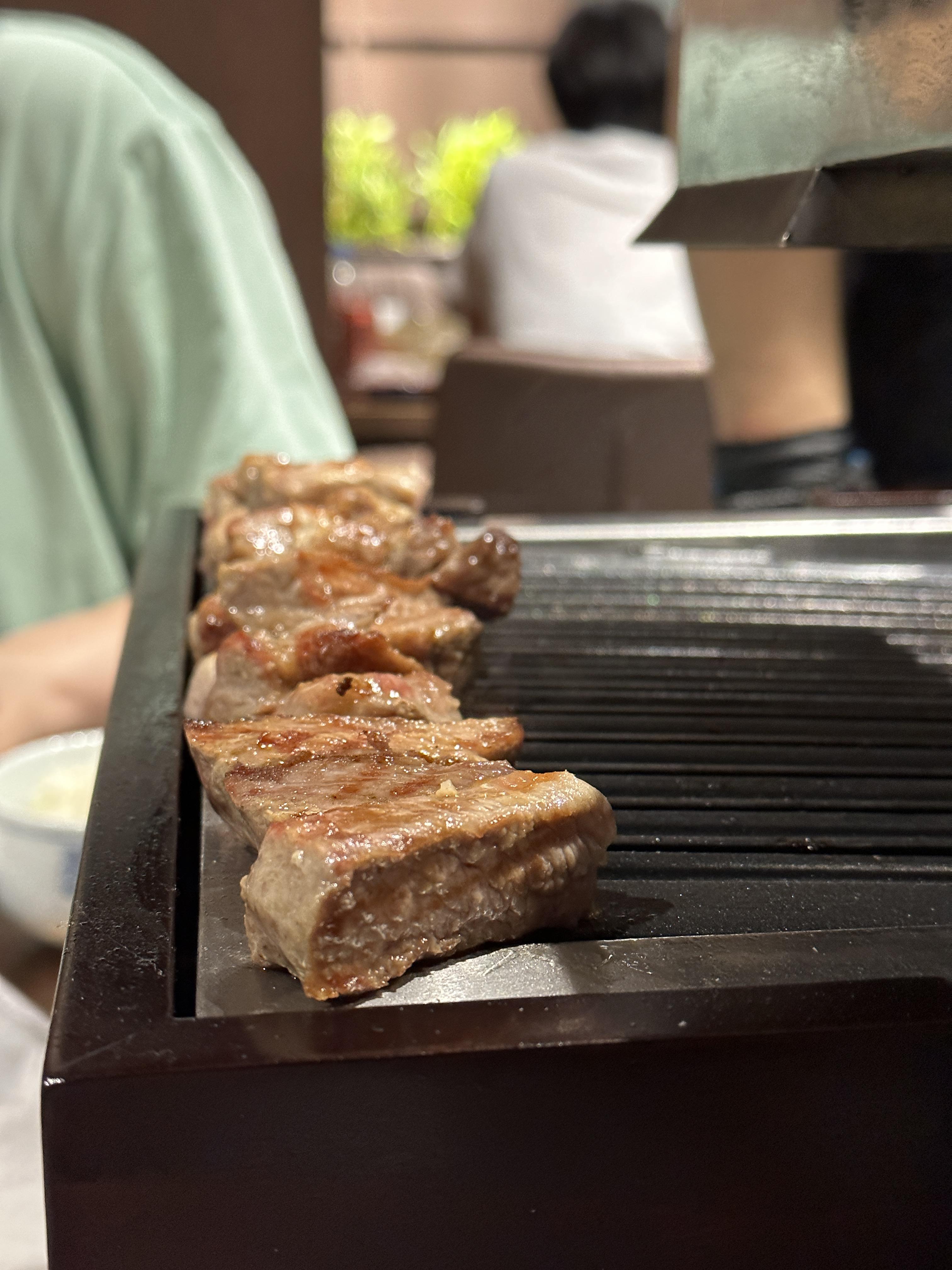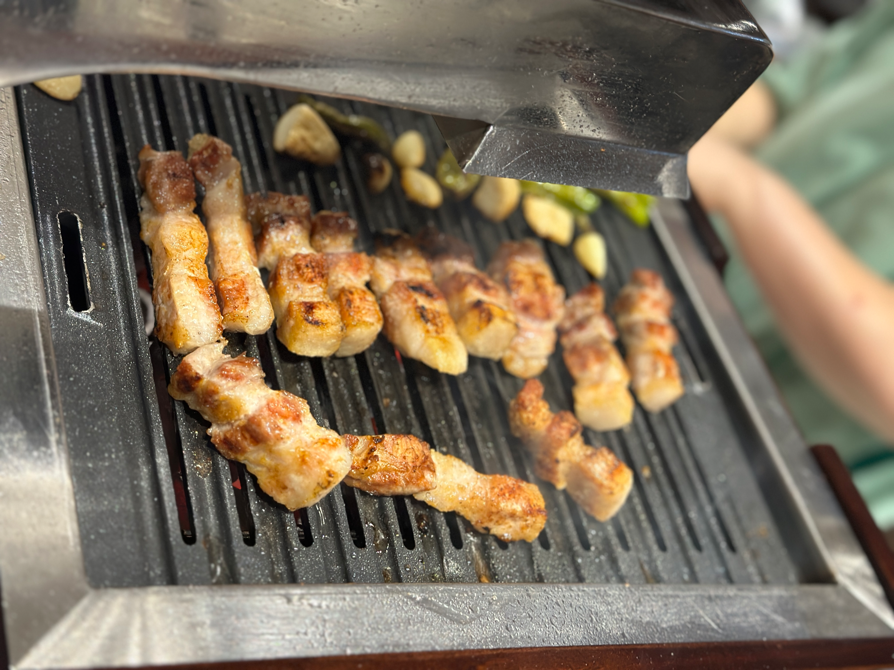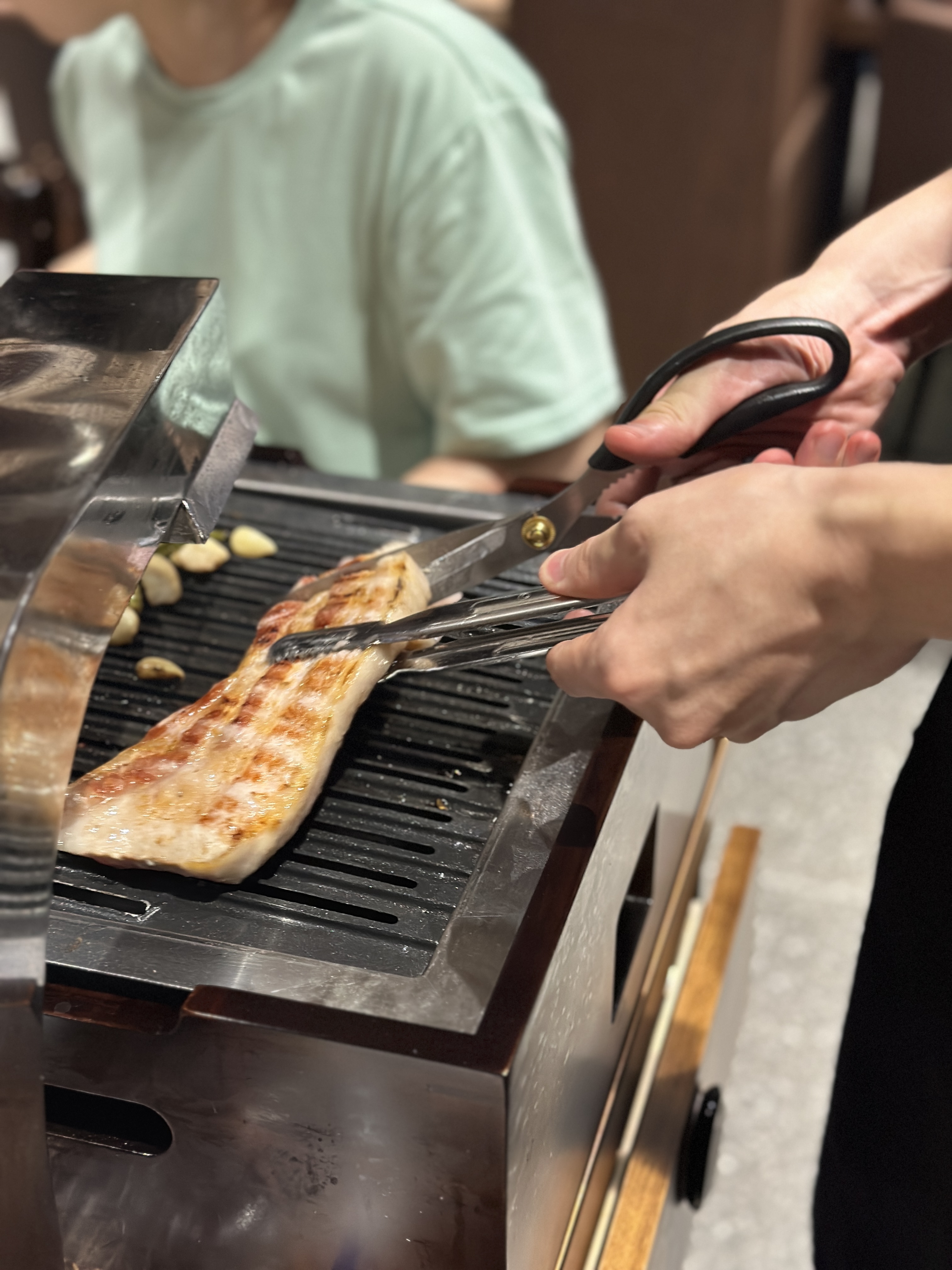 삼겹살도 목살이 다 구워지고 나니 바로 구워주시기 시작합니다. 진짜 숯불에 익히는 고기는 언제 먹더라도 맛이 좋아요. ㅠㅠ 삼겹살도 소금과 와사비를 먹어봅니다. ㅋㅋㅋ 쫄깃쫄깃합니다. +_+
