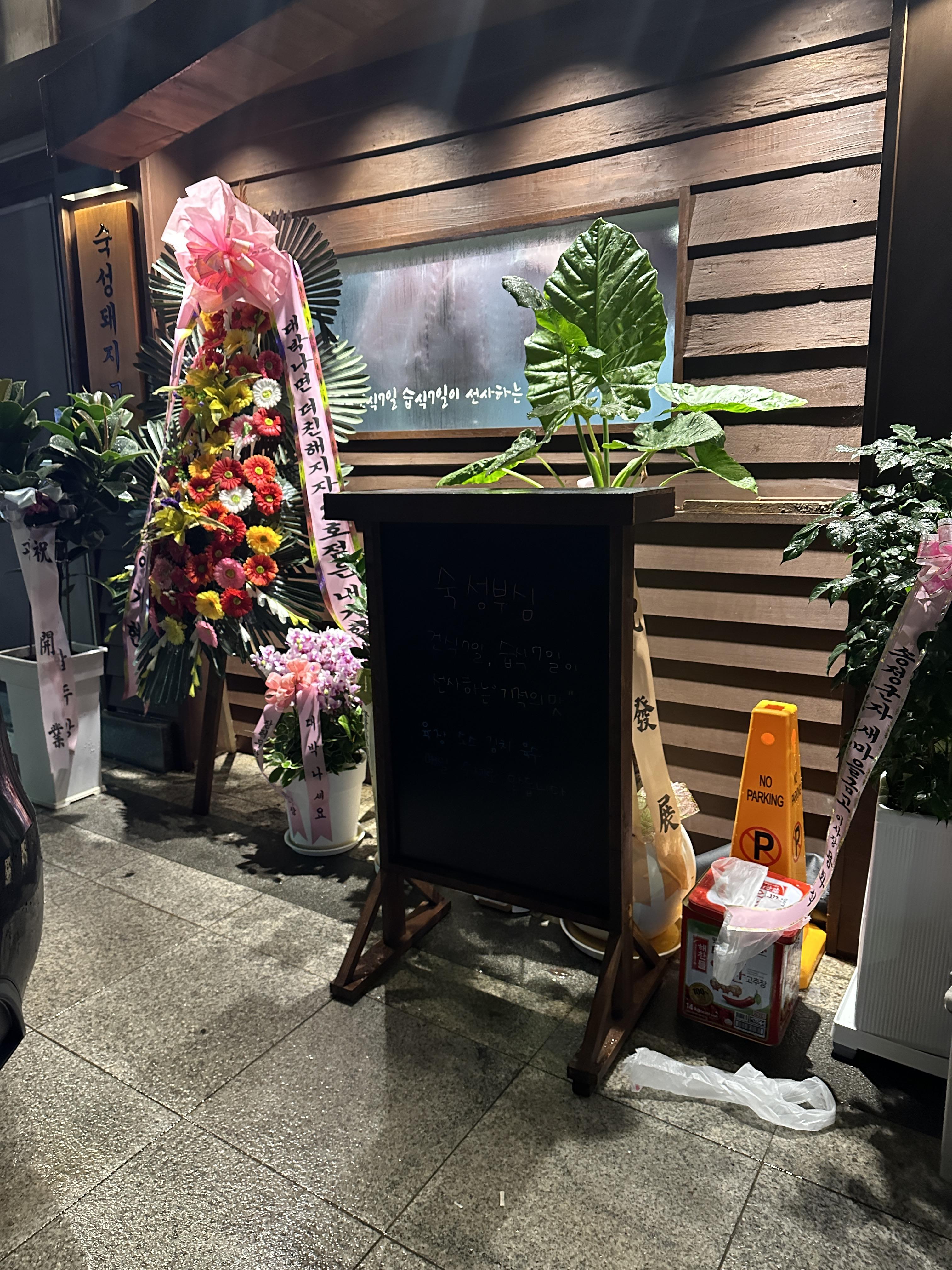 군자역 신상 숙성돼지구이 맛집 숙성부심은 새로 연 식당이니만큼 외관 등은 깔끔함 그 자체입니다. 신장개업 축하 화환들도 가득합니다. 북적북적 손님들도 많았구요. 친구의 예약 덕분에 바로 입장을 합니다.