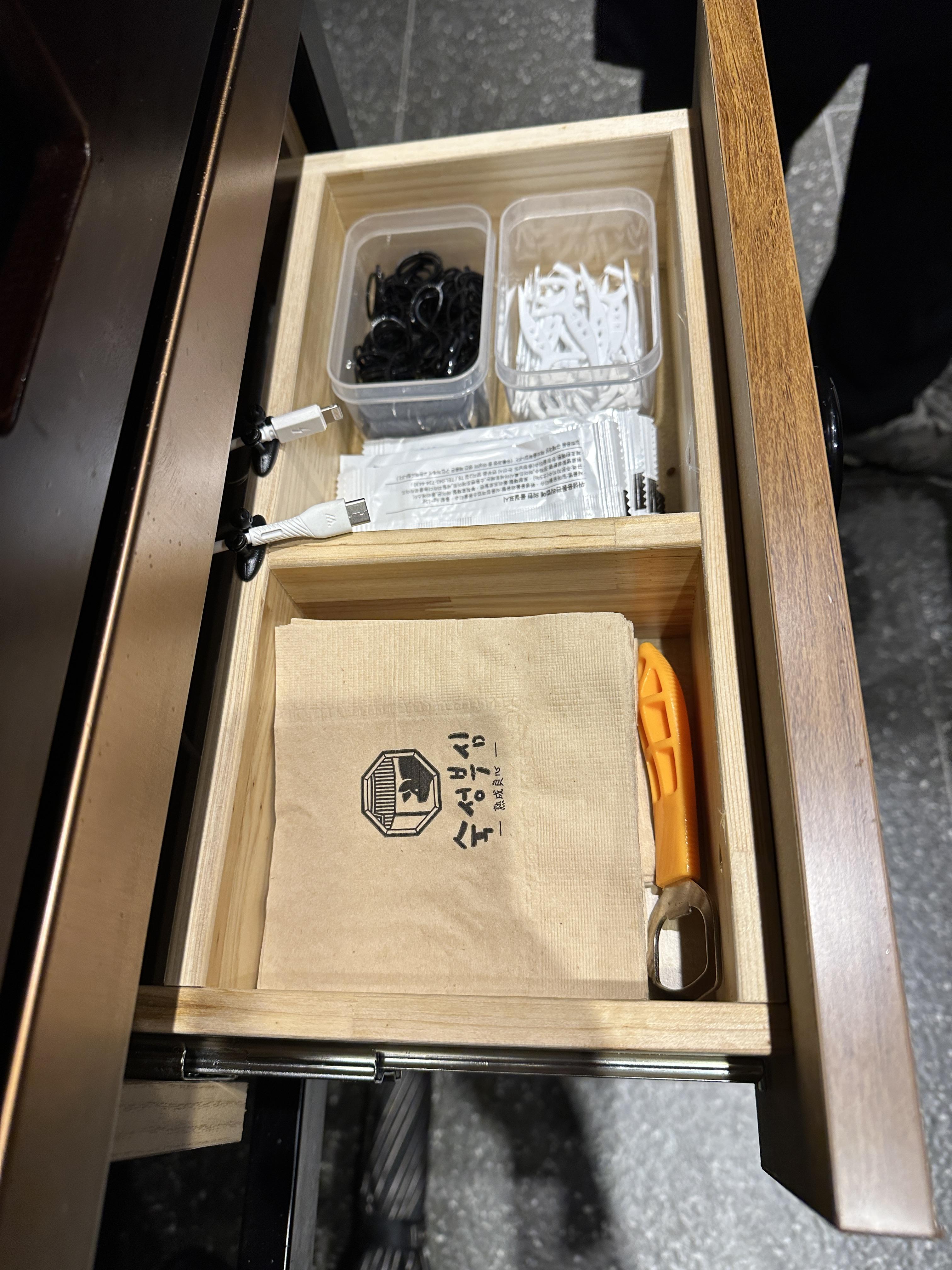 구이판도 숯불구이판인 데다가, 서랍을 여니 이게 무슨일이랍니까... 치실에 머리끈에 물티슈, 심지어 충전기까지 비치되어 있는 게 보이십니까? 아이폰/ 갤럭시 둘 다 충전하시라고 친절하게 두 종류 다 있어요. 테이블 아래를 보니 아예 테이블쪽에서 전선을 뽑아서 깔끔하게 선정리까지 되어있네요? 이건 진짜 먹기도전에 추가점수 파바박 받으실 만 한 센스죠. +_+