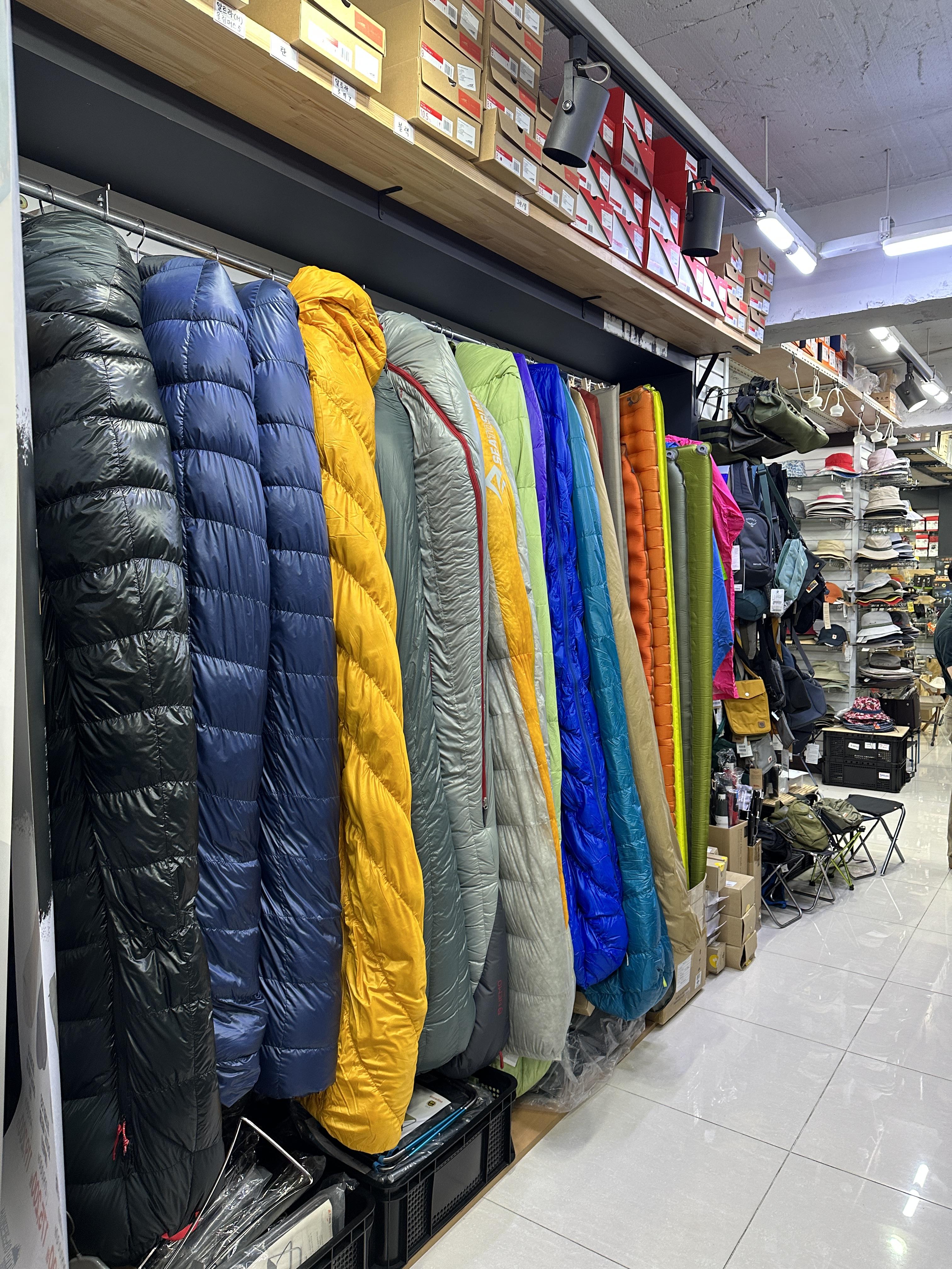 침낭도 전제품이 다 진열되어 있지는 않지만, 어느정도 촉감 및 사용감을 유추할 수 있게 꽤 많은 제품들을 진열해 두었습니다.